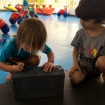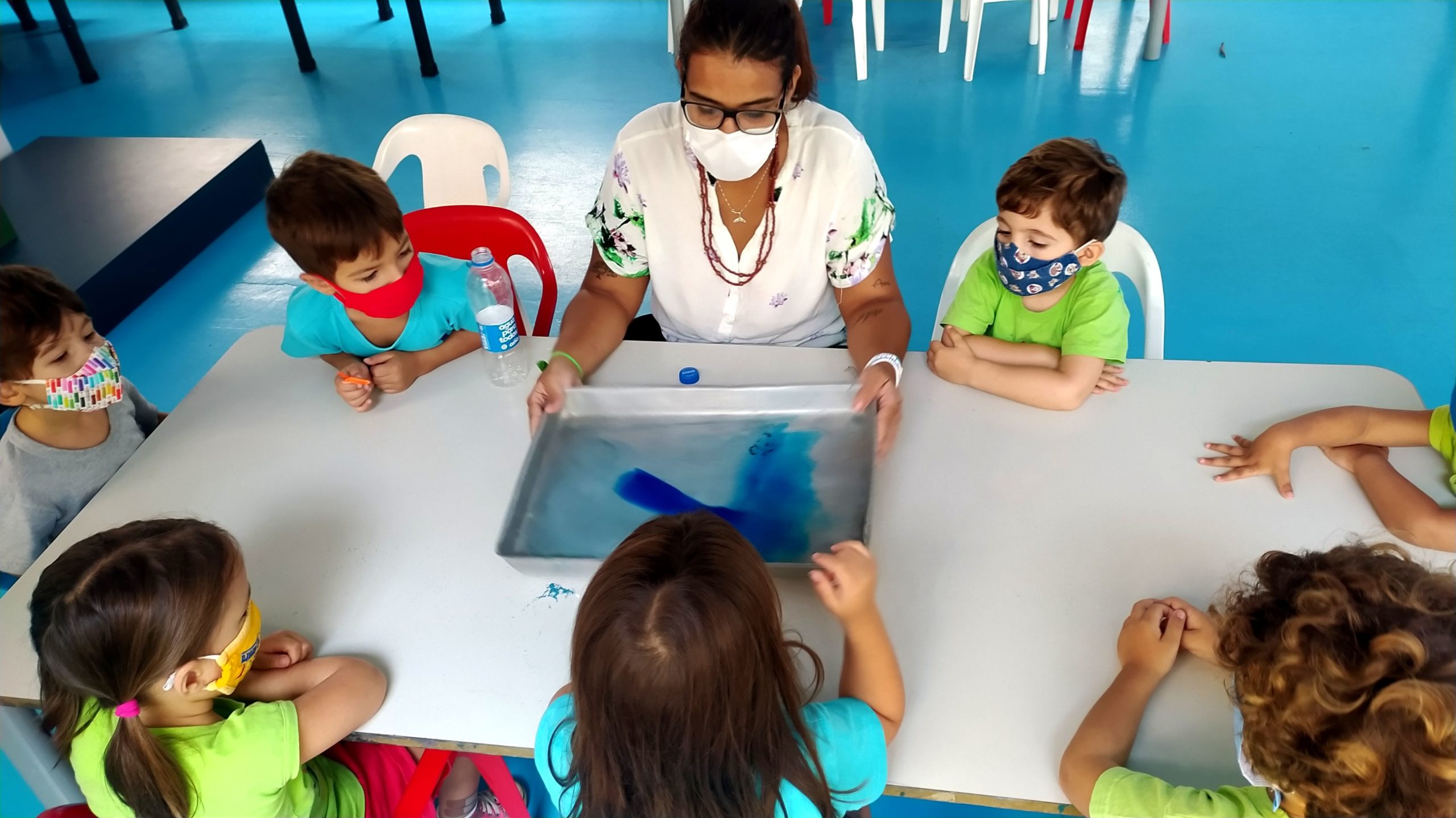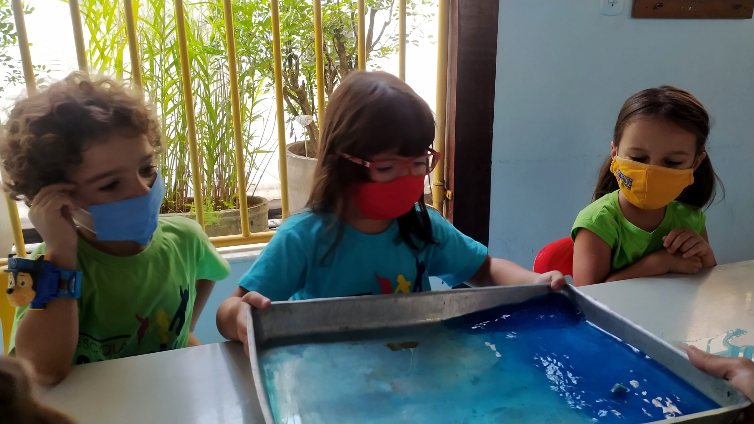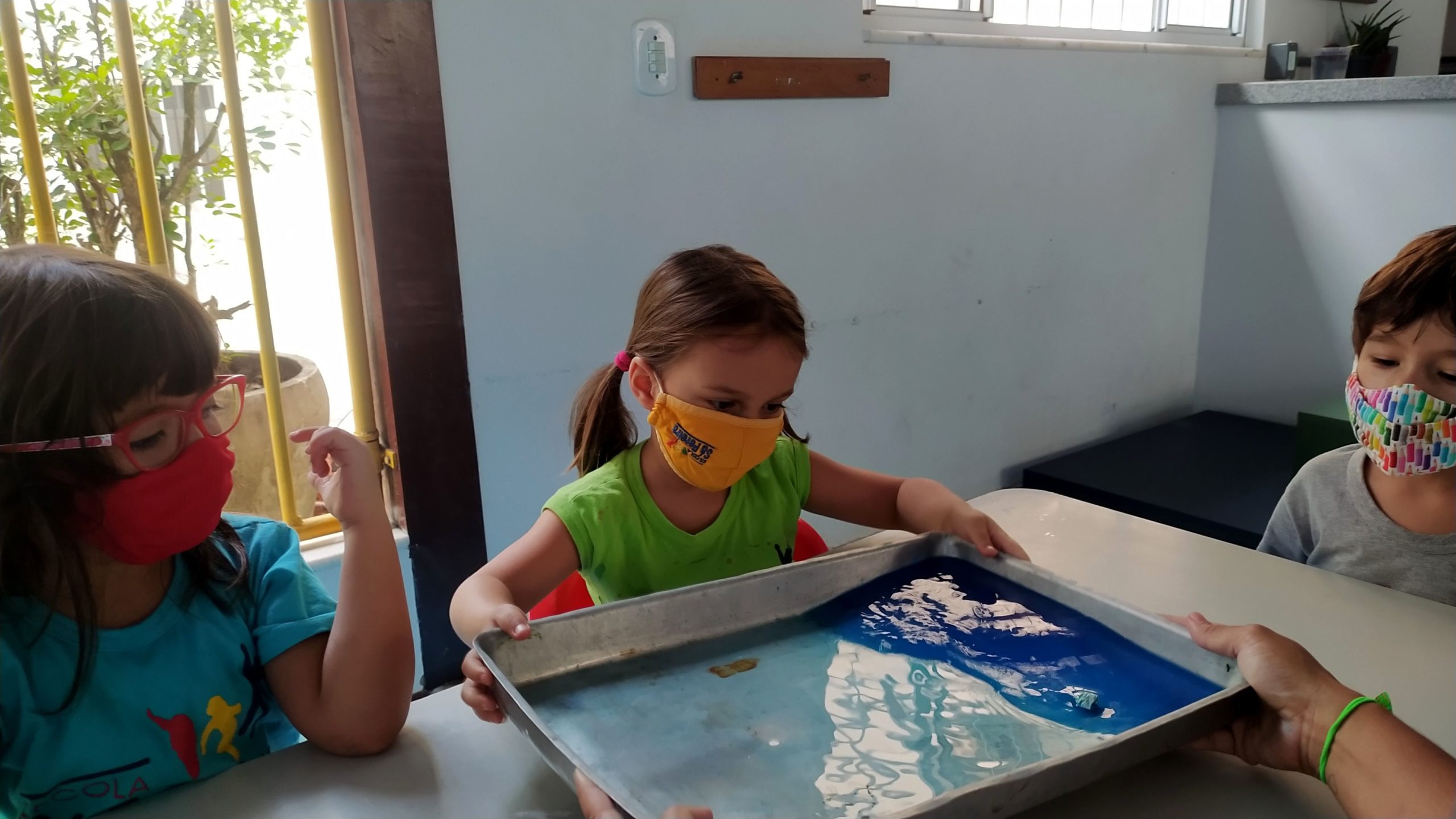Fizemos uma brincadeira divertida e refrescante, que recriou o balanço das ondas. Usamos um tabuleiro com água, bolinha de papel e corante azul, e o objetivo era passar a bolinha de um lado para outro.