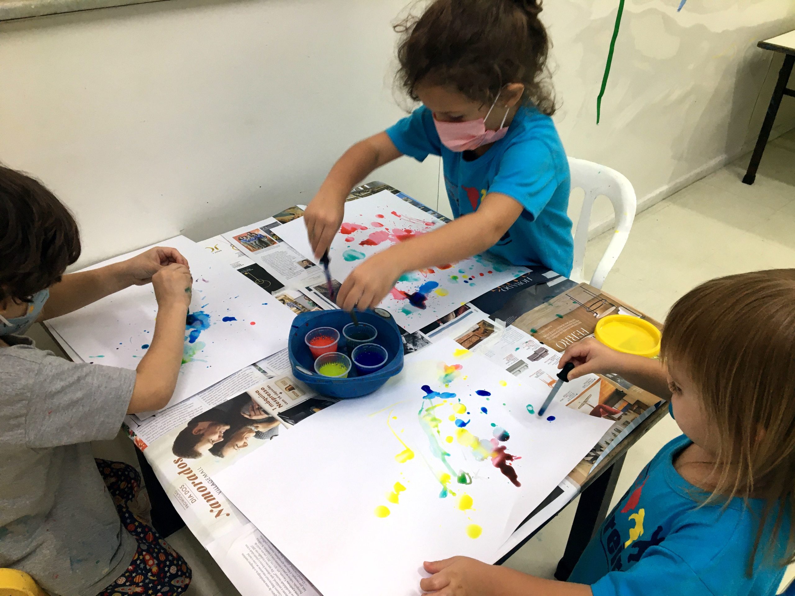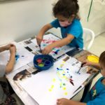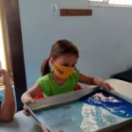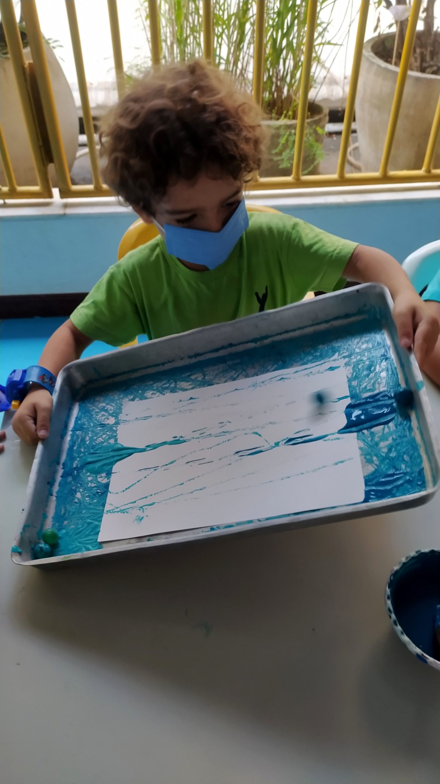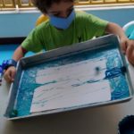 Depois, realizamos uma pintura com diferentes tons de azul, bolinha de gude e papel.
