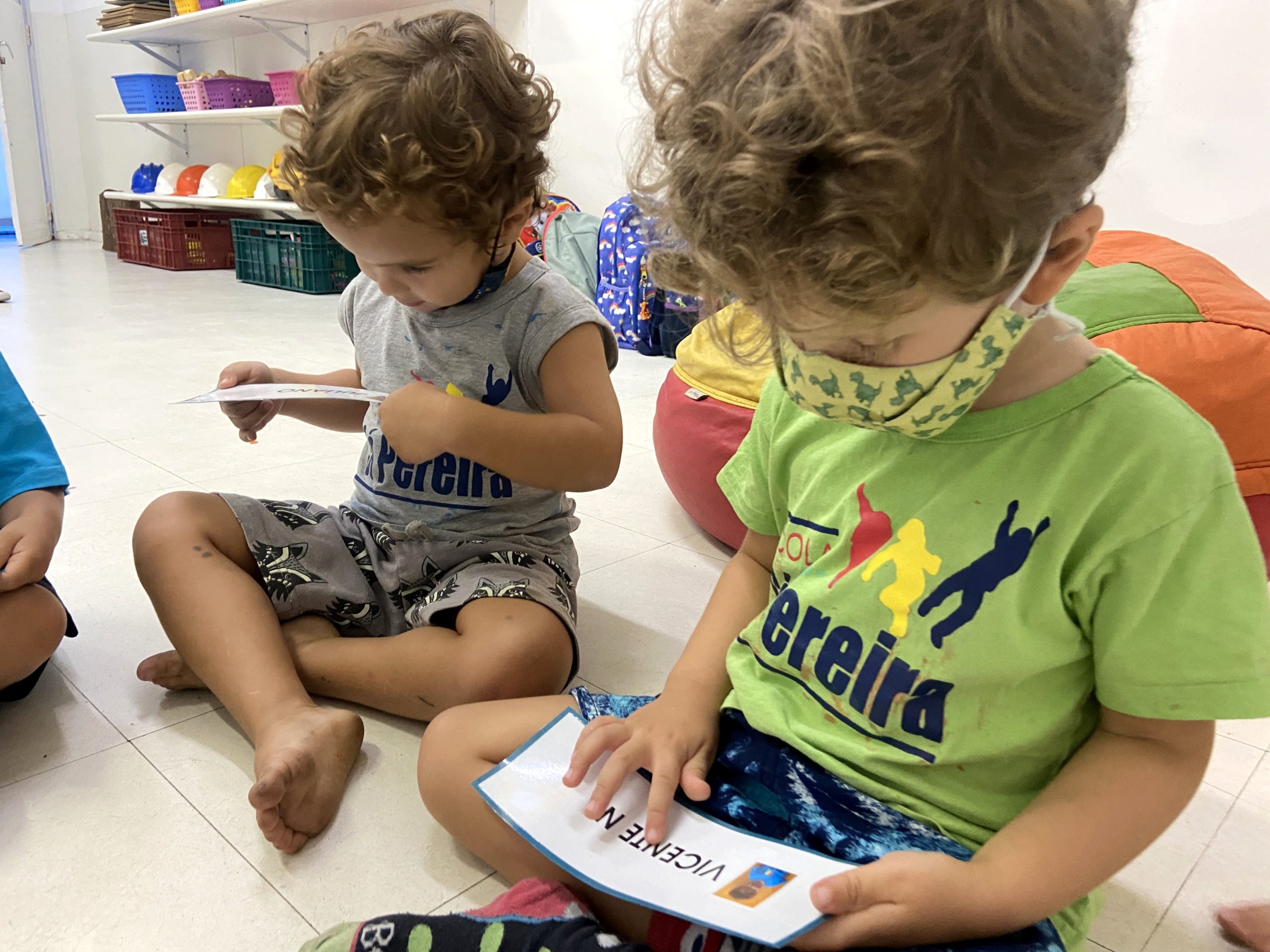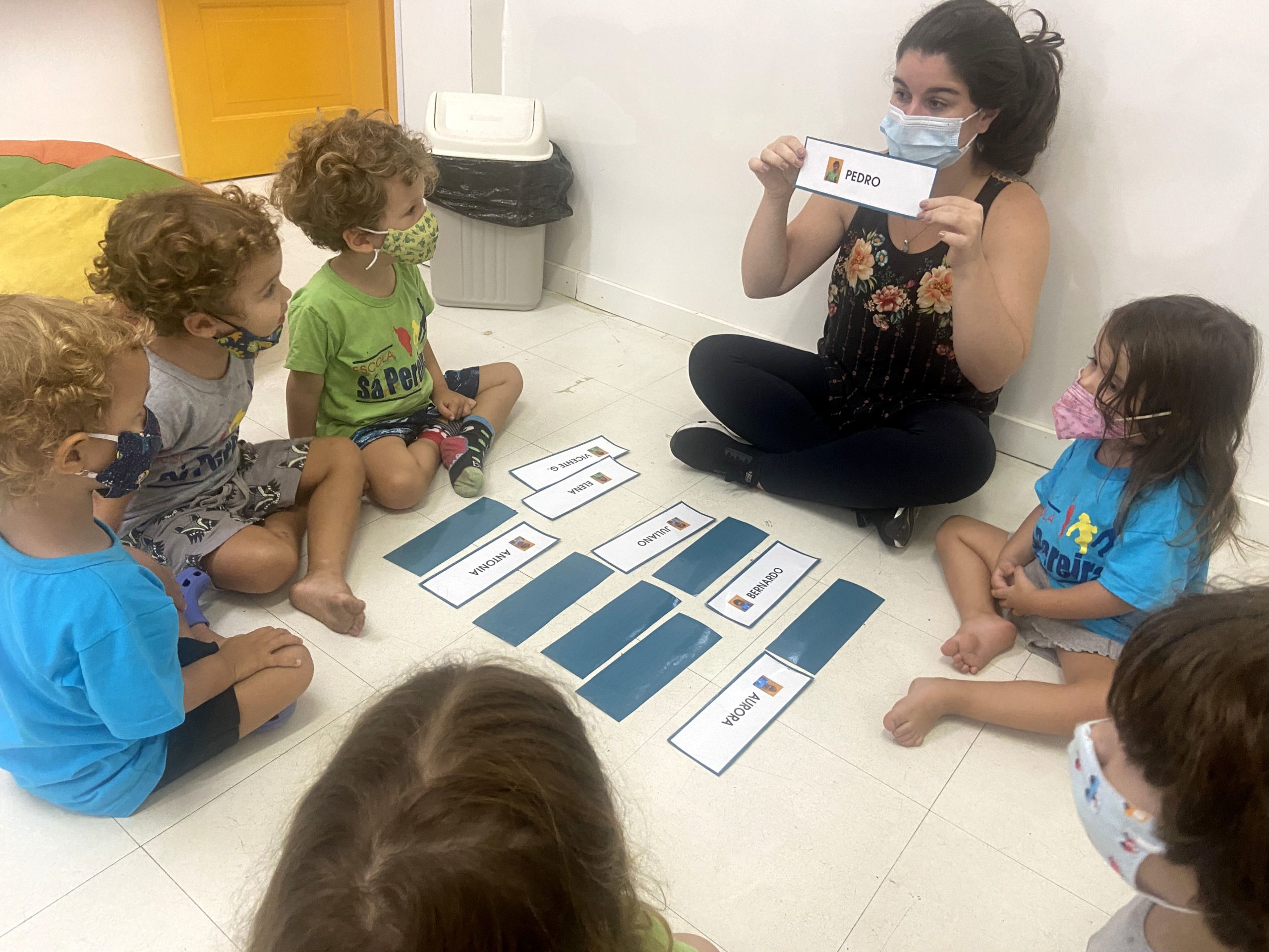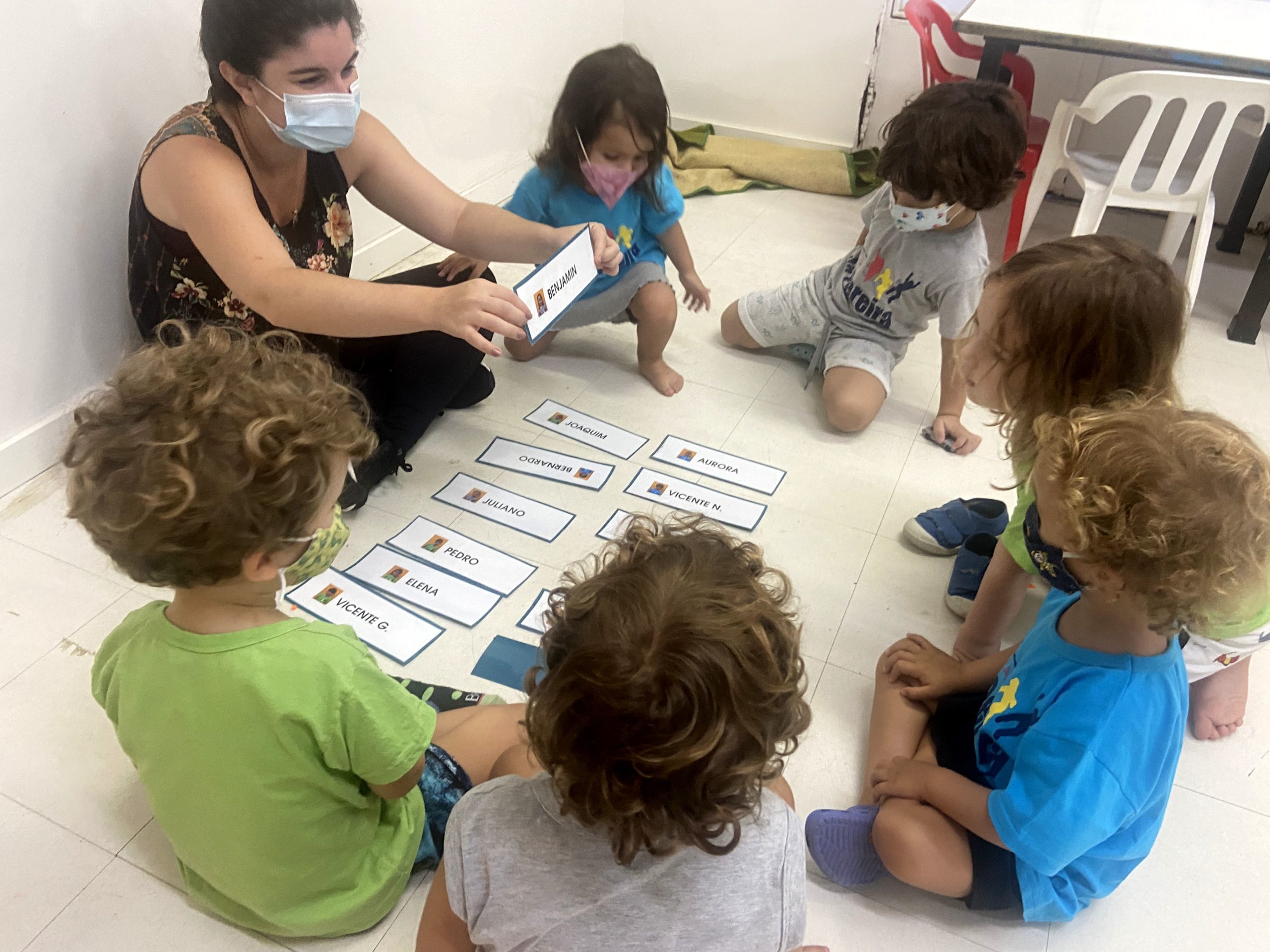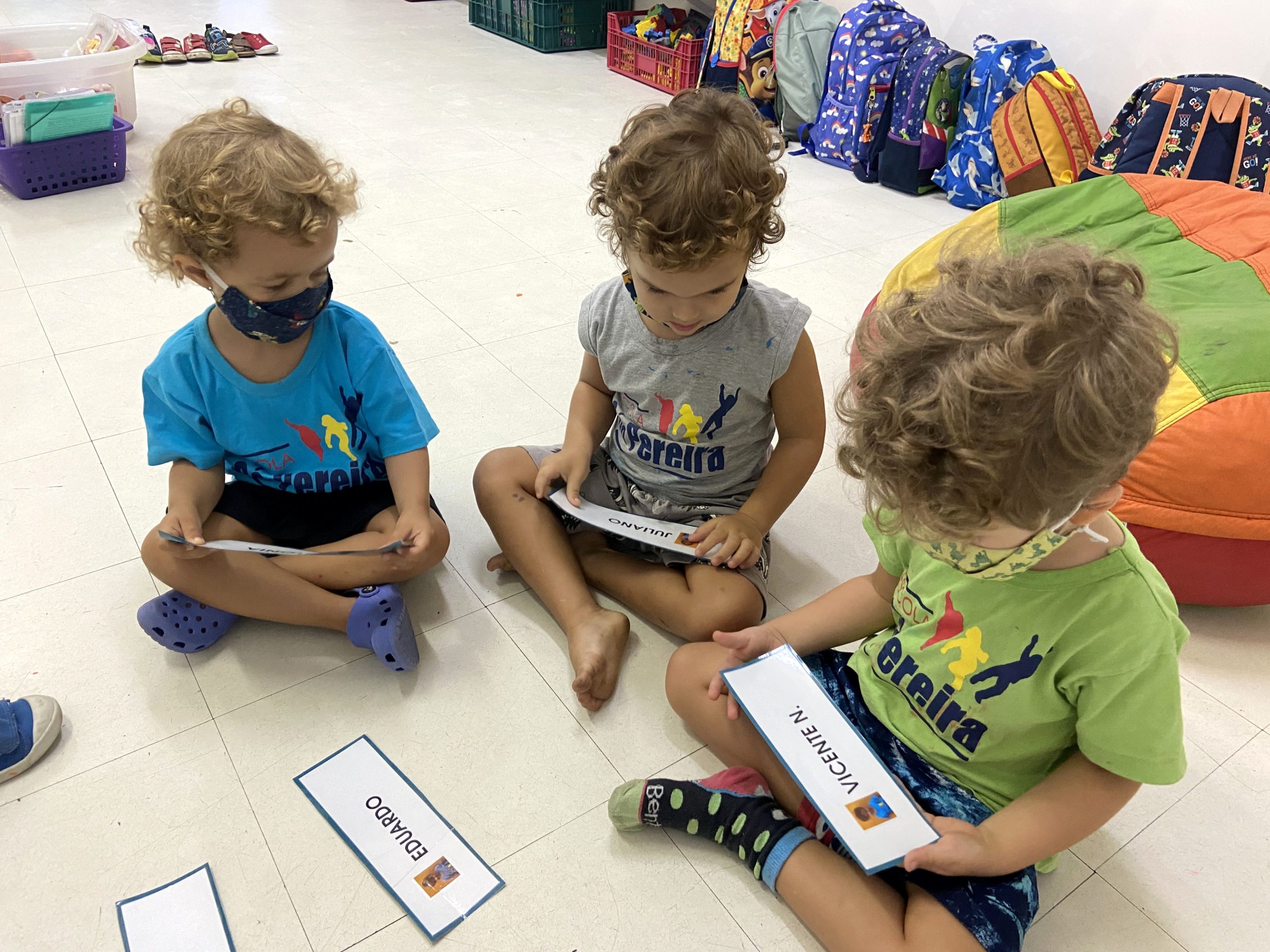 Começamos a explorar também os nomes das crianças da Turma do Botão, utilizando as fichas. Cada ficha contém o nome e a foto da criança, de forma que os pequenos se identificam e identificam os amigos.