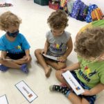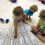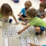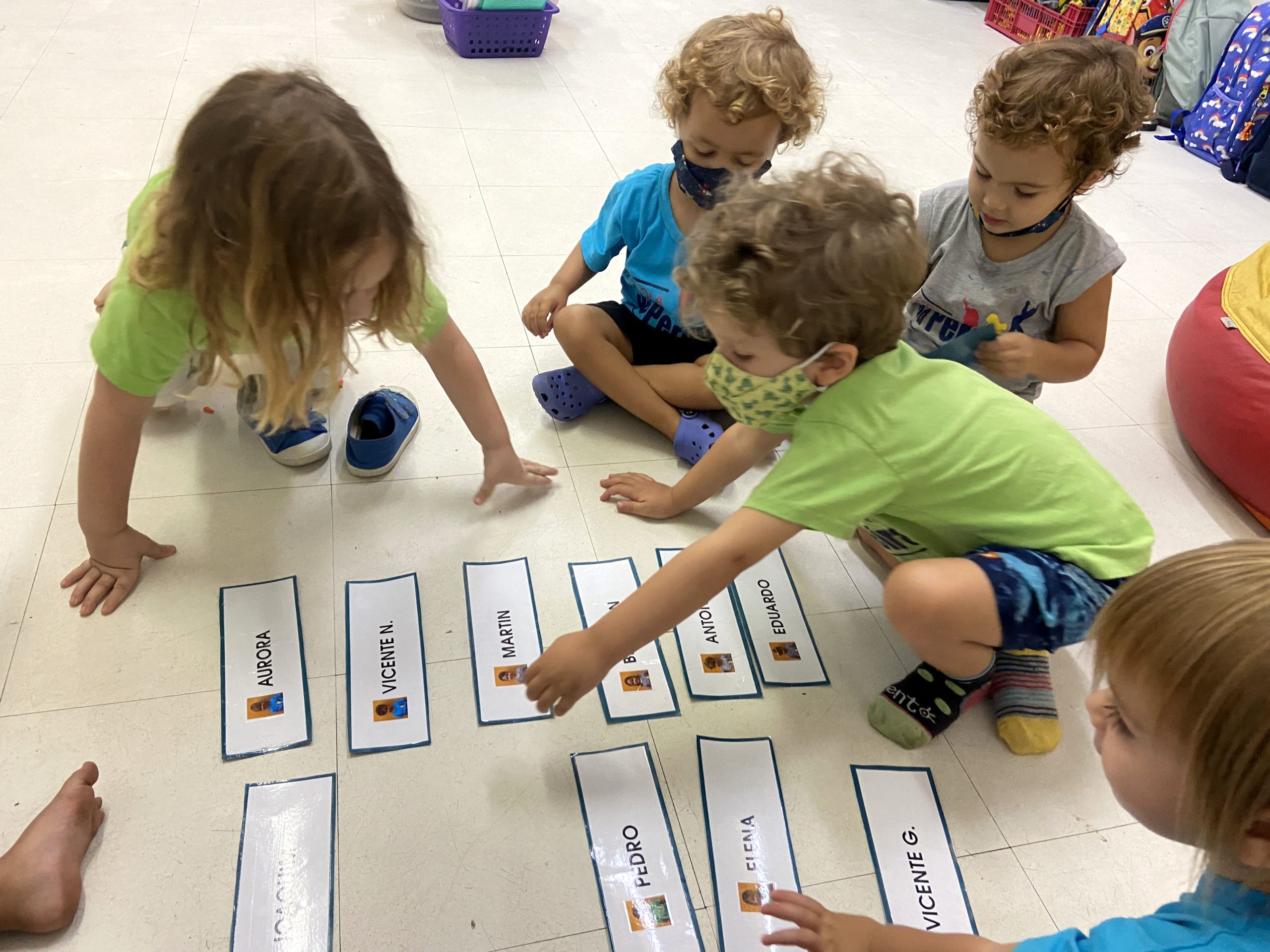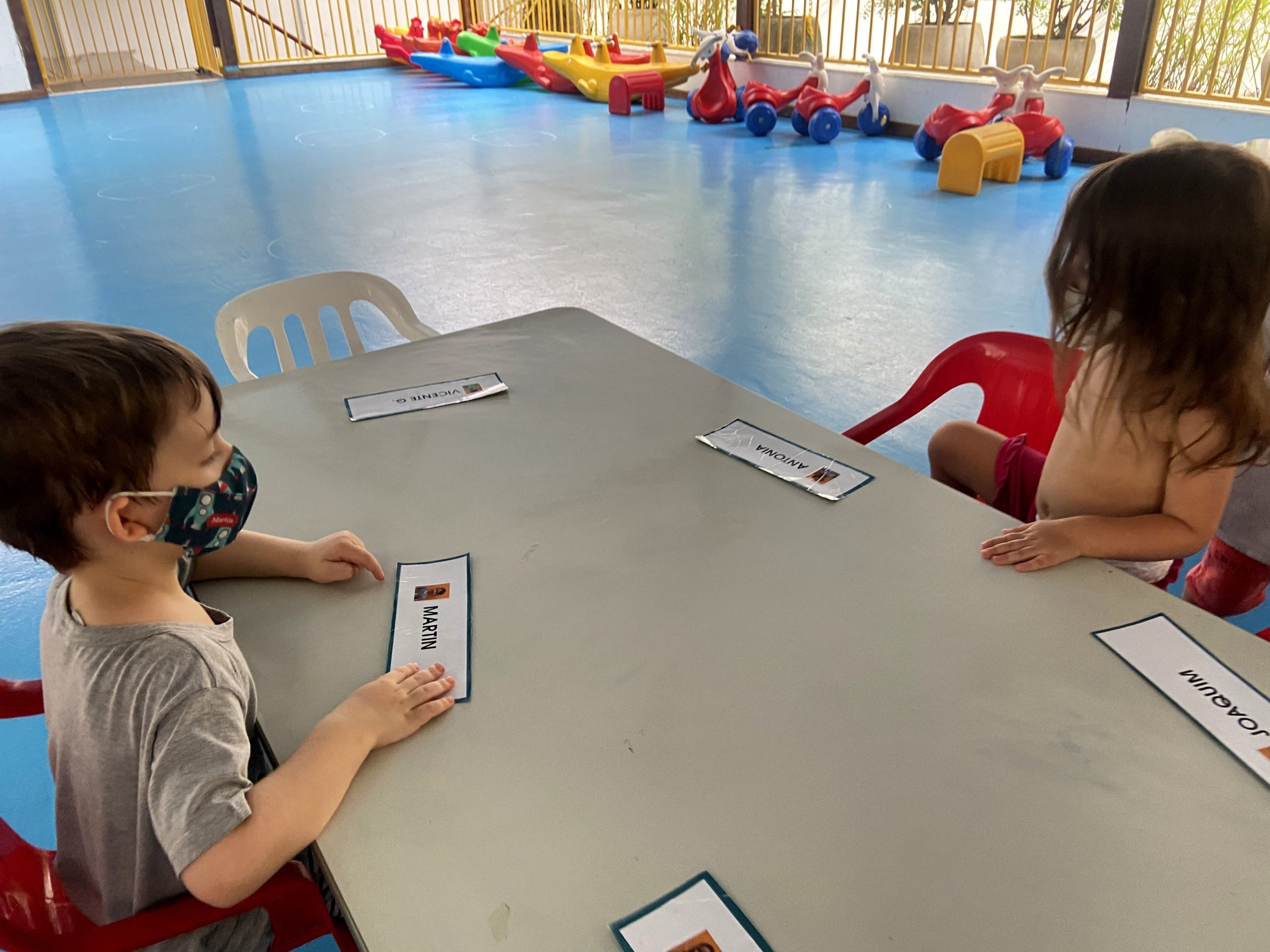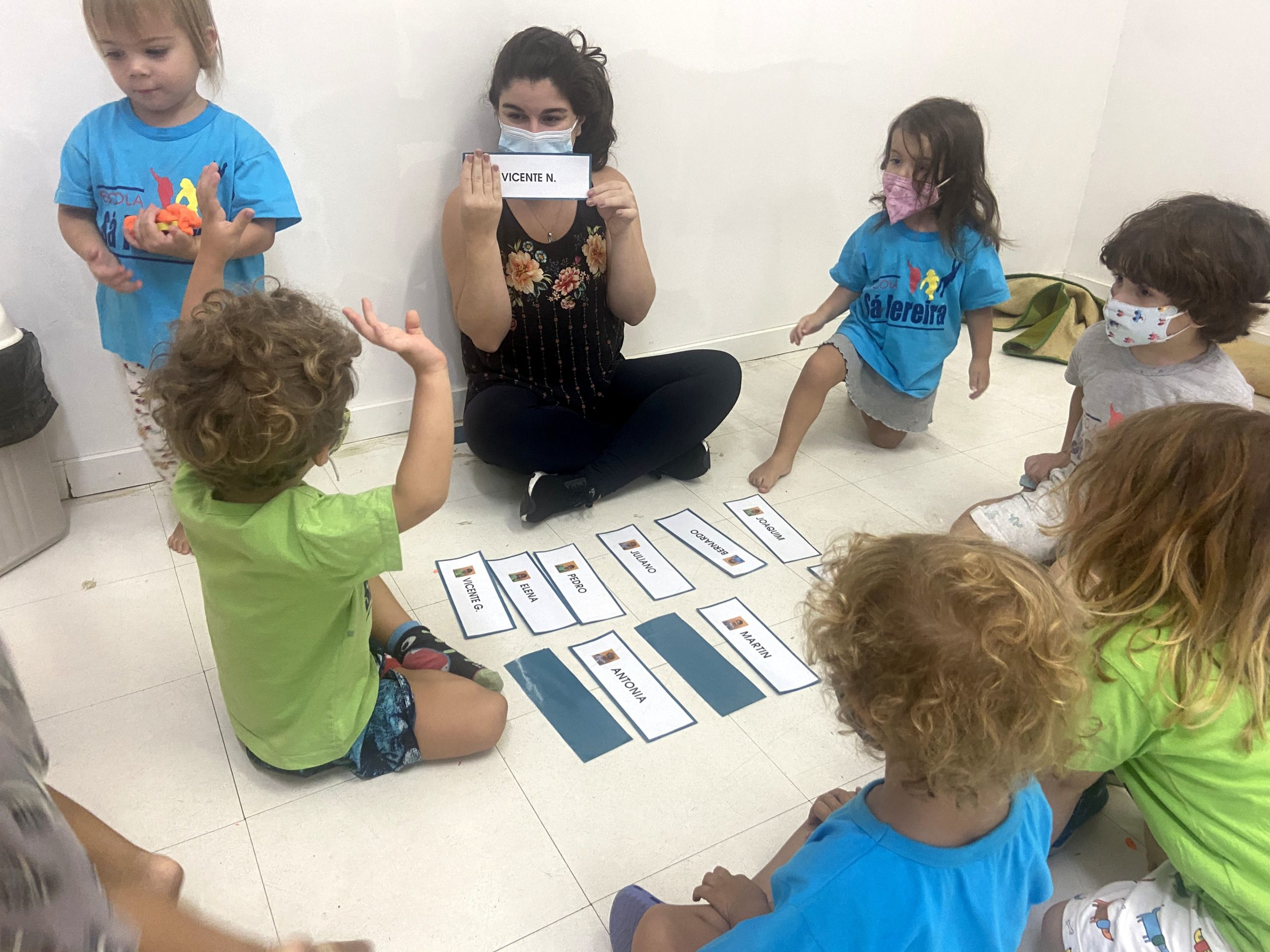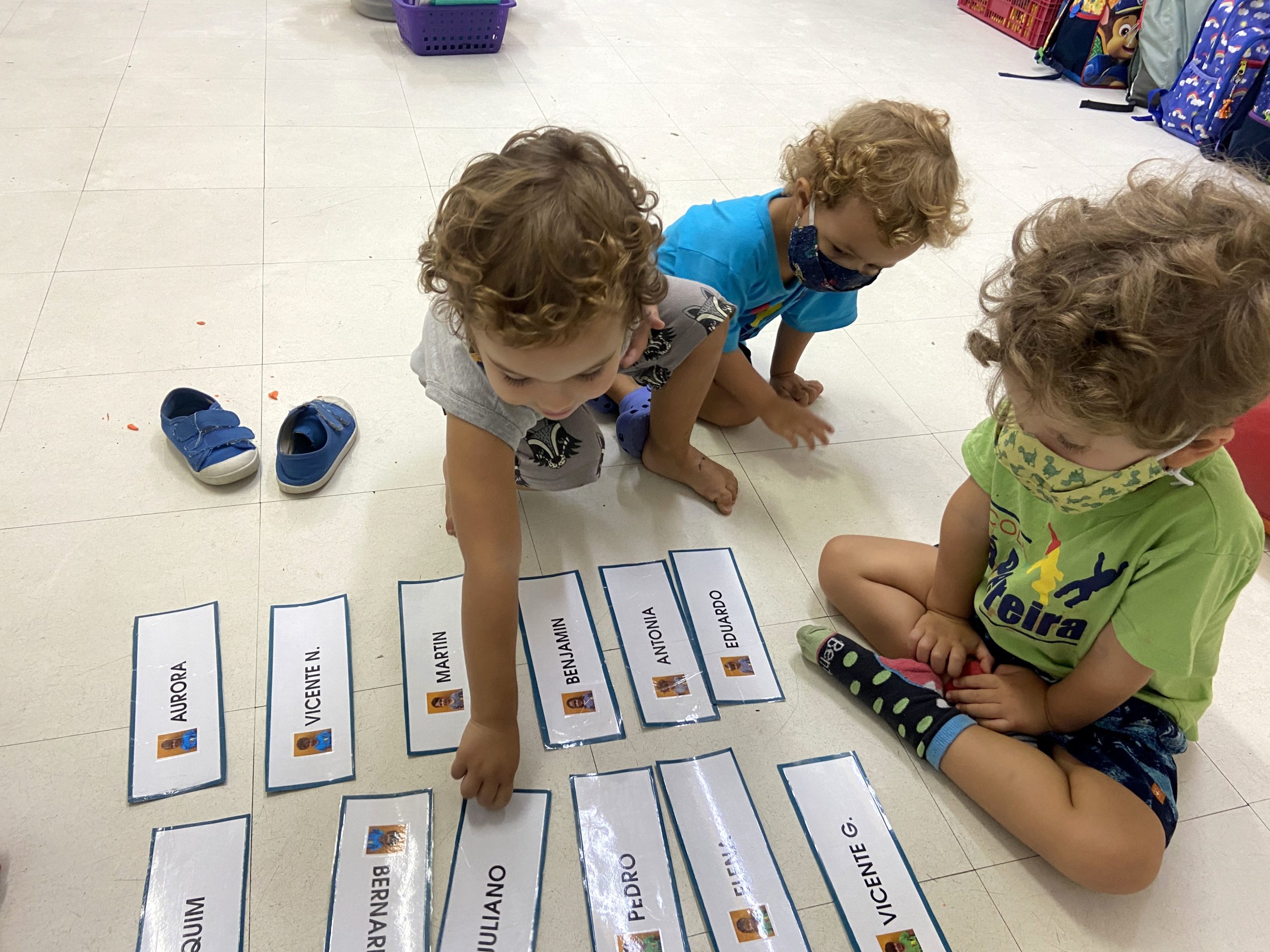 Começamos a explorar também os nomes das crianças da Turma do Botão, utilizando as fichas. Cada ficha contém o nome e a foto da criança, de forma que os pequenos se identificam e identificam os amigos.