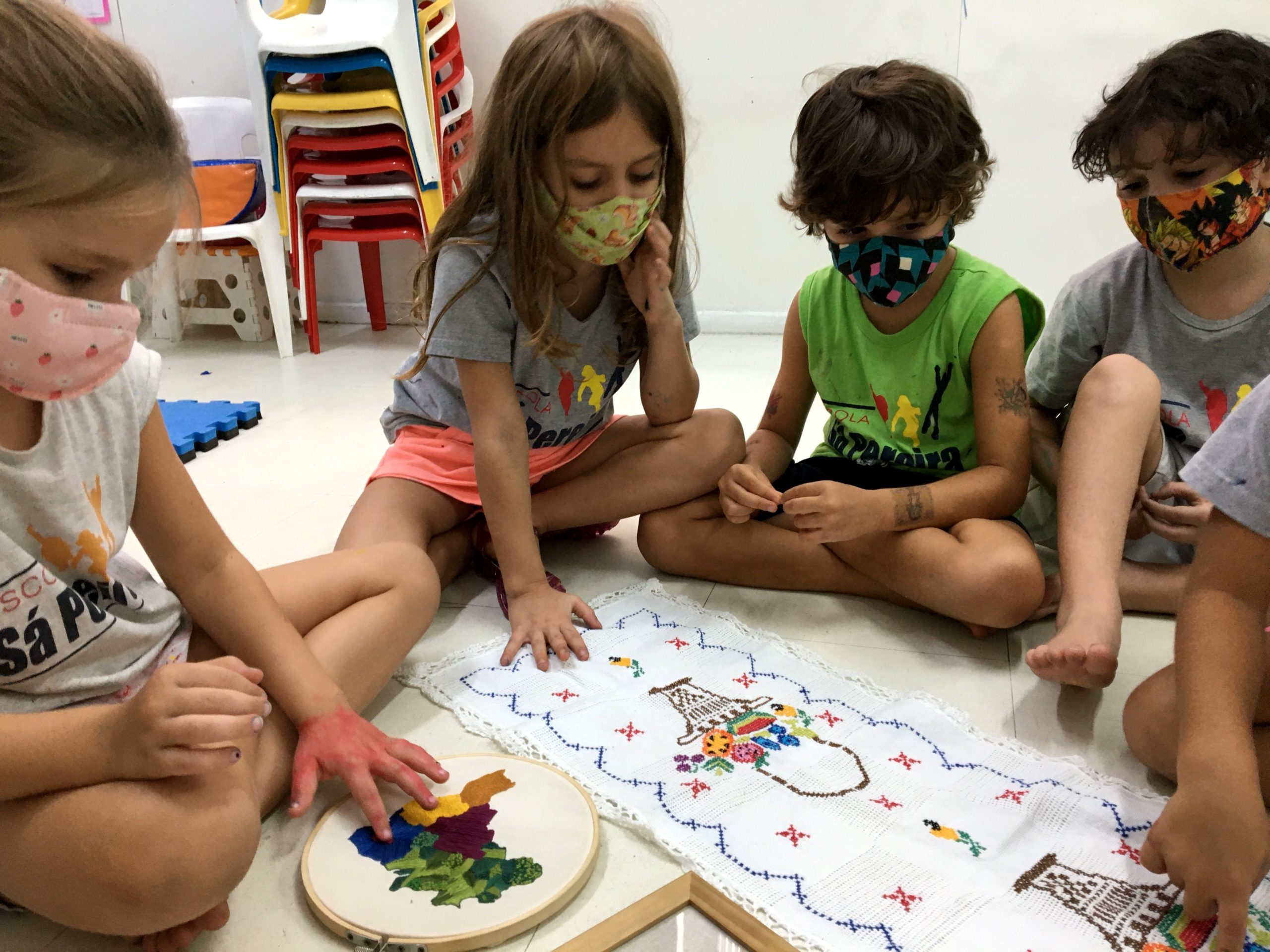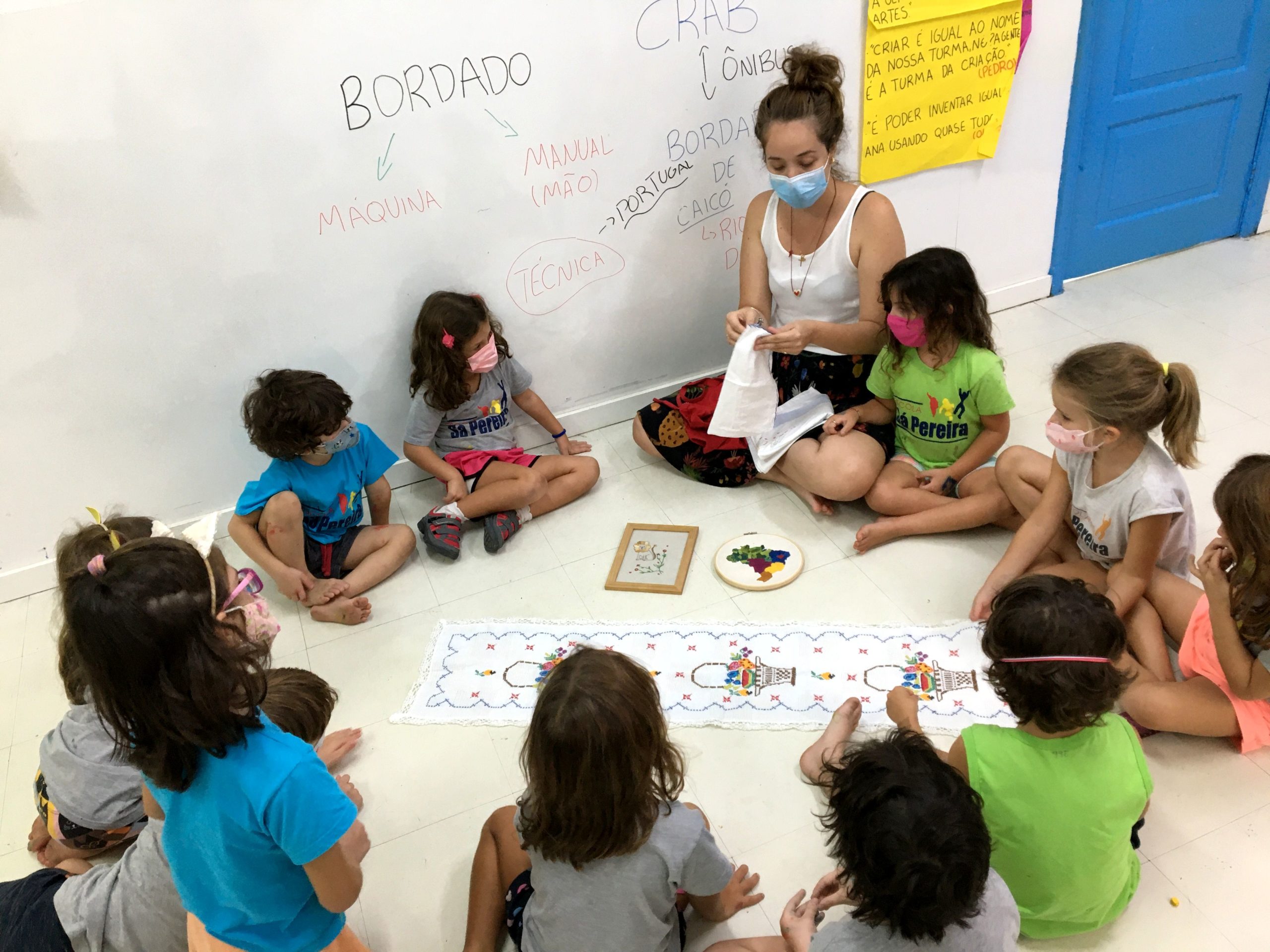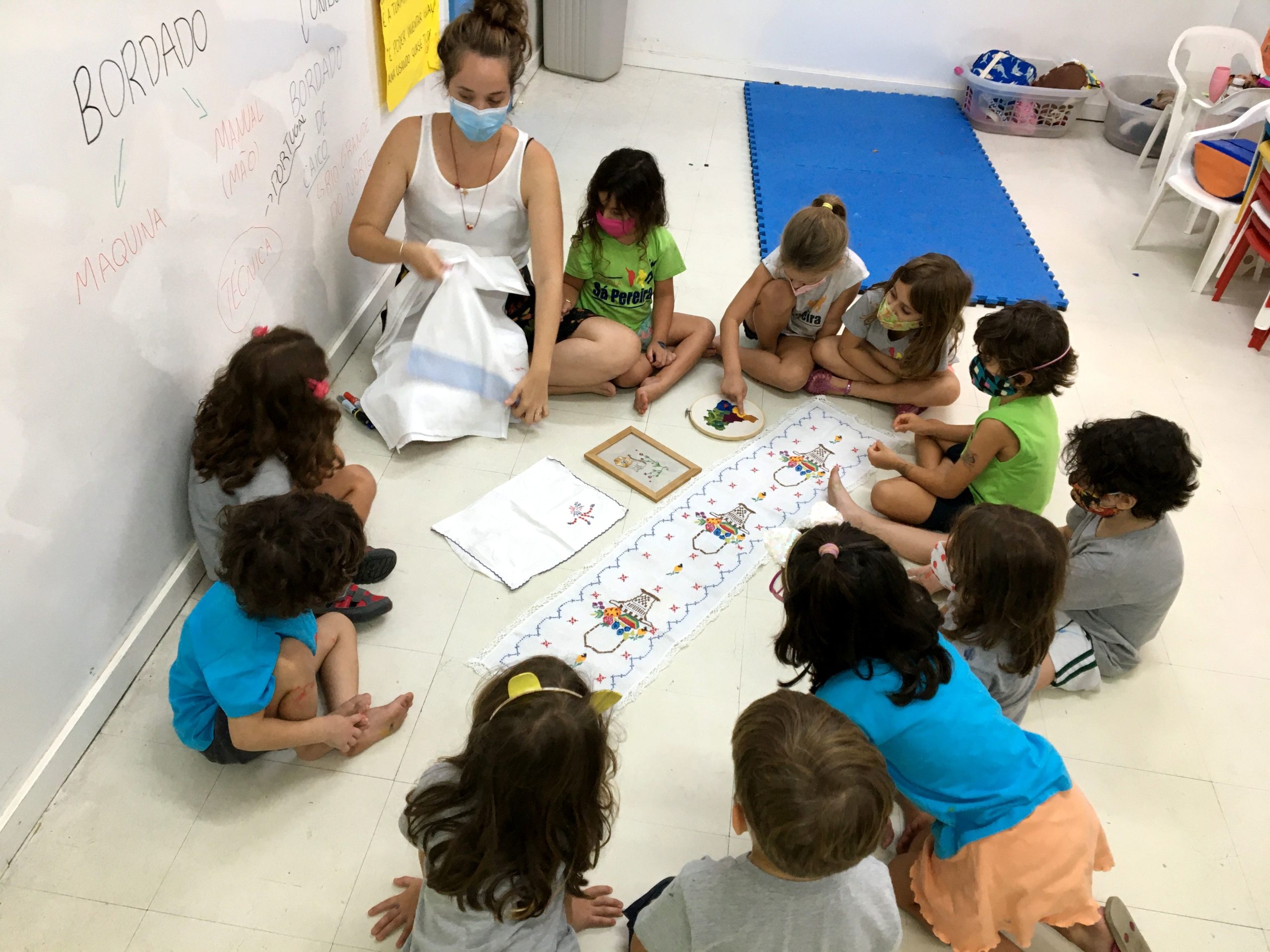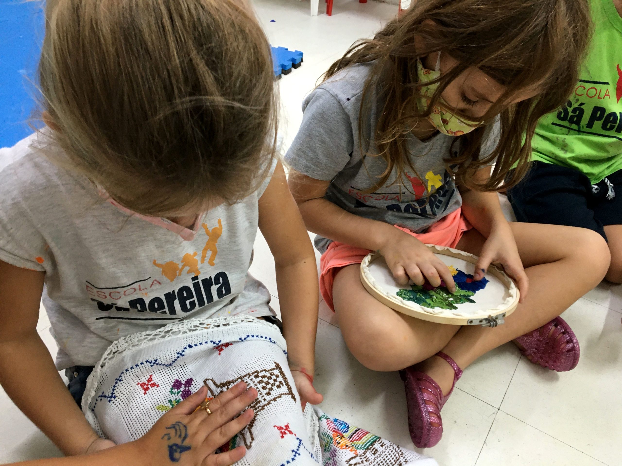 Conhecemos o bordado manual e o de máquina. Os pequenos afirmaram, convictos, que o manual é especial, porque uma peça nunca é igual à outra.