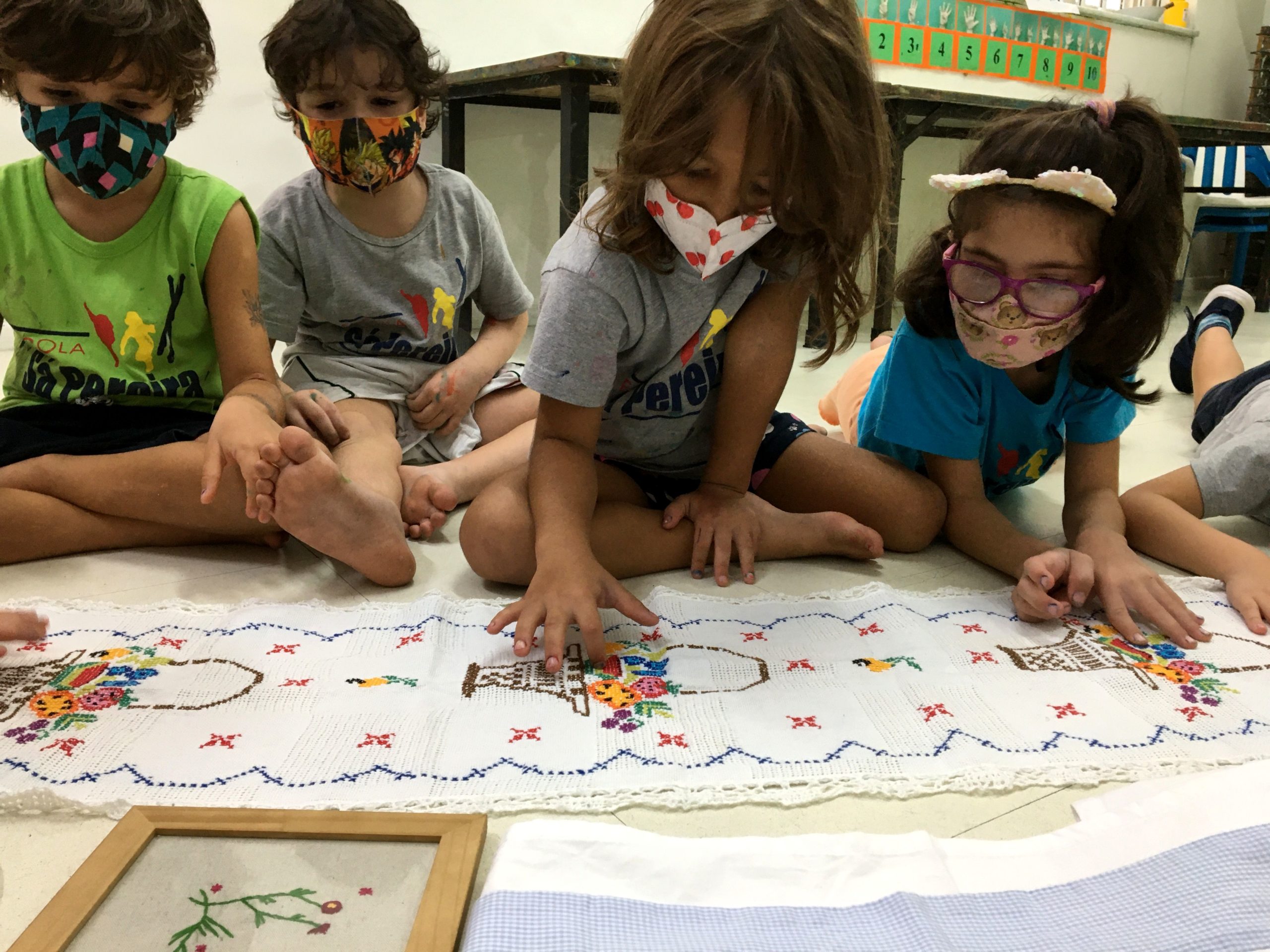 Manuseamos bordados trazidos pela professora Renata e pelo amigo Joaquim, em lençóis, em uma toalha e em um quadro.
