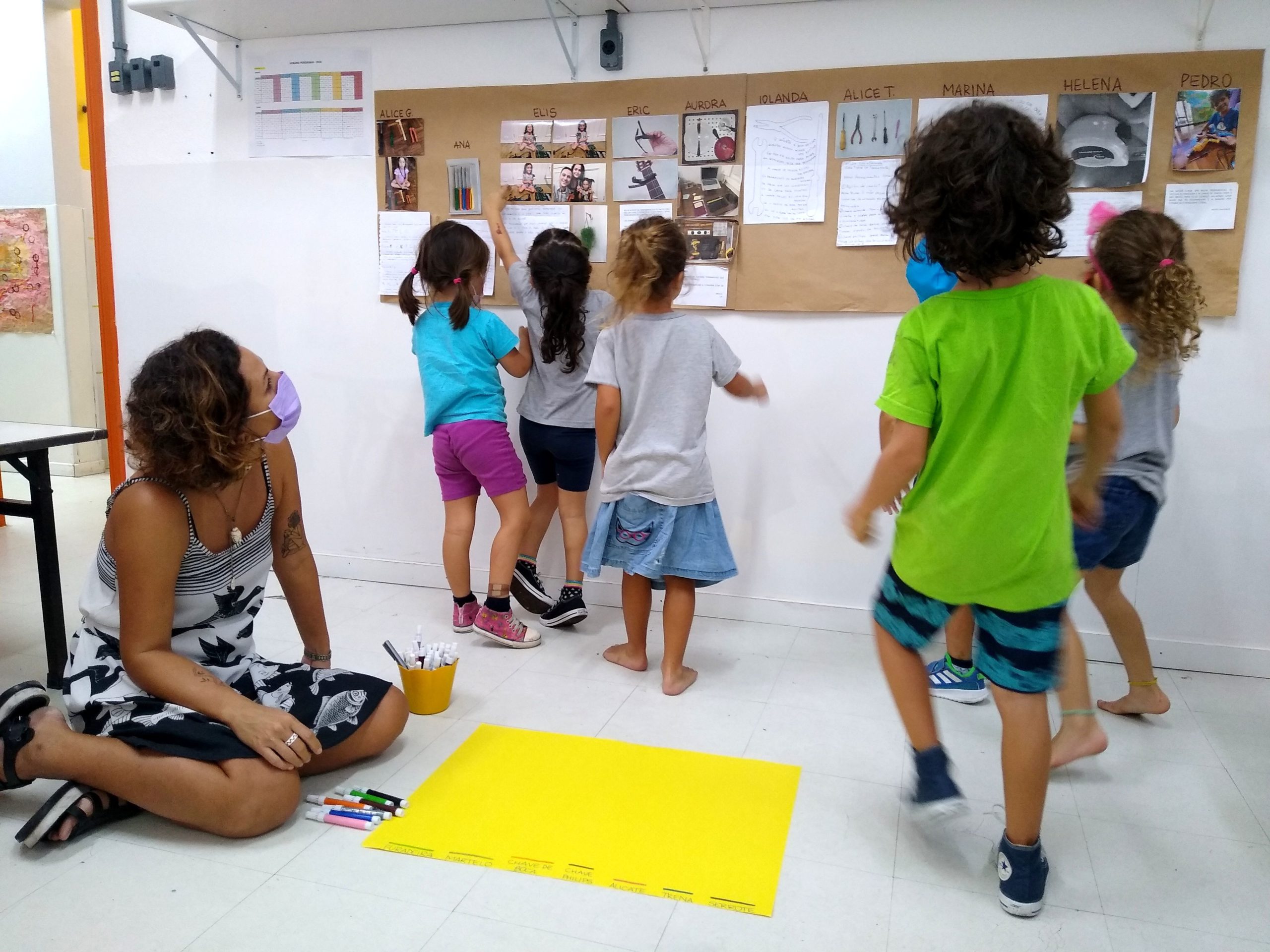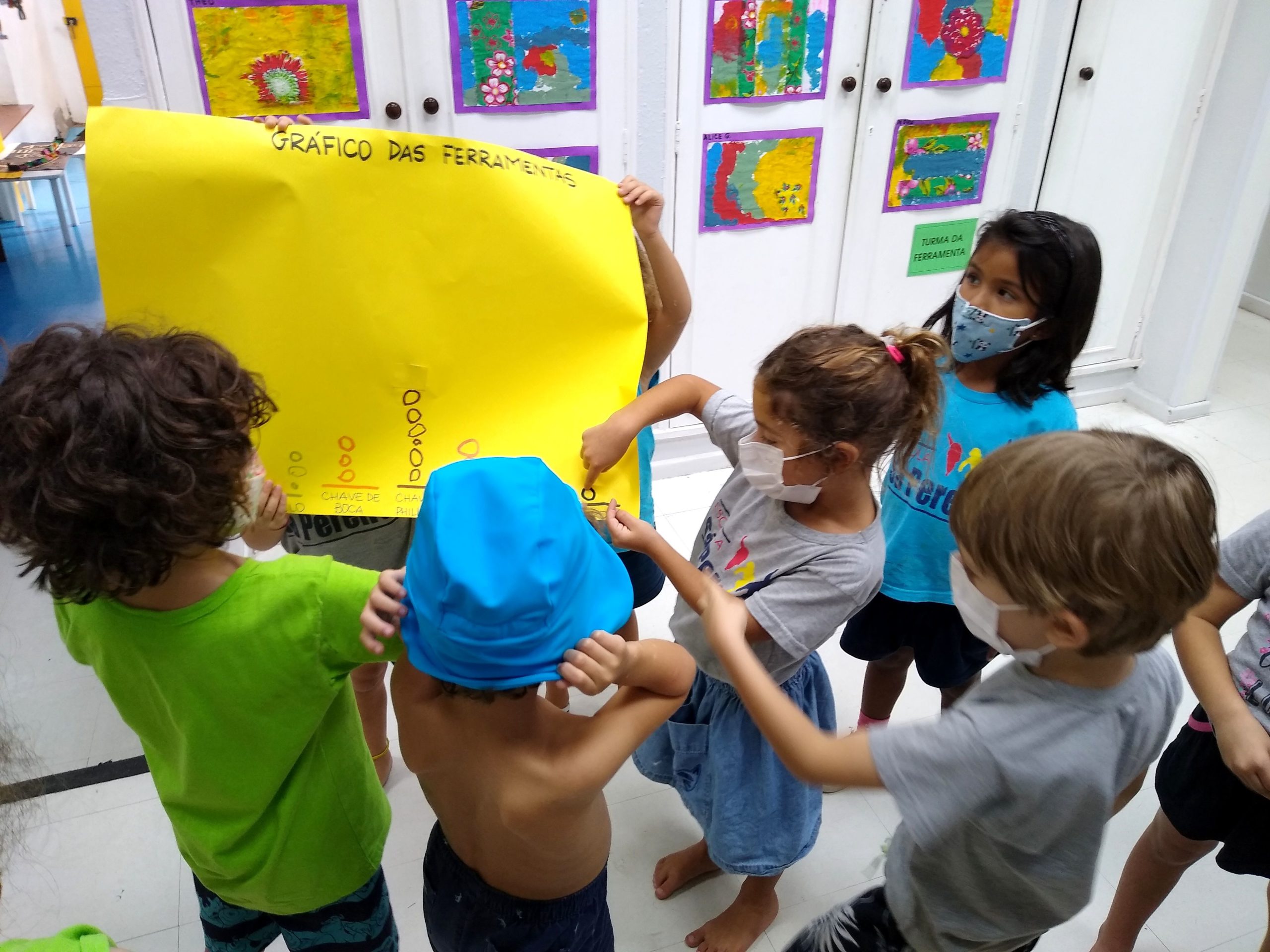 Como resultado das pesquisas feitas pela Turma da Ferramenta, as crianças observaram fotos e ouviram relatos sobre as ferramentas mais utilizadas em suas casas: furadeira, chave de boca, chave de fenda, martelo…