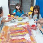 Pintamos o desenho coletivo utilizando uma técnica de tinta guache e terra. As crianças escolheram quais cores gostariam de usar, relembrando o vocabulário de cores em inglês (red, blue, green, yellow, etc.) e após finalizarmos nossa big ant o lugar votado pelo grupo para expô-la foi o refeitório.