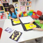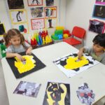 Di Cavalcanti vem inspirando a turma. Desta vez conhecemos a obra Mulher Tocando Tambor. As crianças utilizaram os tons explorados pelo artista em um trabalho feito passo a passo. Com rolinho e tinta preta, pintaram em papel A3. Em uma folha A4, espalharam guache amarelo com rodo por toda a extensão do papel. Os pequenos também foram fotografados individualmente tocando um tambor. A imagem passou por uma edição, trazendo destaque para o instrumento e sua coloração vibrante. Para finalizar, realizaram uma colagem sobrepondo as etapas do trabalho.