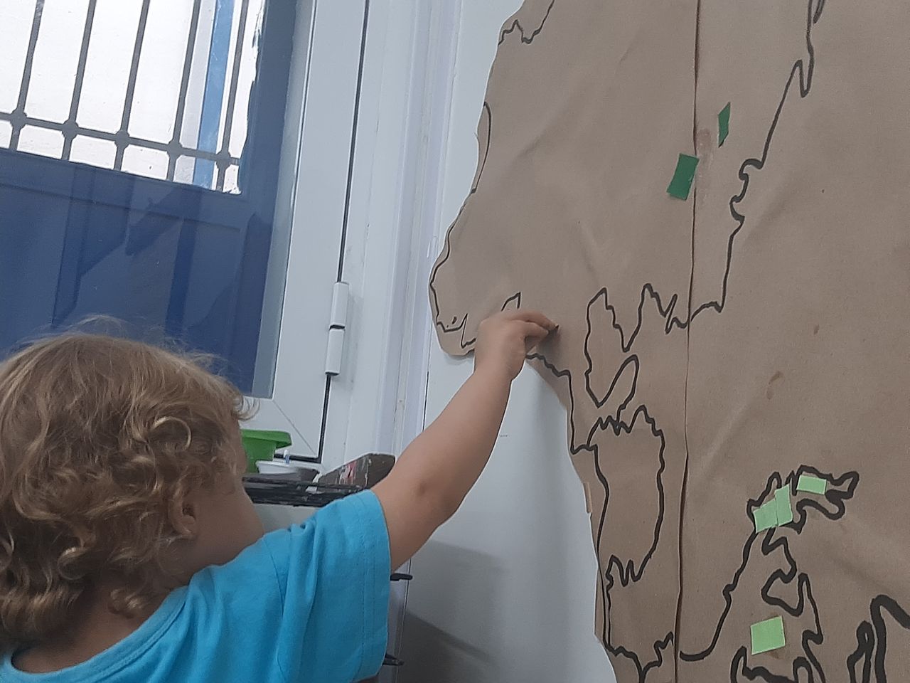 Construímos um grande mapa do Brasil e marcamos com colagem de papel picado toda as áreas dos biomas Mata Atlântica e Amazônia, relacionando-as com as cores da legenda. No decorrer das nossas investigações, vimos um documentário sobre o bioma Amazônia e as crianças se interessaram em saber mais sobre o boto-vermelho ou boto-cor-de-rosa.