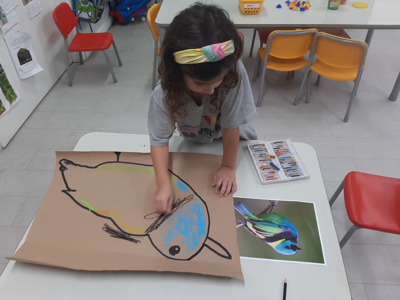 Dando continuidade ao projeto institucional “O Brasil é feito de quê?”, nossa turma começou a pesquisar sobre os biomas terrestres do Brasil. No livro Brasil 100 palavras descobrimos o bioma Mata Atlântica, as crianças ficaram encantadas com o pássaro saíra-sete-cores e esse encantamento nos direcionou para as pesquisas. Assistindo a um vídeo descobrimos que essa espécie gosta das árvores frutíferas, que é dançarina, sociável e que costuma cantar quando procura comida.
