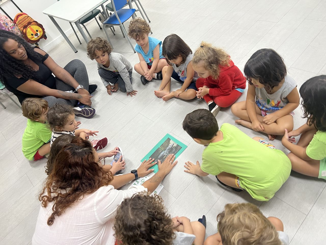 O grupo recebeu uma visita especial da família da amiga Iolanda: Francisco (irmão e aluno da F7T) e Pedro Pamplona (pai e professor de música no Fund I e II da Sá Pereira). Com desenvoltura, Chico compartilhou suas aprendizagens adquiridas no ano passado ao estudar com a sua turma sobre a Amazônia. Atentas, as crianças observaram no mapa os rios que desenham a floresta, fotografias de espécies nativas do bioma e suas características.