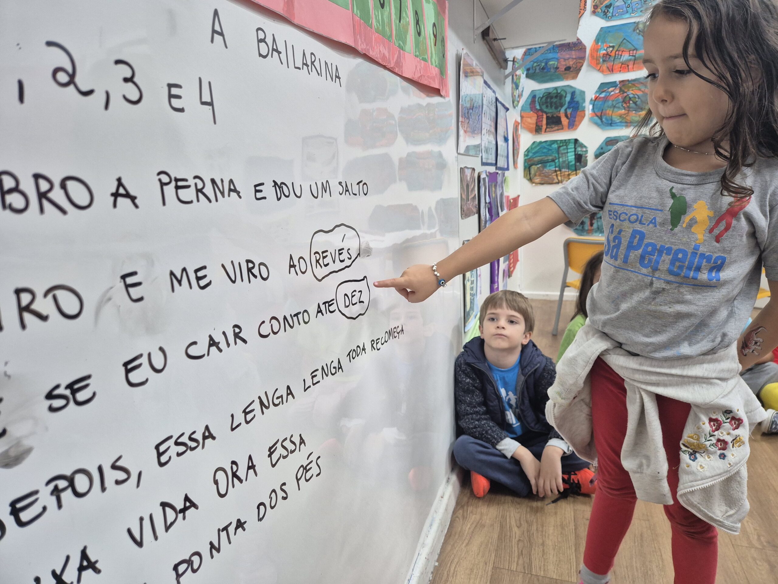 A experiência ganhou ainda mais profundidade quando a letra da canção foi escrita no quadro. As crianças mergulharam no universo das palavras, identificando rimas, brincando com os sons e até criando novas combinações. Ao brincar com as rimas, as crianças compreendem a estrutura das palavras e a musicalidade da língua, um passo essencial para a aproximação do sistema da escrita alfabética. Além disso, a exploração das rimas promove a criatividade, permitindo que as crianças explorem novas formas de expressão e se divirtam com a linguagem.