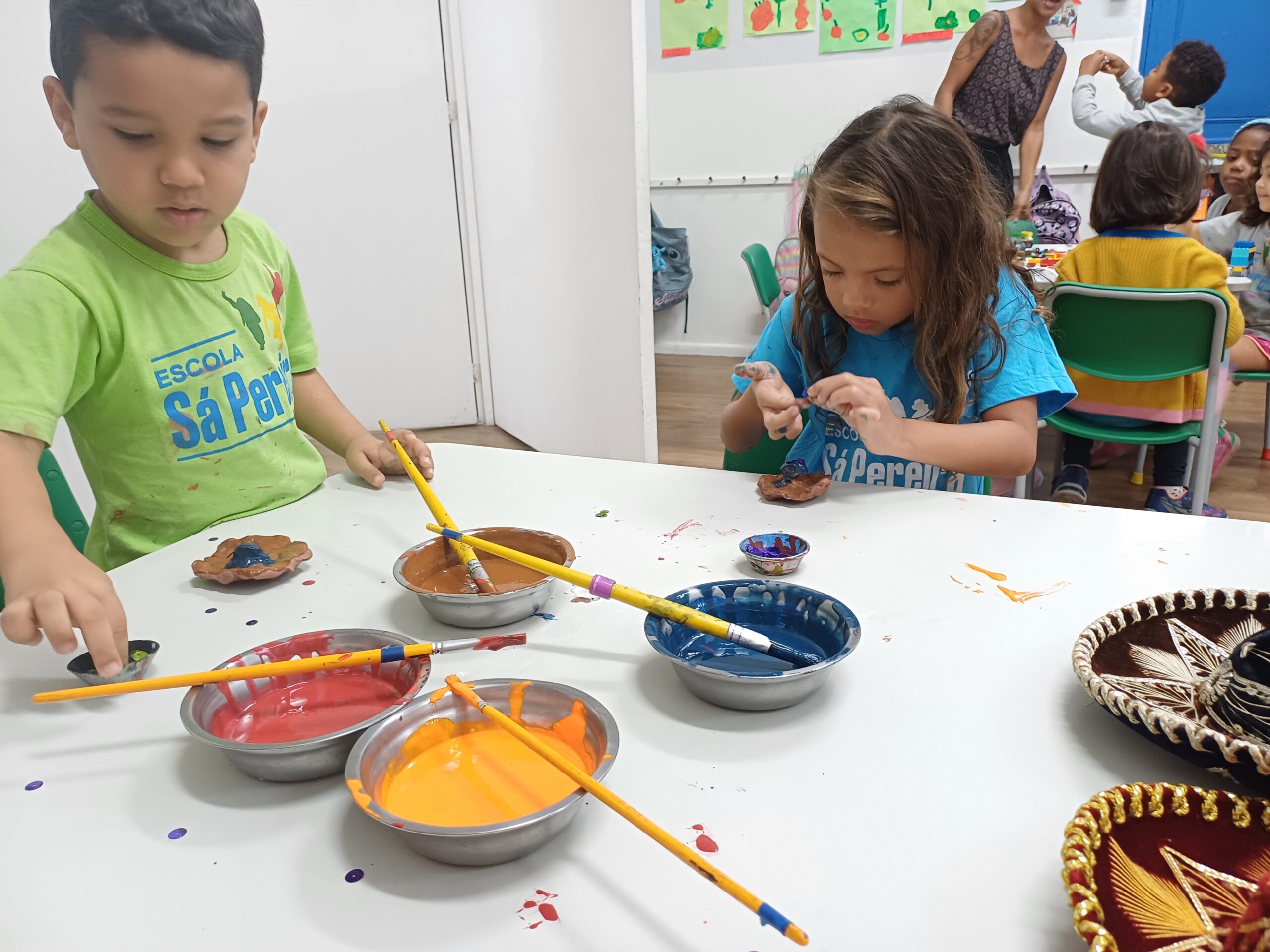 As crianças têm apreciado bastante as descobertas feitas na turma. Nossos amigos Vicente e Olívia trouxeram objetos mexicanos para apresentar ao grupo: o sombrero e caveirinhas em argila, que serviram de inspiração para a criação de seus trabalhos.