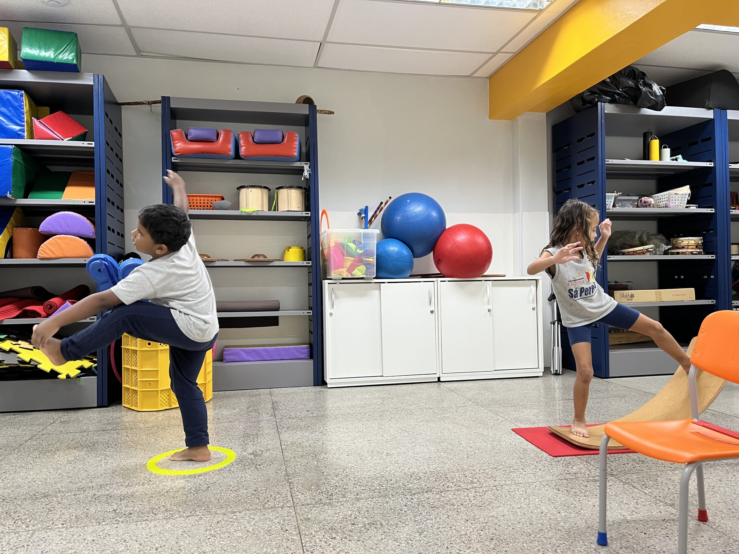 Ao abrir o presente, a turma precisou encontrar uma forma de fazê-la funcionar, pois o mecanismo de corda não respondia como o esperado. Apesar dos esforços, apenas a melodia tocou, e a bailarina não rodopiou como deveria. “A caixa do artista deve ser muito antiga, por isso não funciona”, concluíram as crianças. Longe de desanimar, a turma decidiu criar sua própria magia: transformaram-se em bailarinos e bailarinas, dançando graciosamente ao som de A Bailarina, de Lucinha Lins. Com movimentos inspirados no balé, exploraram a leveza e a precisão dos passos, transformando o momento em uma celebração da música e do movimento.