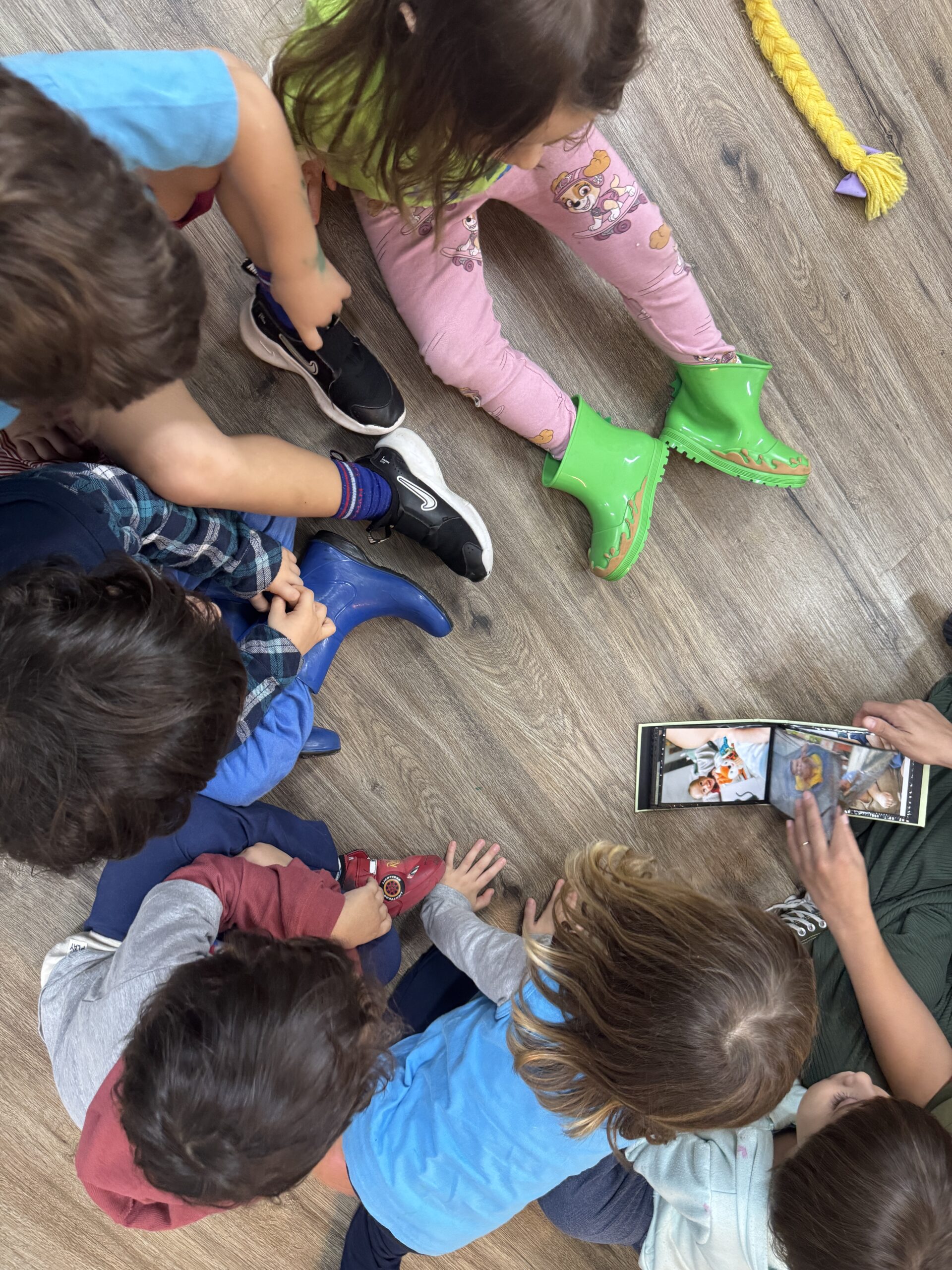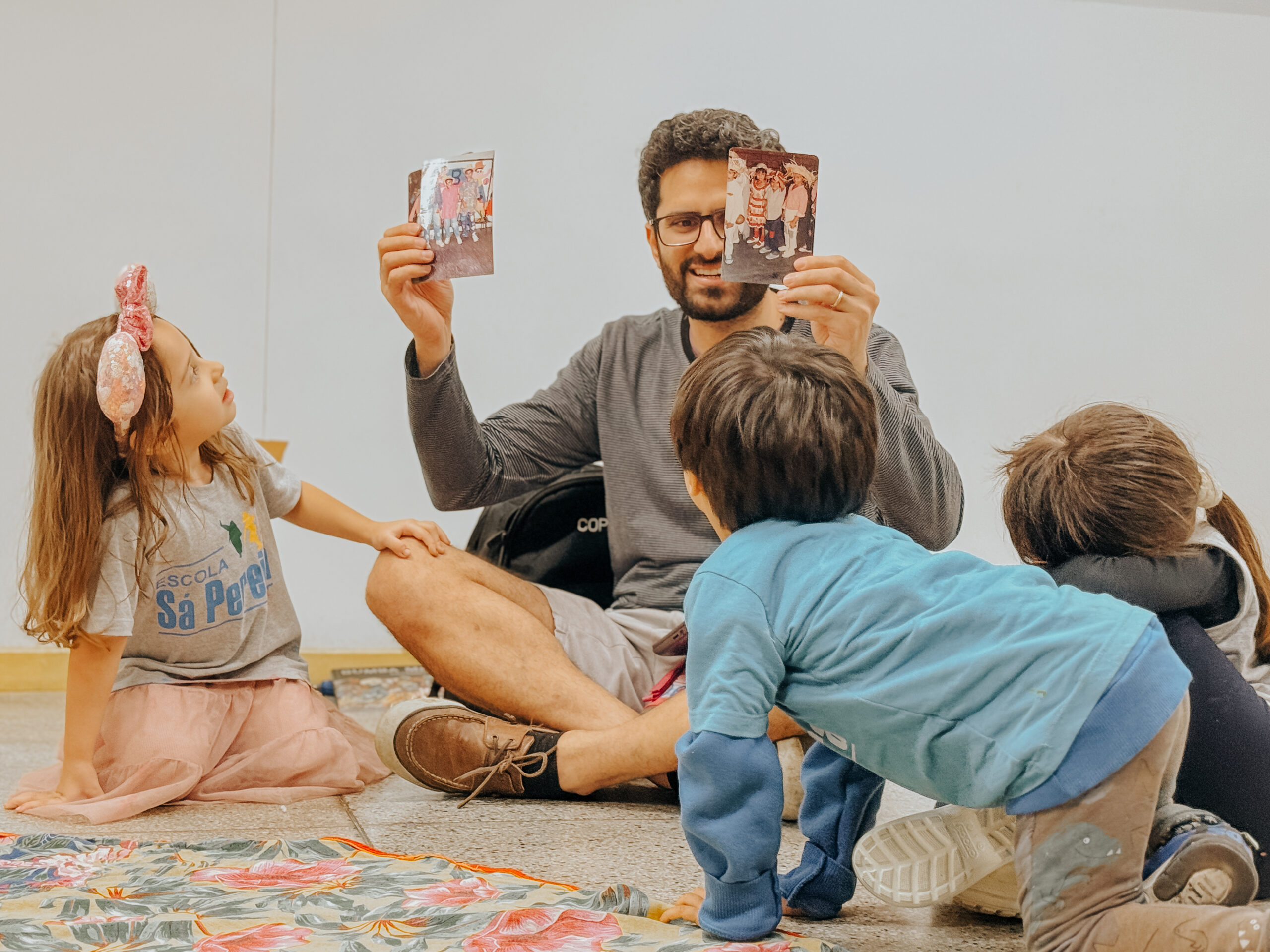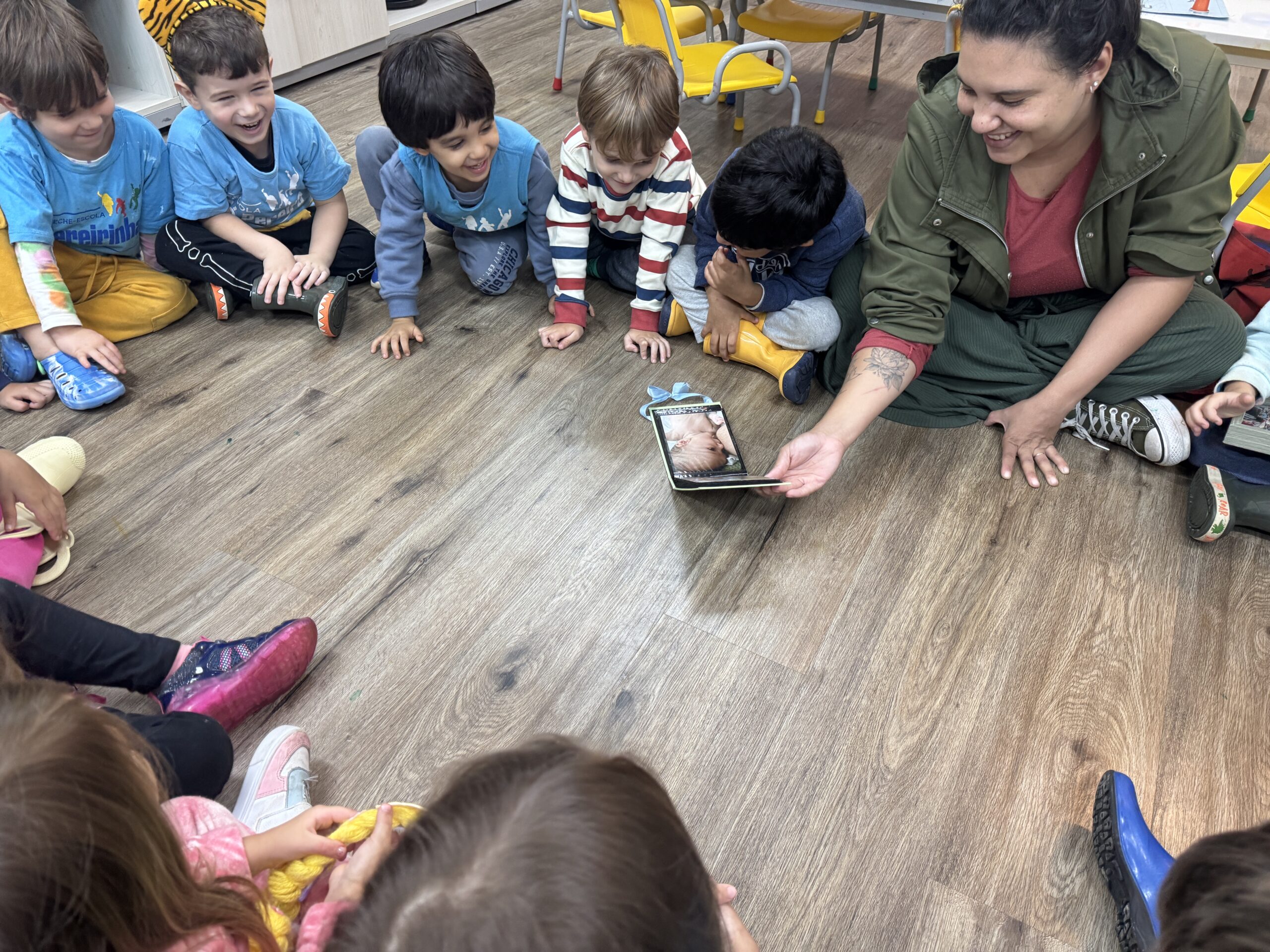 Para alimentar ainda mais essa investigação, Bruna, professora da turma, compartilhou com as crianças um álbum de fotos de seu filho Benjamin, que registra momentos desde o nascimento do menino, revelando como as imagens podem contar histórias, preservar afetos e construir memória.