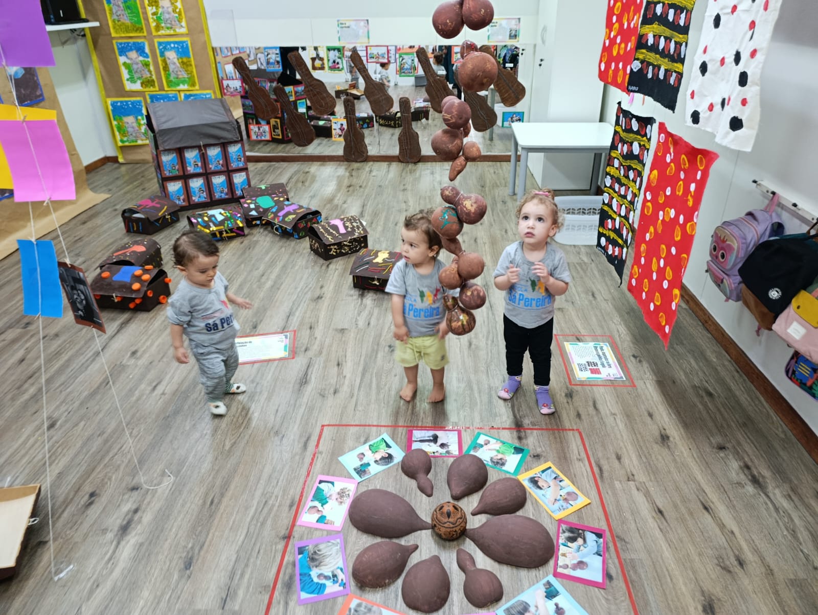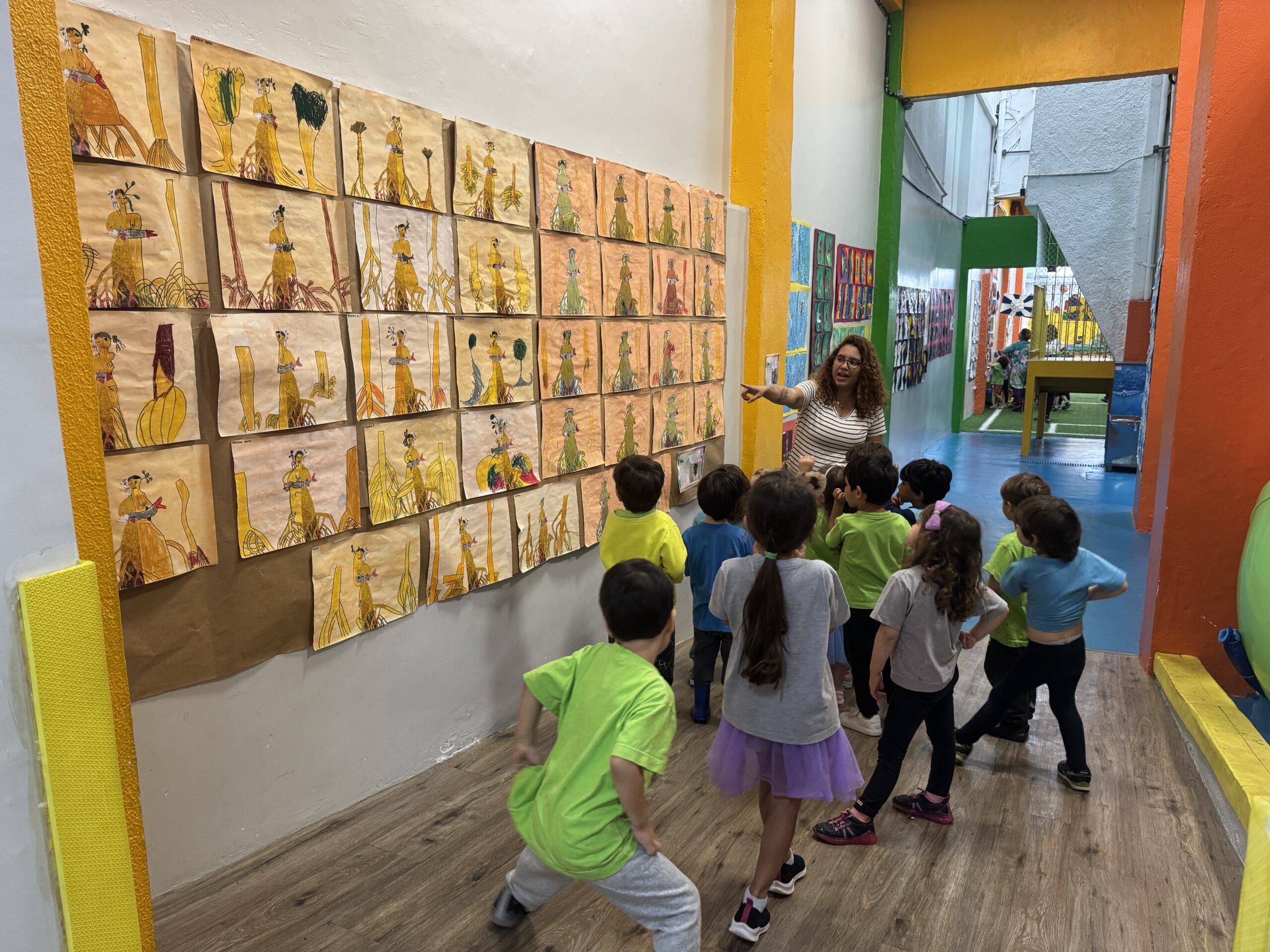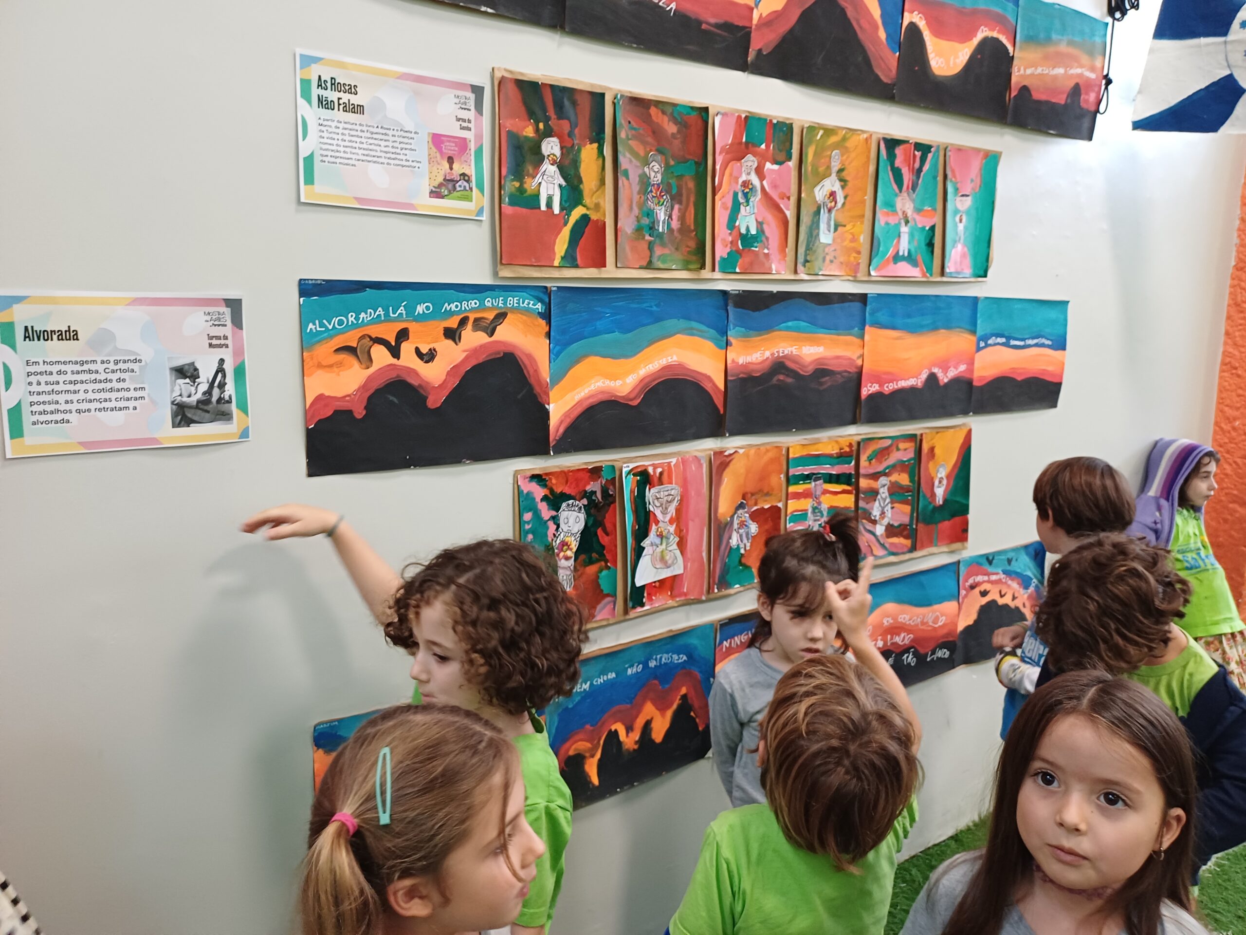 A Turma do Papel esteve envolvida em um momento especial de apreciação, visitando os trabalhos da Mostra de Artes das demais turmas. As crianças observaram atentamente a exposição, valorizando as produções.