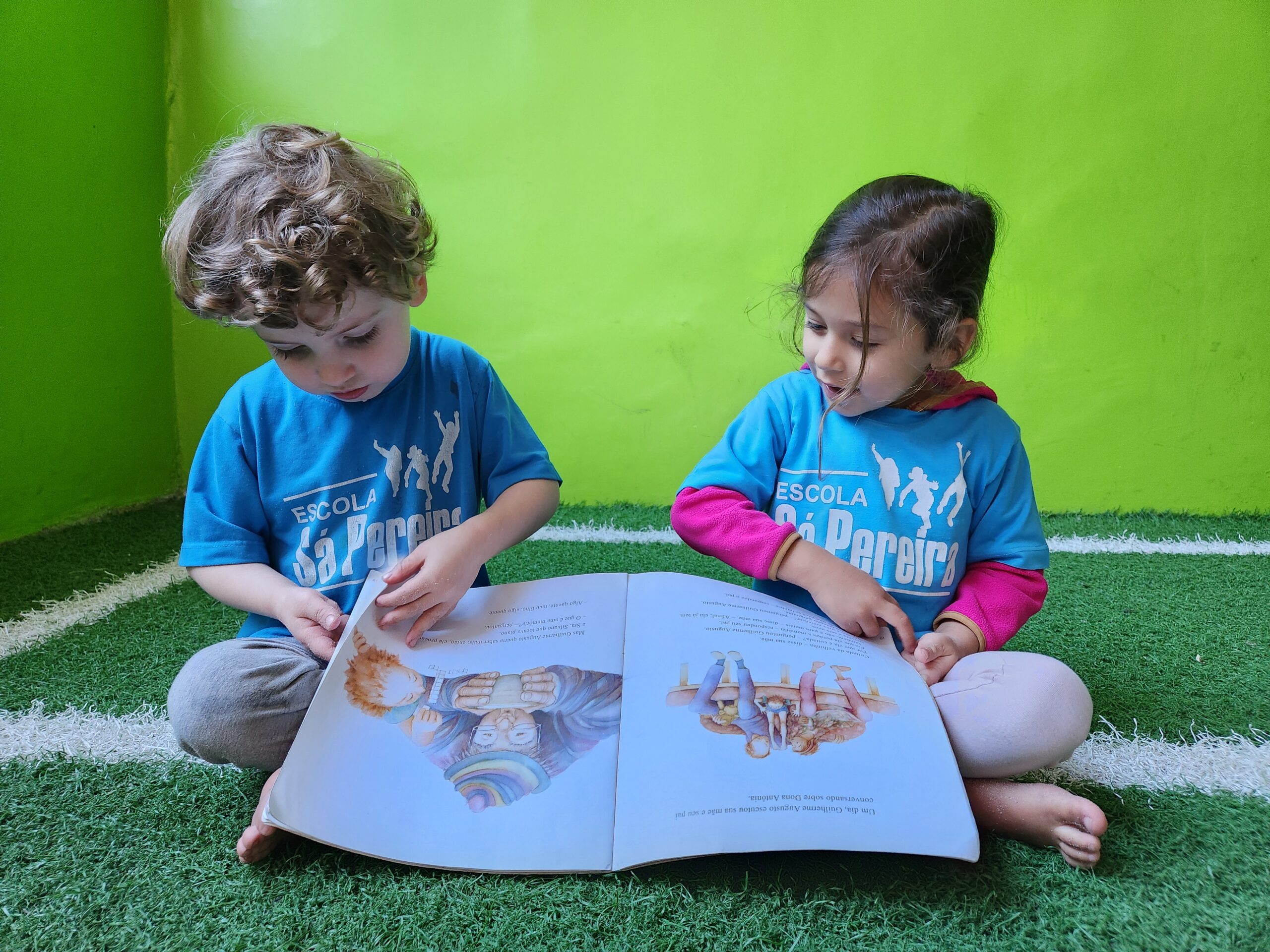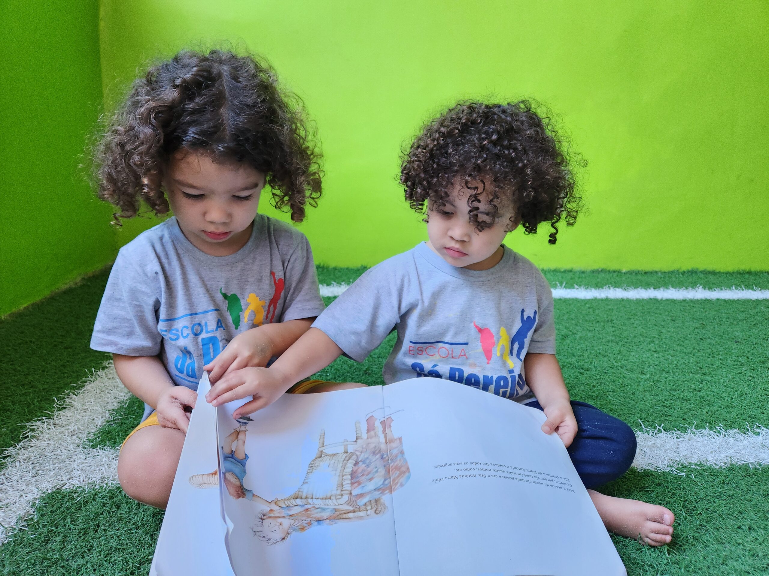 O livro, guardado como um tesouro em nosso baú, despertou a curiosidade e a imaginação das crianças. Após a contação, elas foram organizadas em duplas para folhear e explorar a narrativa, descobrindo juntas novos sentidos e se apropriando da história de diferentes maneiras.