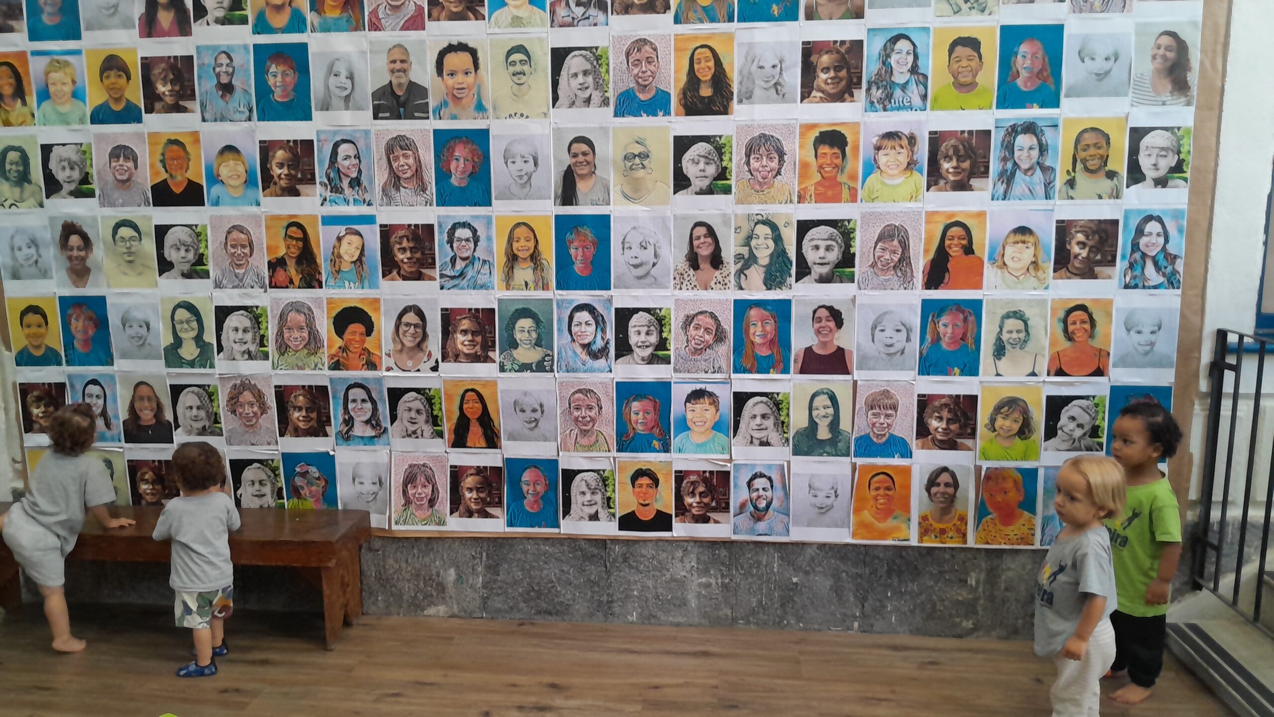 Nesta semana, a nossa turma pôde passear com calma pela escola observando os trabalhos em todos os espaços. Brincamos de procurar pessoas conhecidas na parede de fotos e cada criança adorou encontrar sua imagem estampada no grande mural!