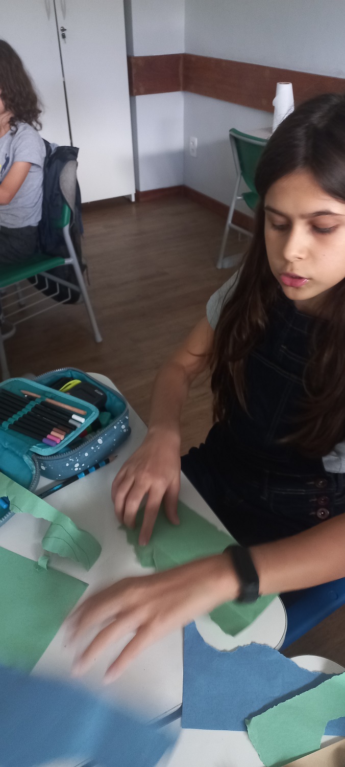 Para a capa do caderno de Projeto, as F5 tiveram como referência a Torn Art, que usa a técnica de rasgar o papel nas suas composições. Dos estudos sobre restinga, mangue e floresta vieram as paisagens que ganharam forma plástica, unindo os saberes científicos ao fazer artístico.