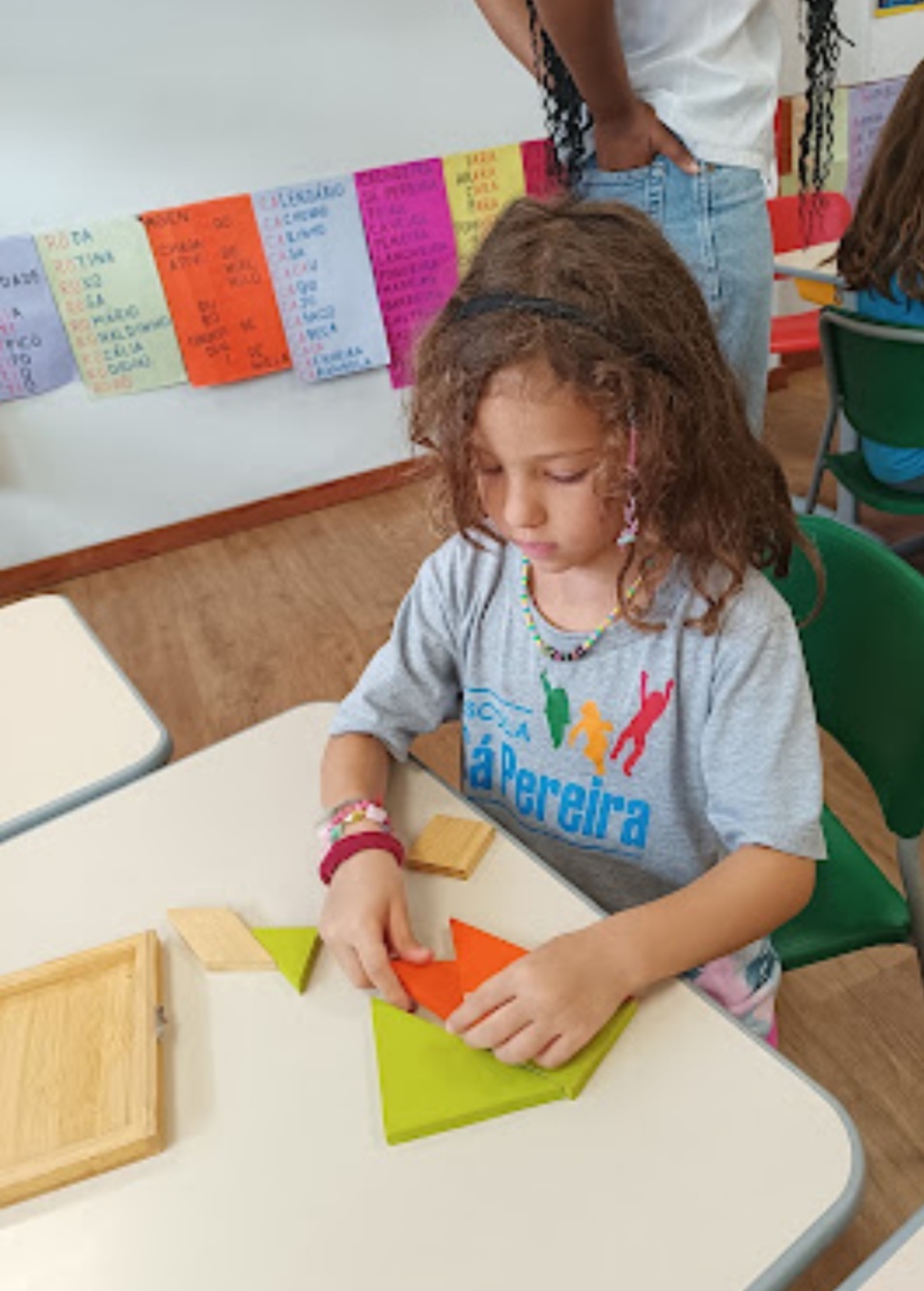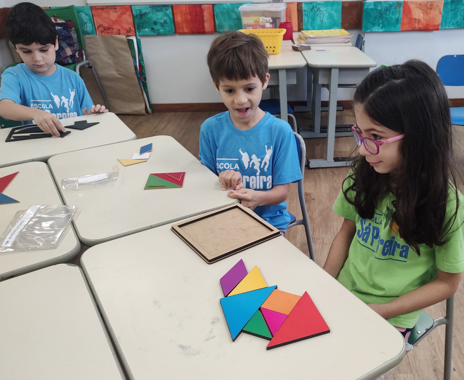 As crianças compararam tamanhos, formas e quantidades do quebra-cabeça. Usando as peças e muita imaginação, criaram bichos, casas, figuras humanas…