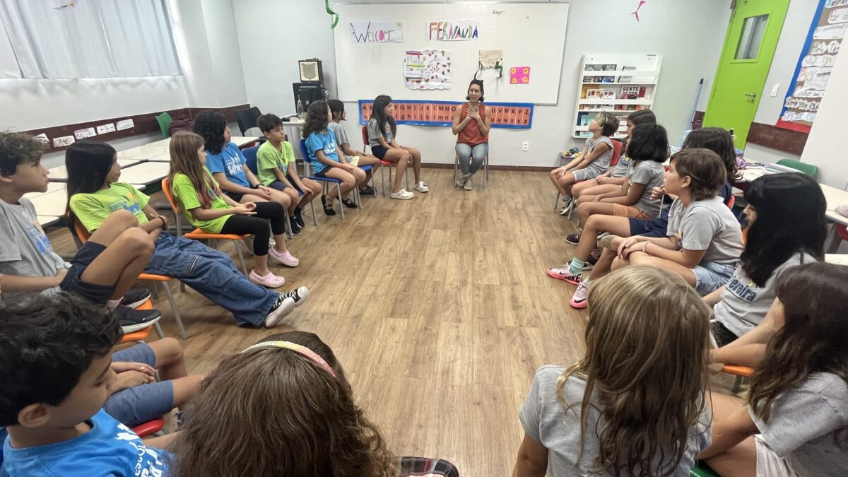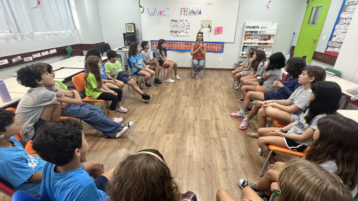 Além disso, os estudantes estão aprimorando suas habilidades de oralidade, escuta e leitura por meio de livros sobre escolas ao redor do mundo, disponíveis na plataforma Árvore de Livros. Essa atividade permite que eles comparem e conheçam diferentes culturas, línguas e espaços escolares, utilizando as WH questions words (who, what, where, when, why…) e relacionando essas experiências com sua própria vivência e local de fala.
