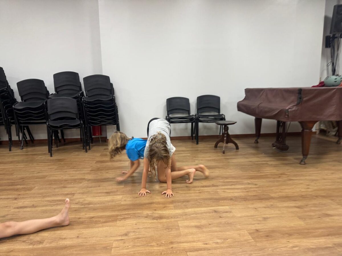 Para começar, falamos das articulações: fizemos um aquecimento articular para entender como as “engrenagens” do nosso corpo funcionam, e depois propusemos que as crianças “virassem máquinas”. Cada criança criou um movimento que precisaria se encaixar com outro para que a máquina funcionasse. Elas adoraram o desafio!