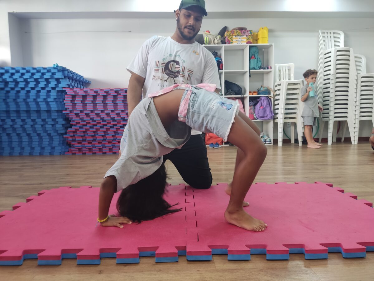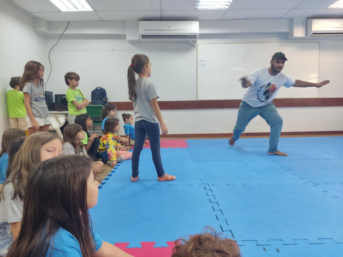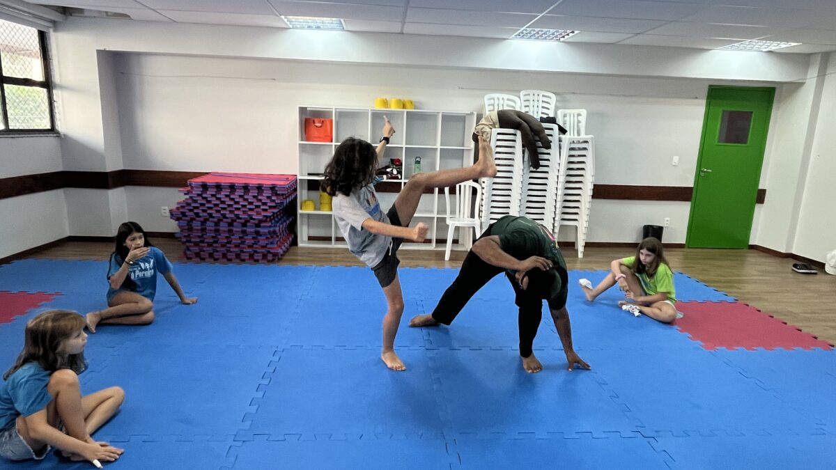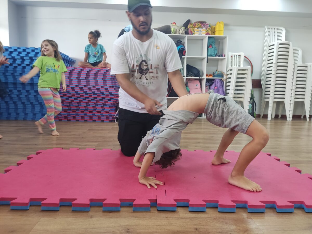 Com criatividade e atenção, elas exploraram movimentos da capoeira como a ginga, a meia-lua de frente, a cocorinha, o aú e o rolê. Cada gesto é uma expressão de corpo inteiro, uma dança que mistura jogo, arte e tradição.