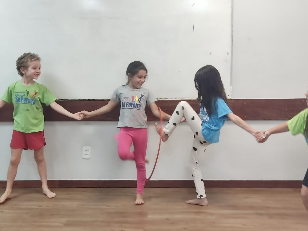 Equilíbrio, agilidade, pontaria e saltos foram algumas das explorações motoras vivenciadas de forma lúdica nas brincadeiras da Boca do Palhaço, Bolinha na Colher, Jogo da Pipoca e Pulando a Cobra!