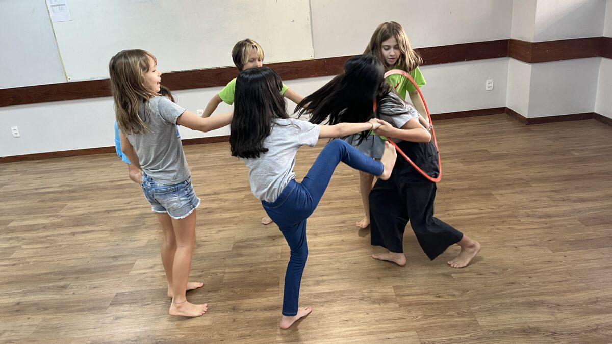 Para ampliar essa vivência, o professor Leandro propôs brincadeiras com bambolês, que convidaram os pequenos a se movimentar de forma livre. Com eles, surgiram rodas, passagens e desafios de equilíbrio, onde o corpo brincou e aprendeu.
