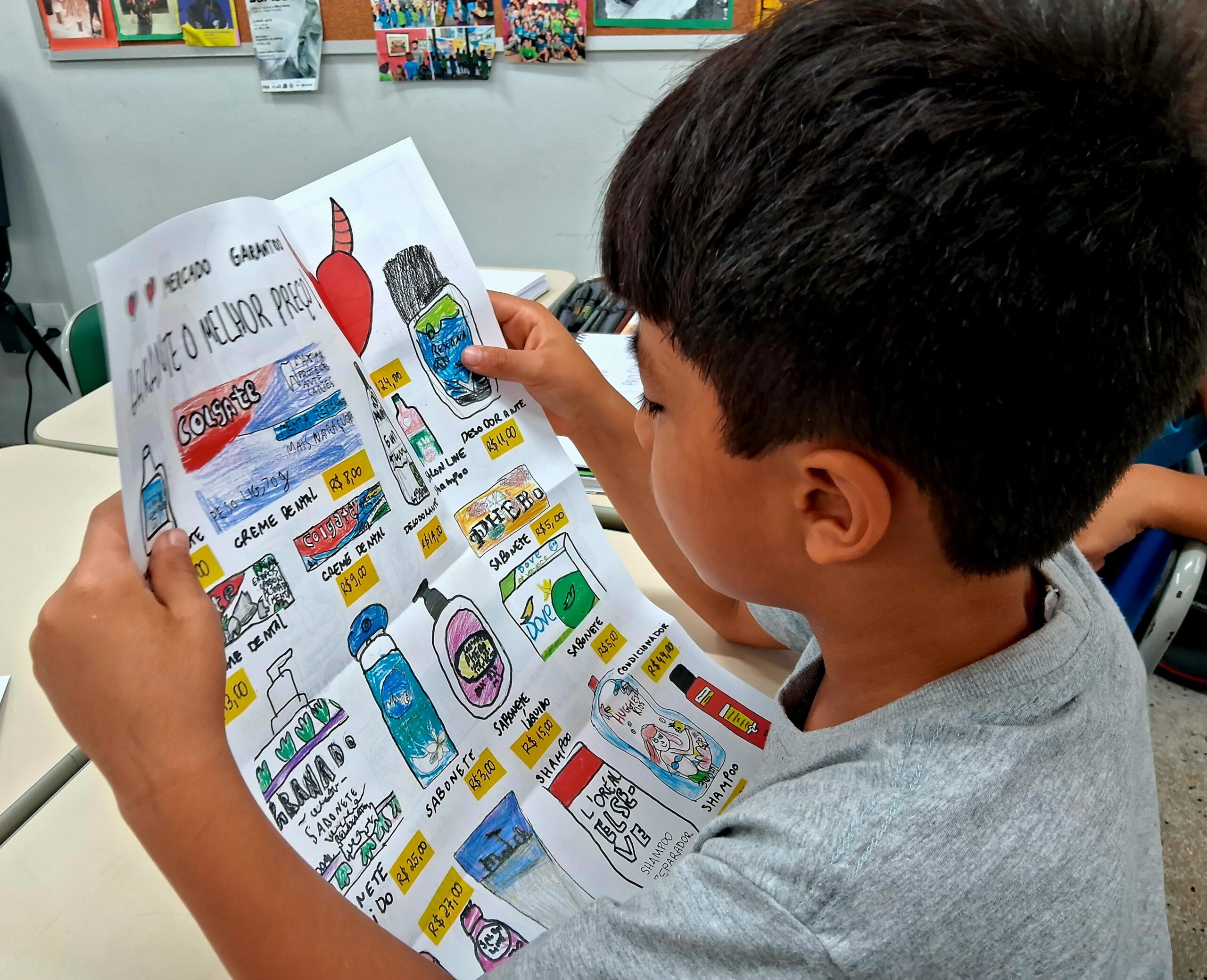 De volta à Pereirinha, o mercadinho ainda rendeu boas atividades. Qual o produto mais caro do encarte? E o mais barato? Como podemos formar esse valor de maneiras diferentes usando cédulas e moedas? Fizemos listas de compras, somamos preços e brincamos mais vezes com dinheirinho.