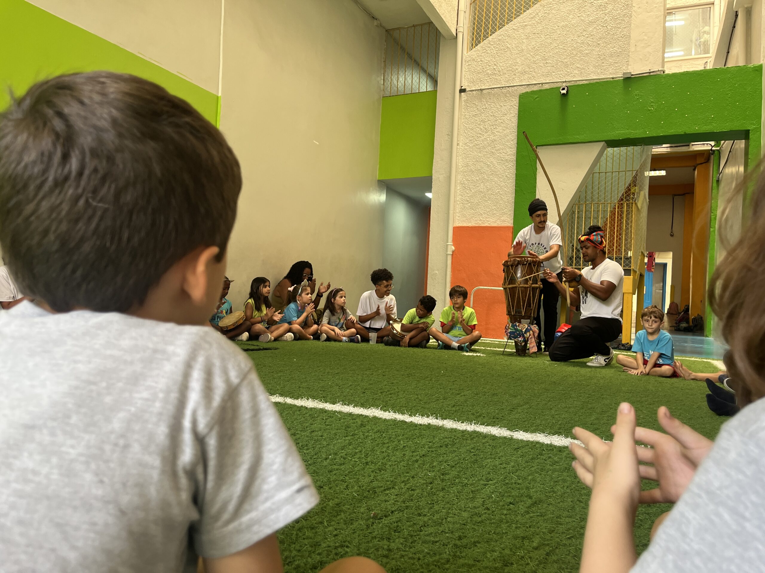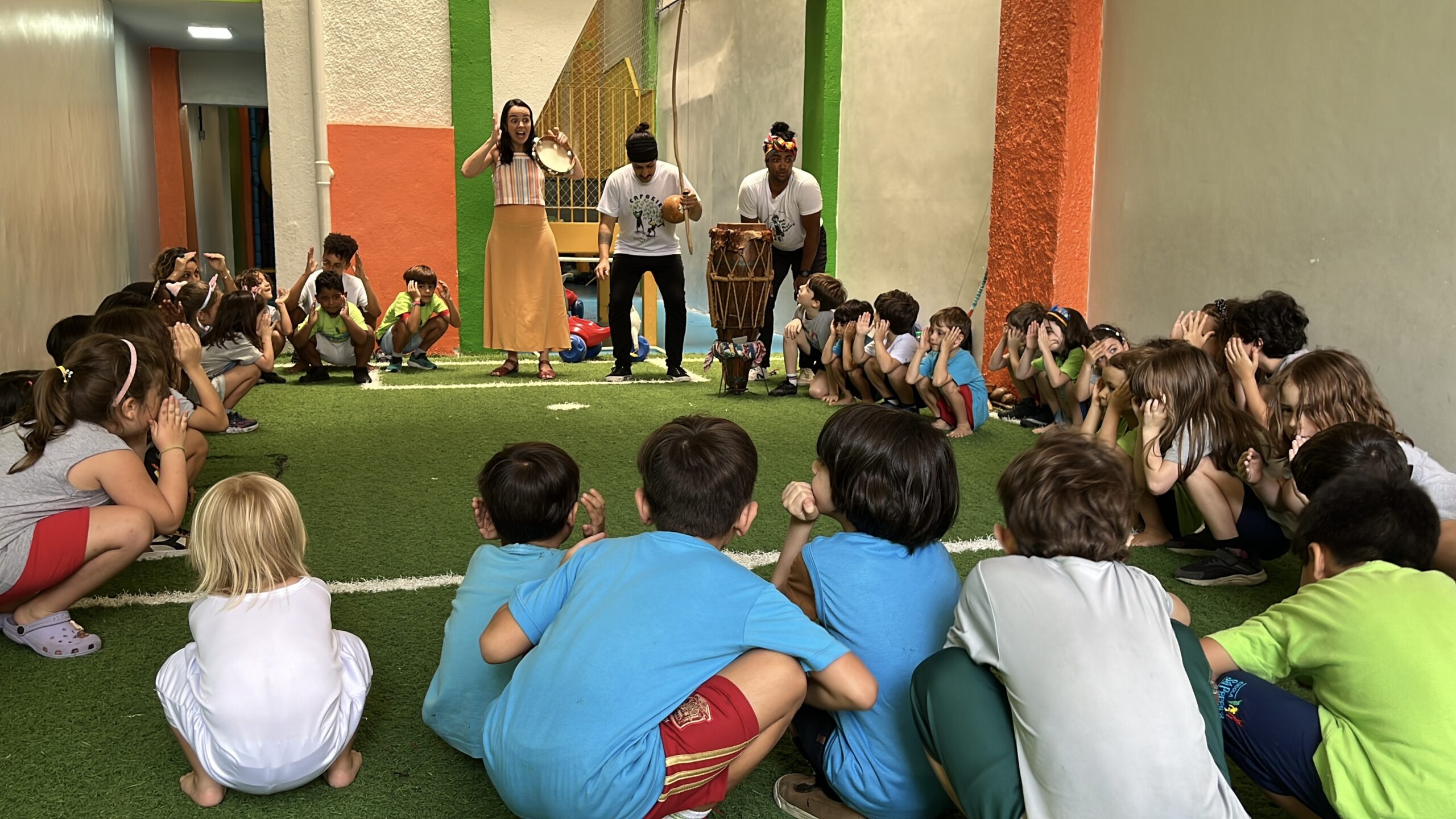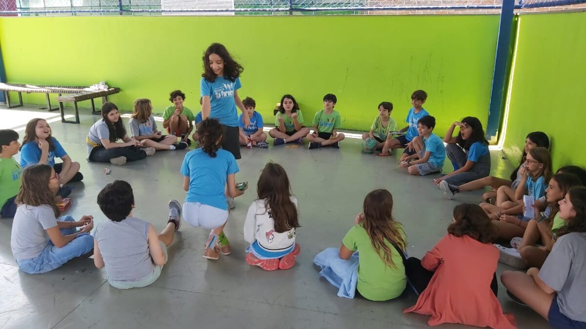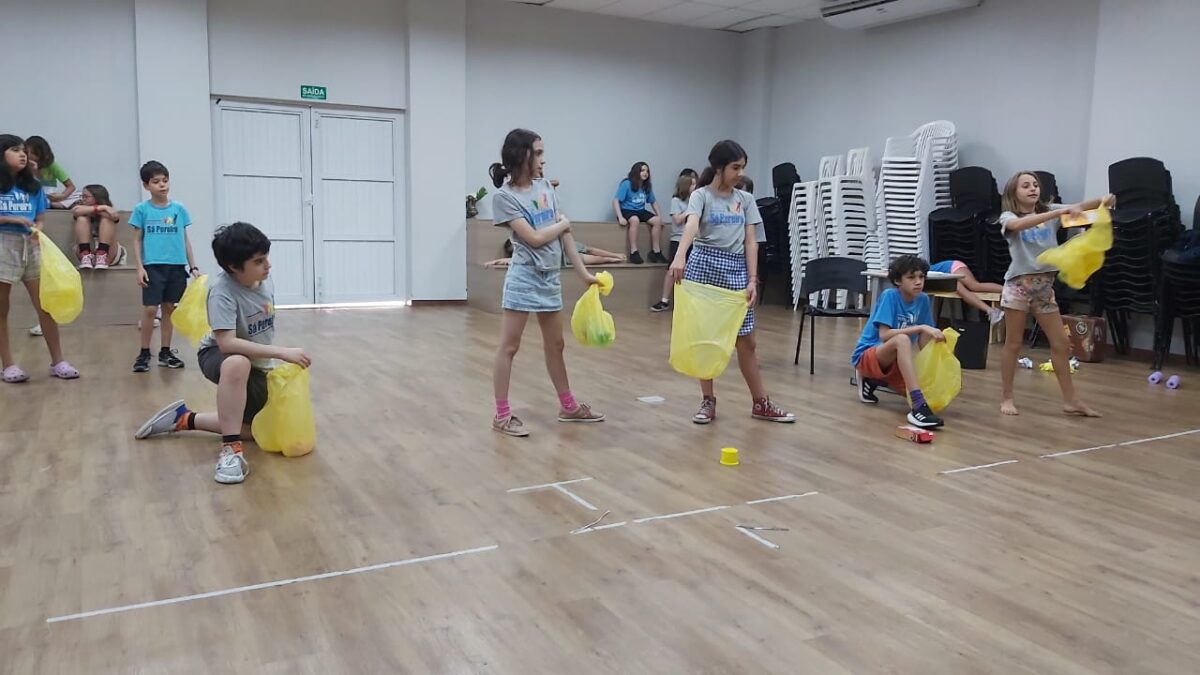 Experimentamos jogos de equilíbrio da Ioga, aprendemos a tocar as estacas do mineiro-pau nas aulas de Cultura Popular e nos divertimos com os elementos da natureza com o grupo Moleque Mateiro.
