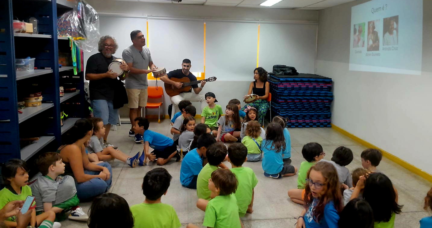 As turmas do Samba e da Memória terminaram o ano com duas visitas muito especiais. Maria, irmã da Antônia, veio tocar pandeiro com as turmas e Bruno, pai do Luca, falou um pouco do seu trabalho como sambista.