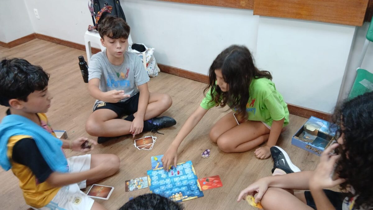 Na Oficina de Jogos e Brincadeiras, aprendemos a jogar Pique-Bandeira e Yoté, desenvolvendo estratégias, cooperação e respeito às regras. Também produzimos um livro, um jogo de trilha integrando criatividade e expressão. Foi muito legal!