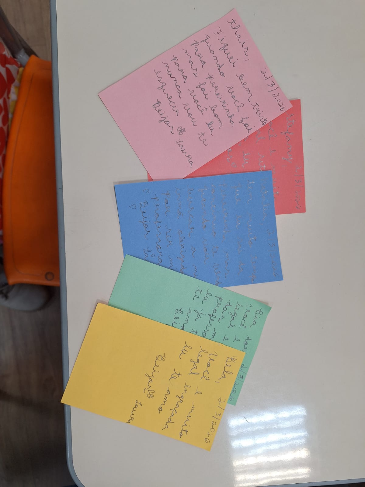No início do trabalho com o gênero bilhete, as famílias das F3 foram convidadas a escrever uma mensagem para as crianças. Cada bilhete chegou com um estilo próprio: alguns traziam lembretes, outros eram mais divertidos, com brincadeiras e piadas, e havia também aqueles que faziam convites ou deixavam palavras de incentivo.