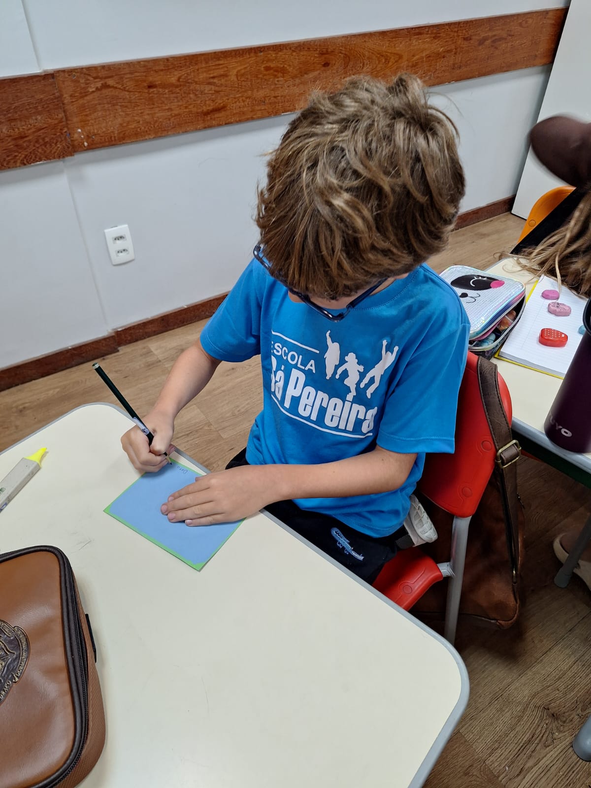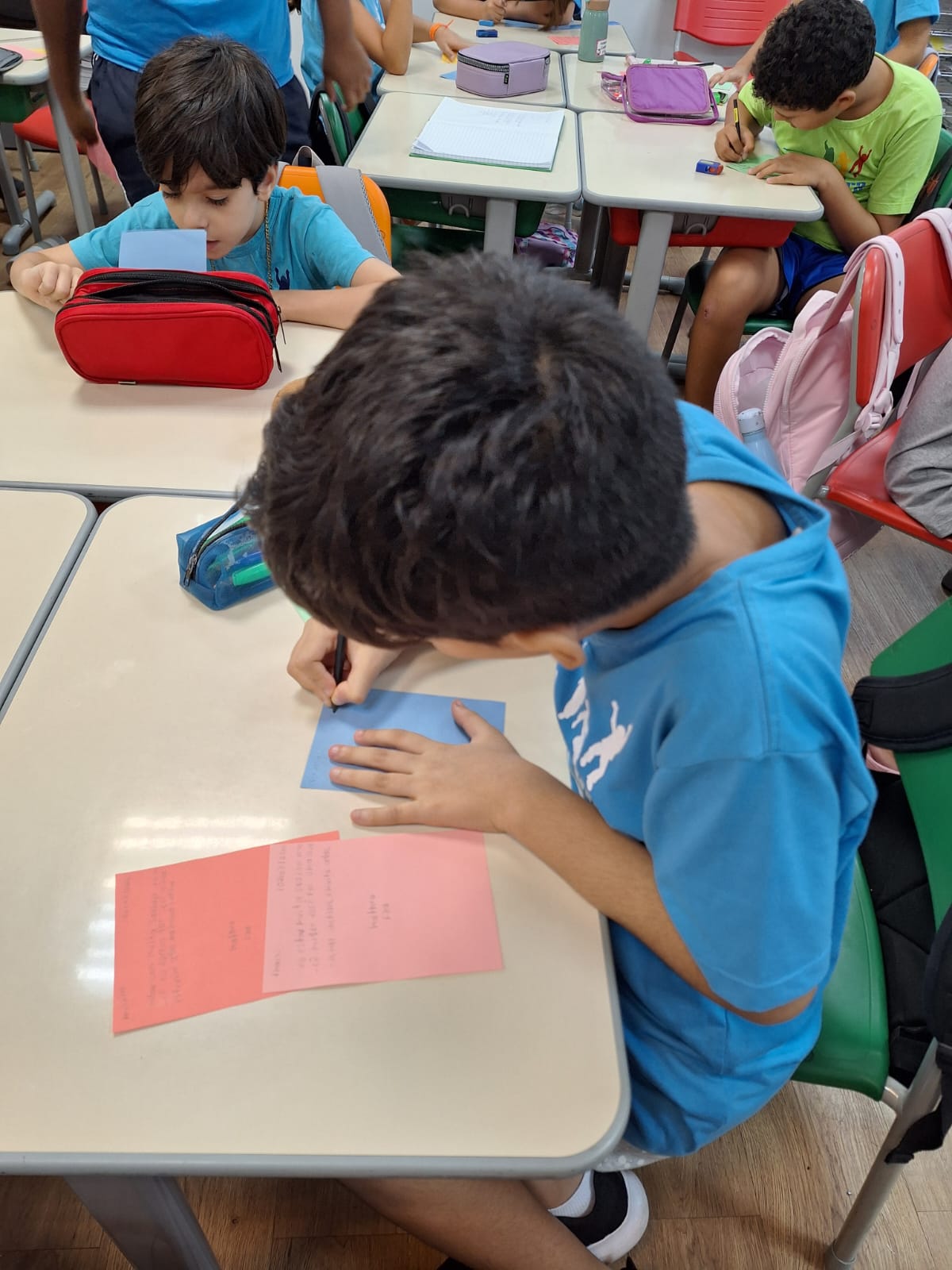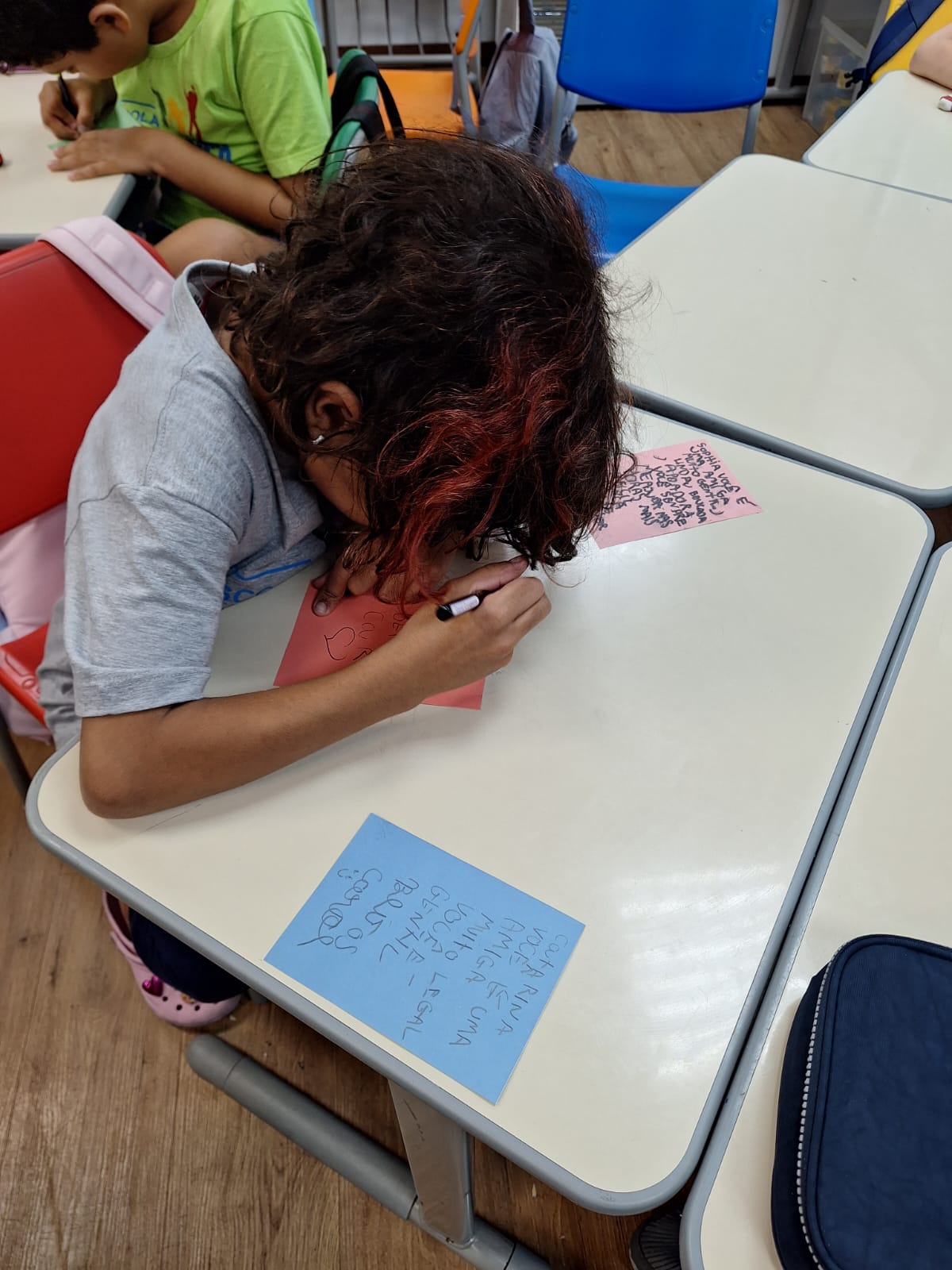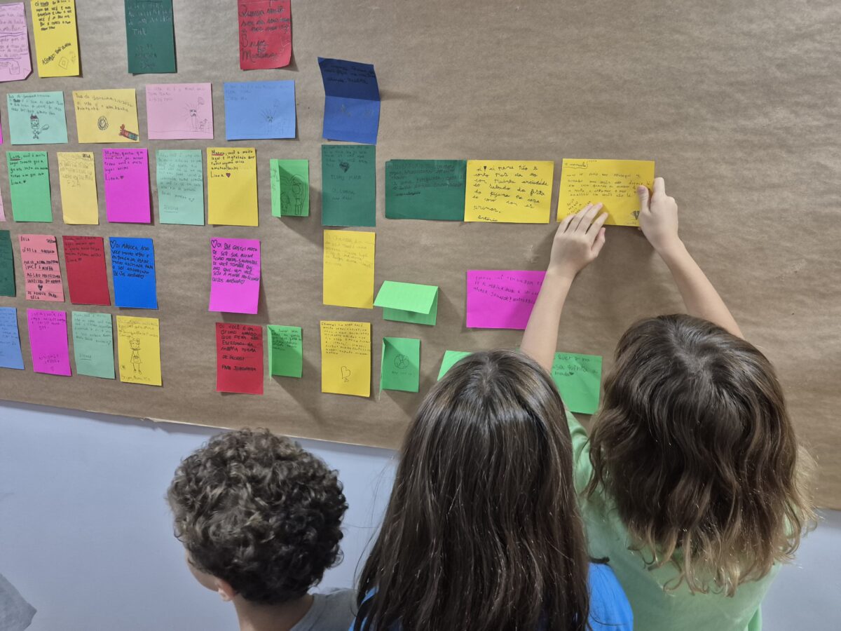 Em seguida, as turmas passaram da leitura à escrita. As crianças produziram seus próprios bilhetes, destinados aos amigos da escola. Com eles, montaram um mural coletivo, criando um espaço de troca de mensagens para expressar saudades, demonstrar carinho e convidar colegas de outras turmas para brincar.