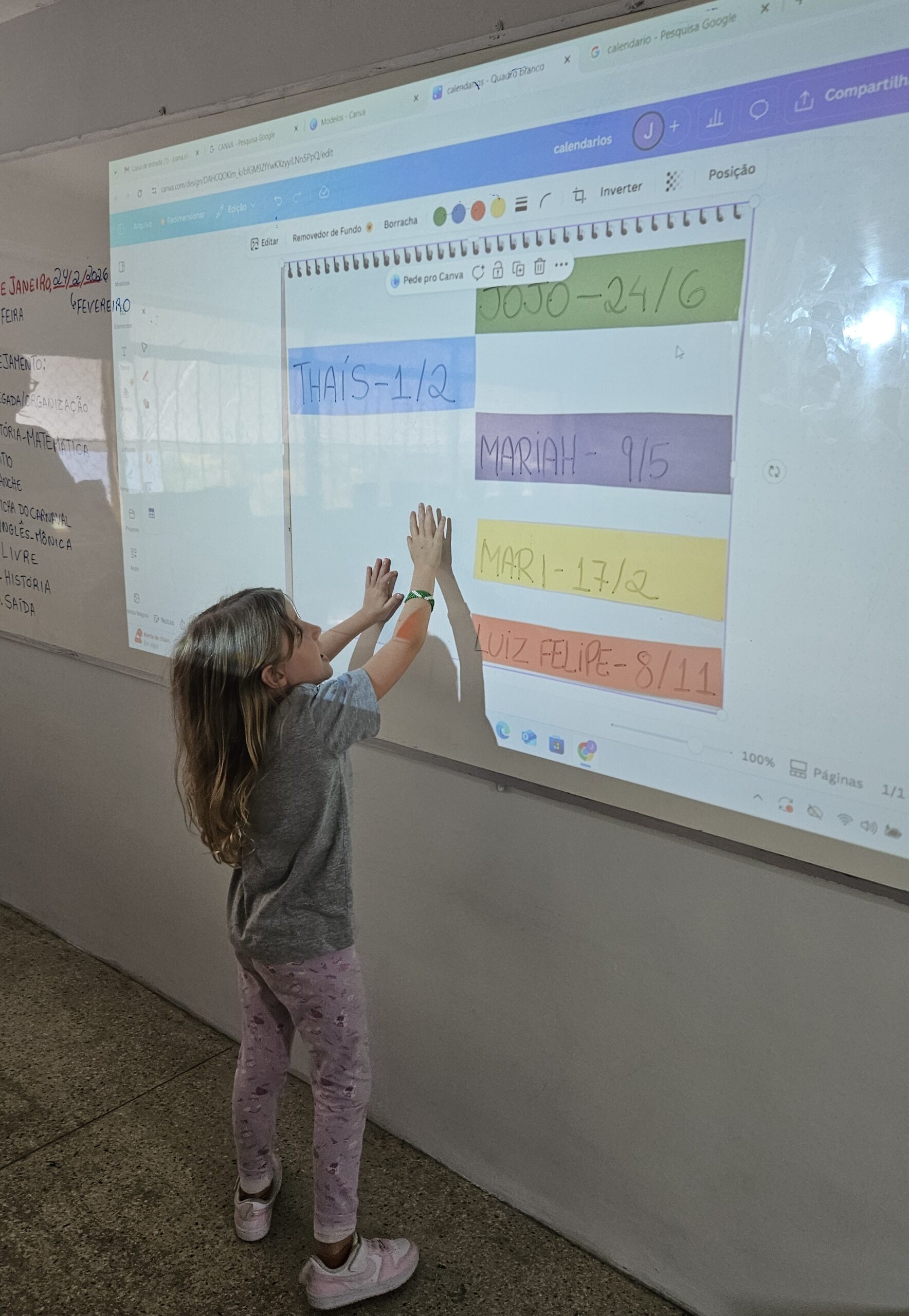 Aproveitamos para marcar as datas dos eventos importantes das turmas, como  início das aulas e o dia do bloco Sá Pereira, e construímos juntos um mural dos aniversários na sala.