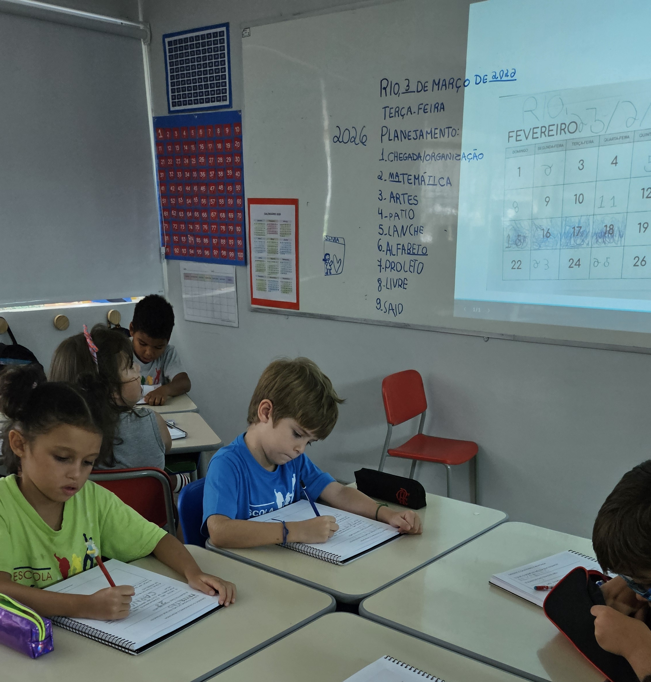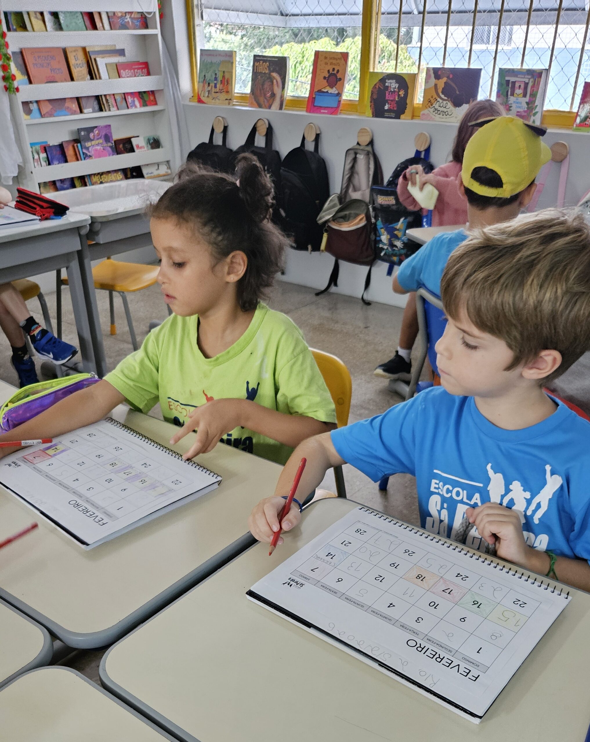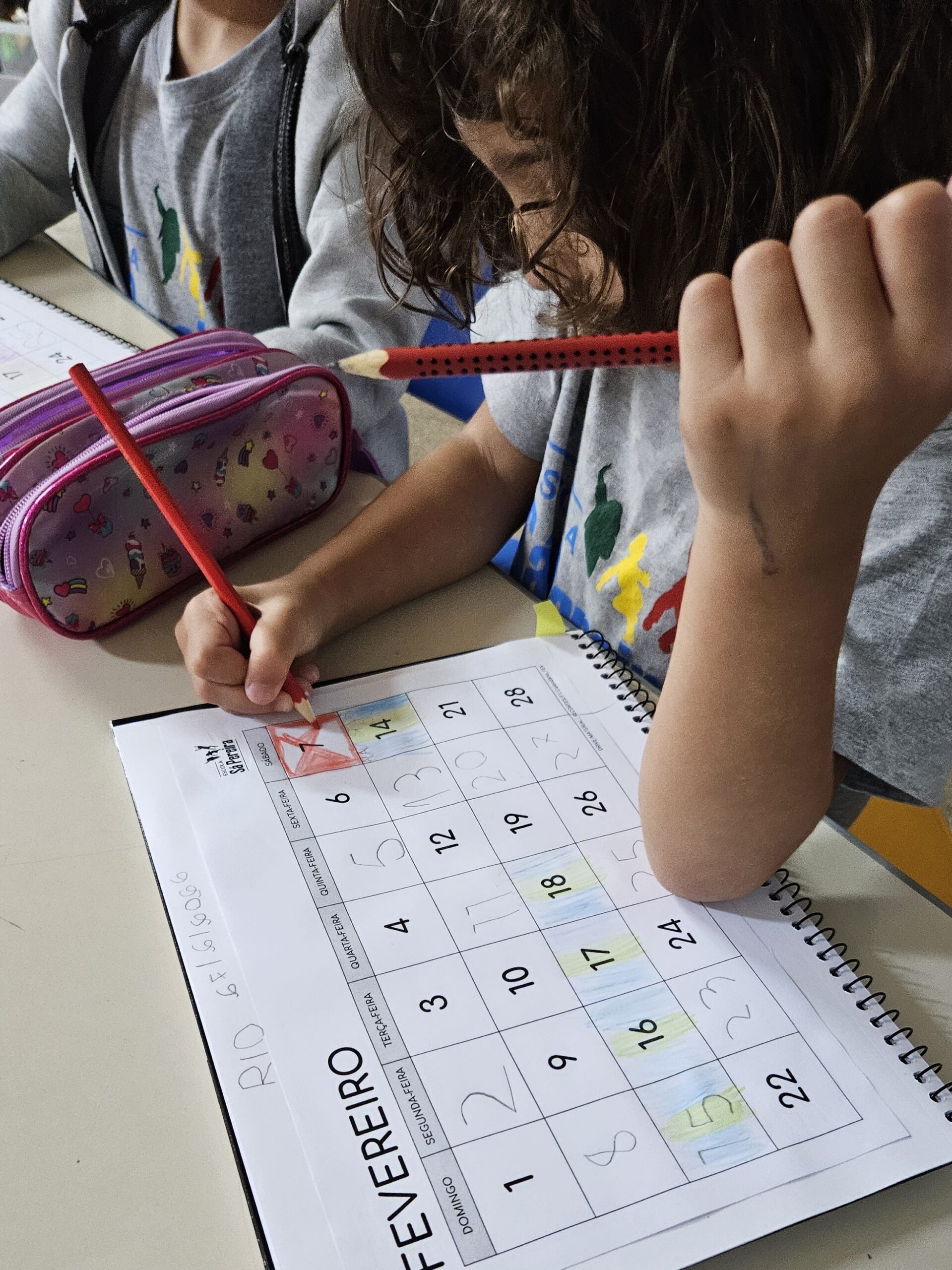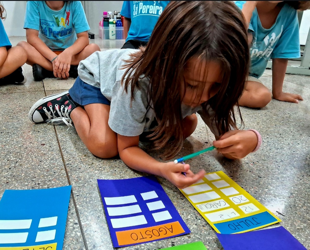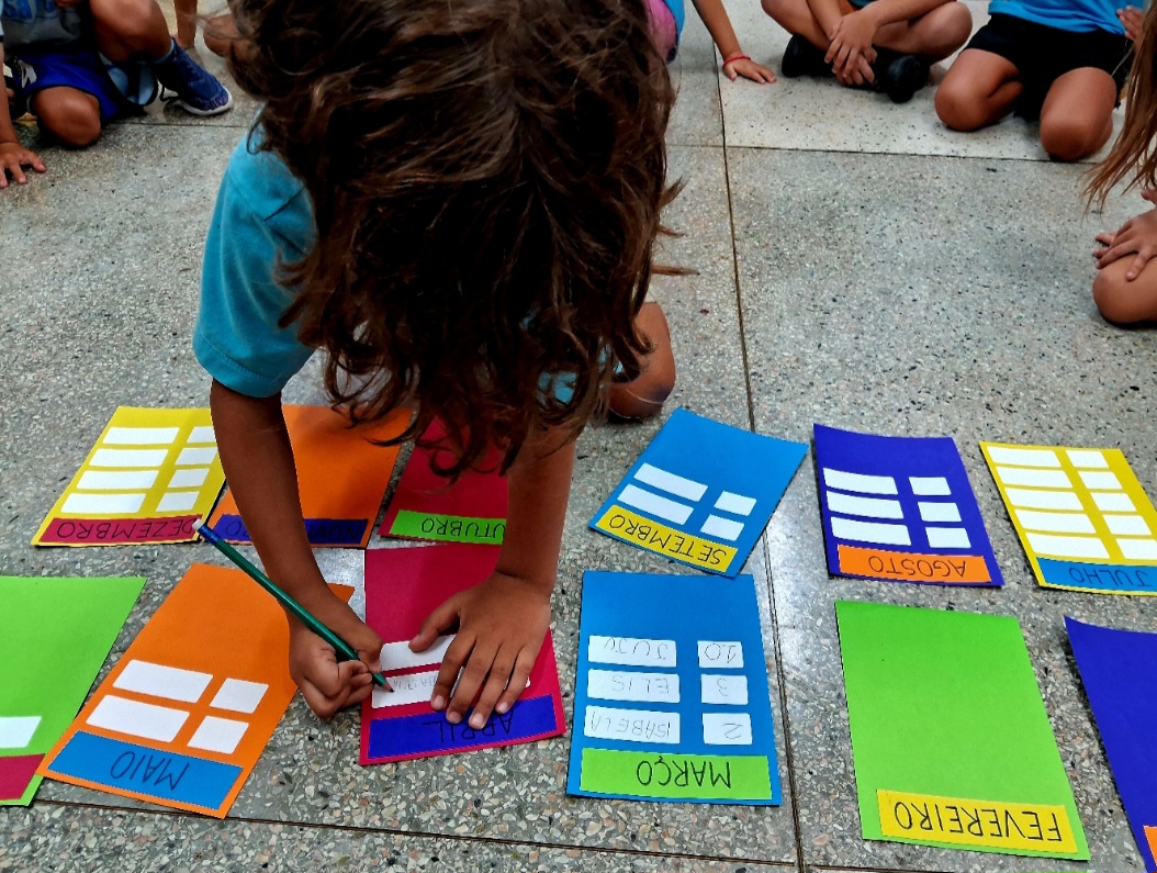 As crianças compartilharam seus conhecimentos prévios e, aos poucos, vão se apropriando da matemática dessa ferramenta que conta o tempo. Os calendário anual e também os de Janeiro e Fevereiro foram para o caderno junto com alguns desafios: descobrir os números que faltam, os nomes dos meses e perceber quantos dias tem cada mês.
