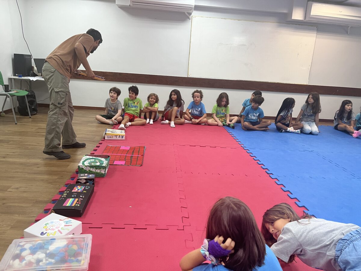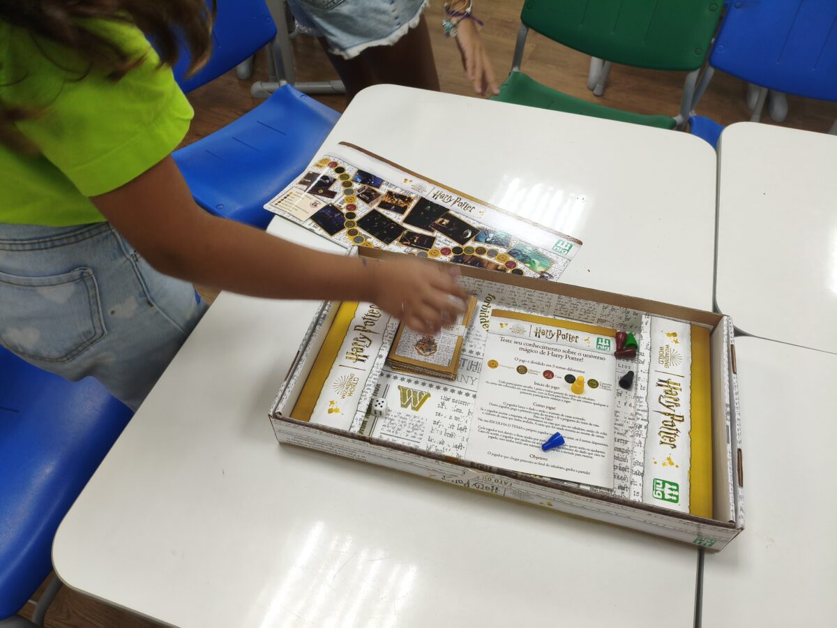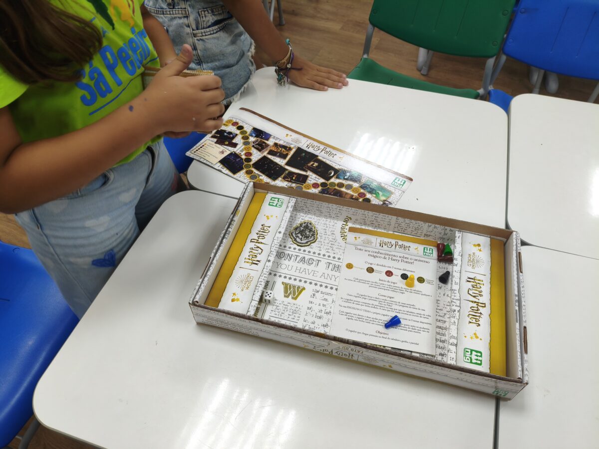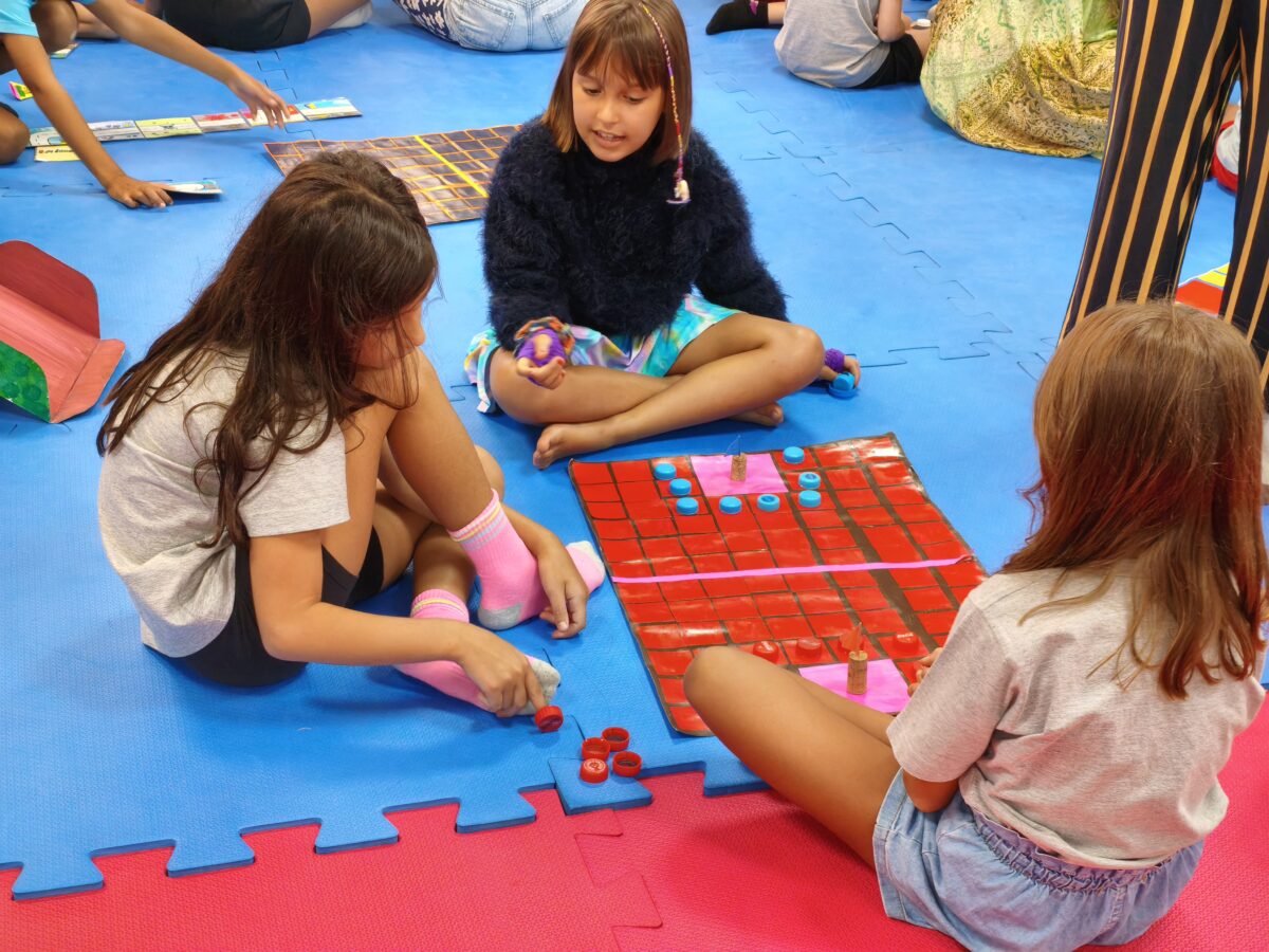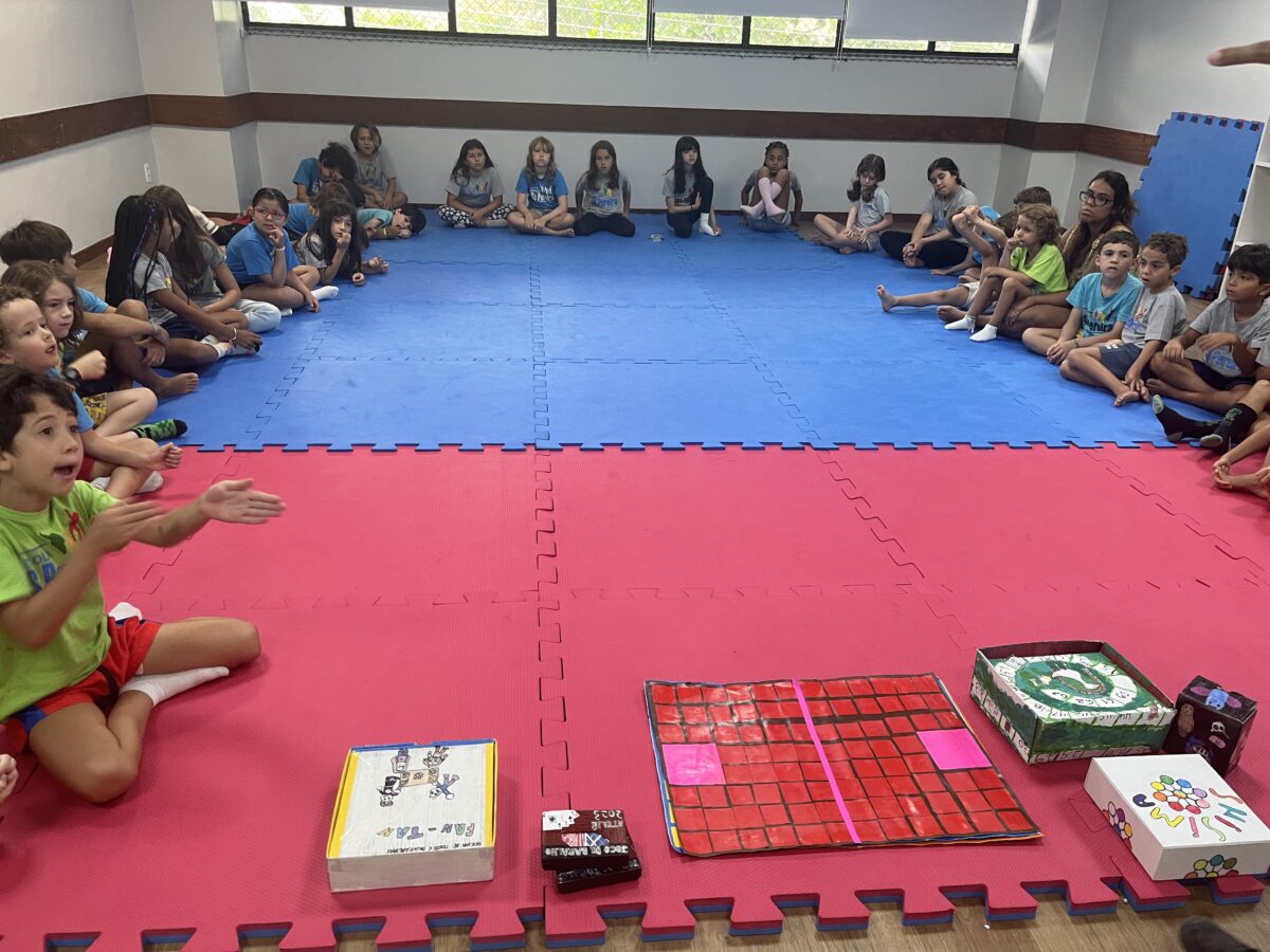 As crianças que já conheciam os jogos criados nos anos anteriores tornaram-se verdadeiras anfitriãs: apresentaram as caixas, as peças e compartilharam as histórias por trás de cada criação. As novas participantes ouviram com atenção e logo estavam mergulhadas nas partidas, explorando estratégias e possibilidades.