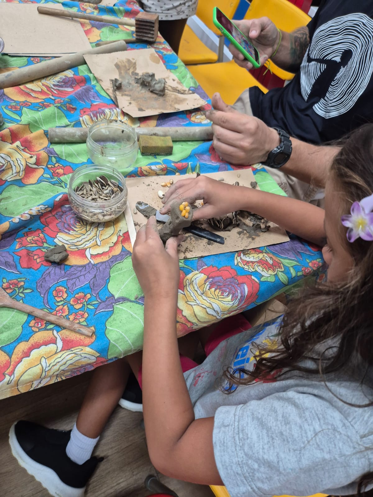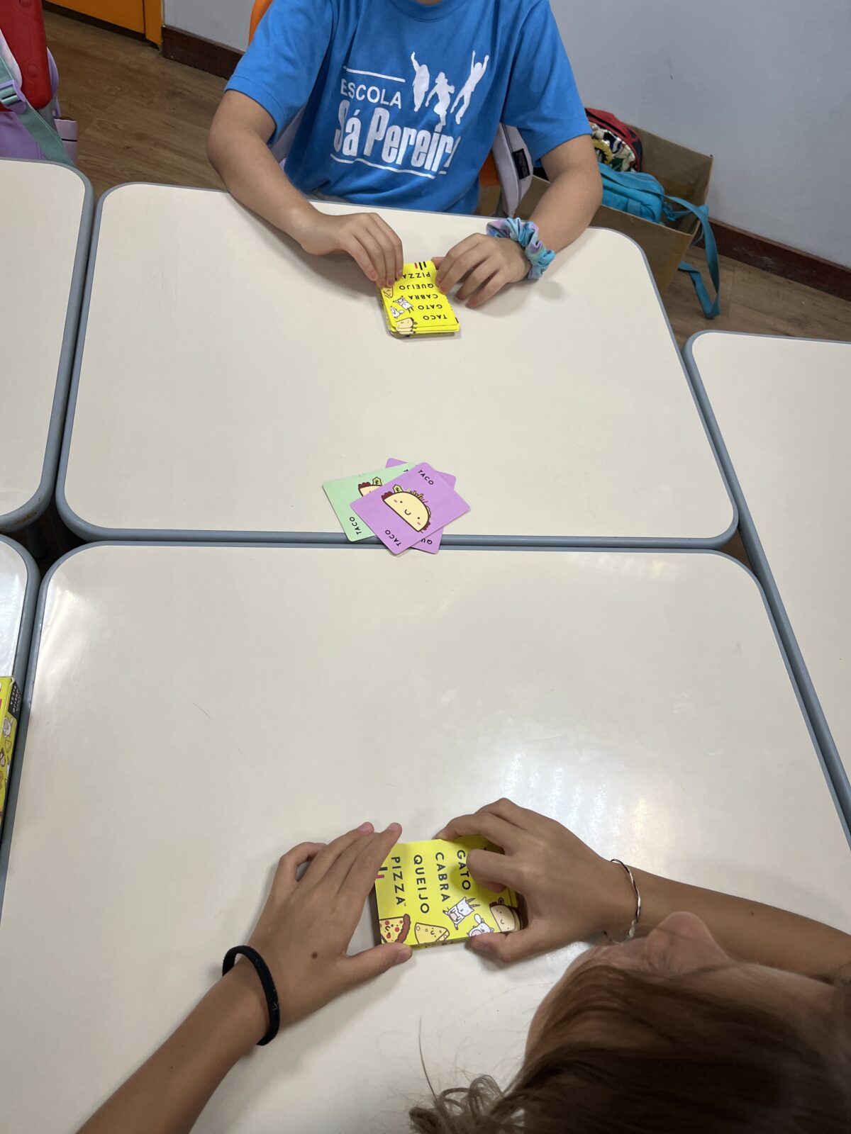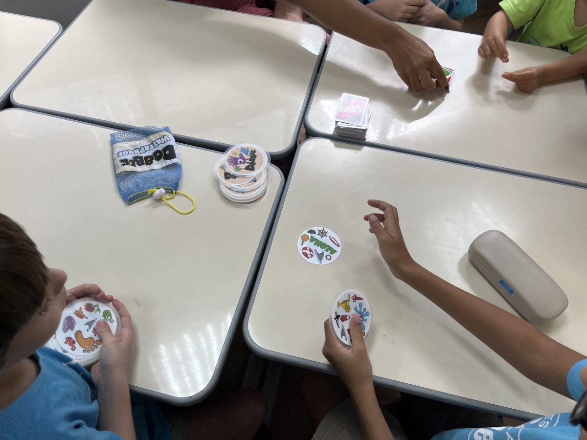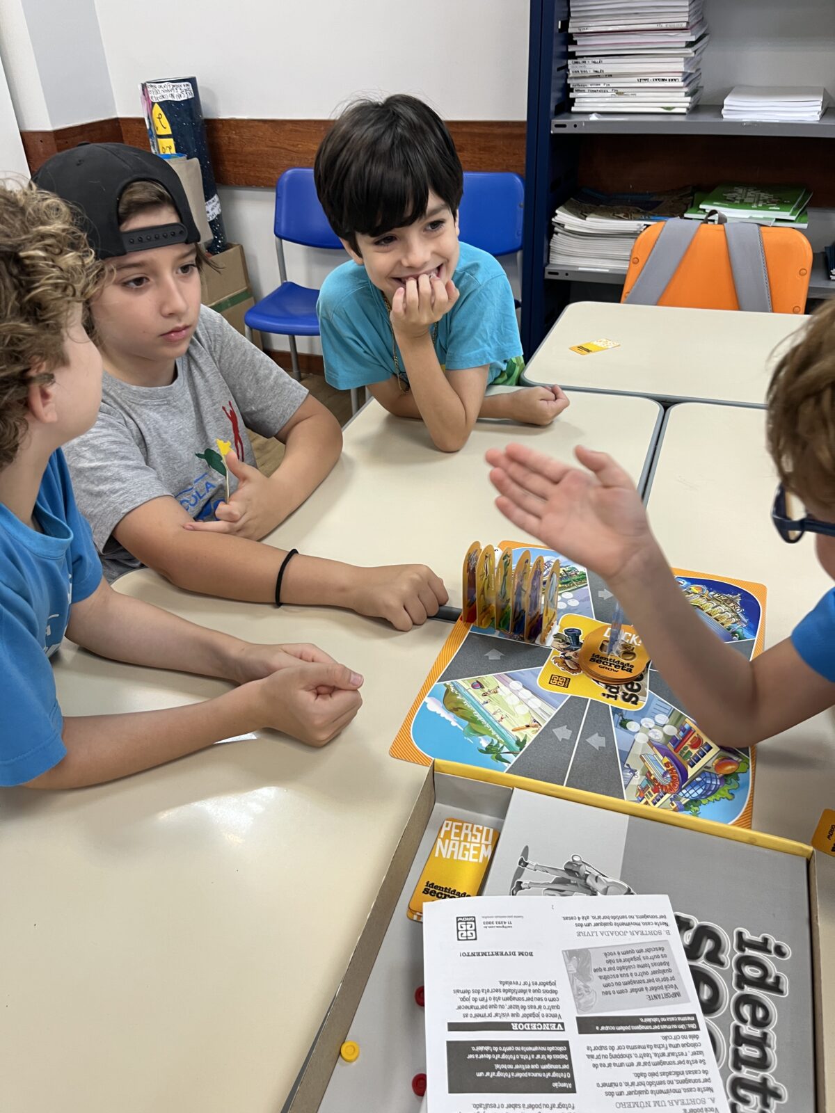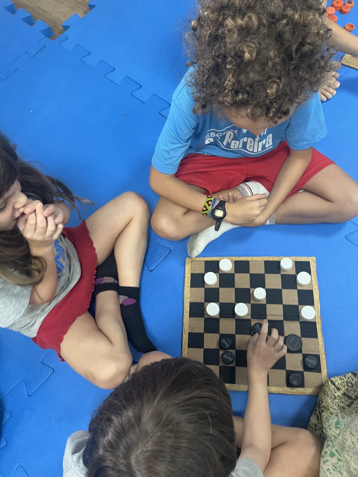 As crianças que já conheciam os jogos criados nos anos anteriores tornaram-se verdadeiras anfitriãs: apresentaram as caixas, as peças e compartilharam as histórias por trás de cada criação. As novas participantes ouviram com atenção e logo estavam mergulhadas nas partidas, explorando estratégias e possibilidades.