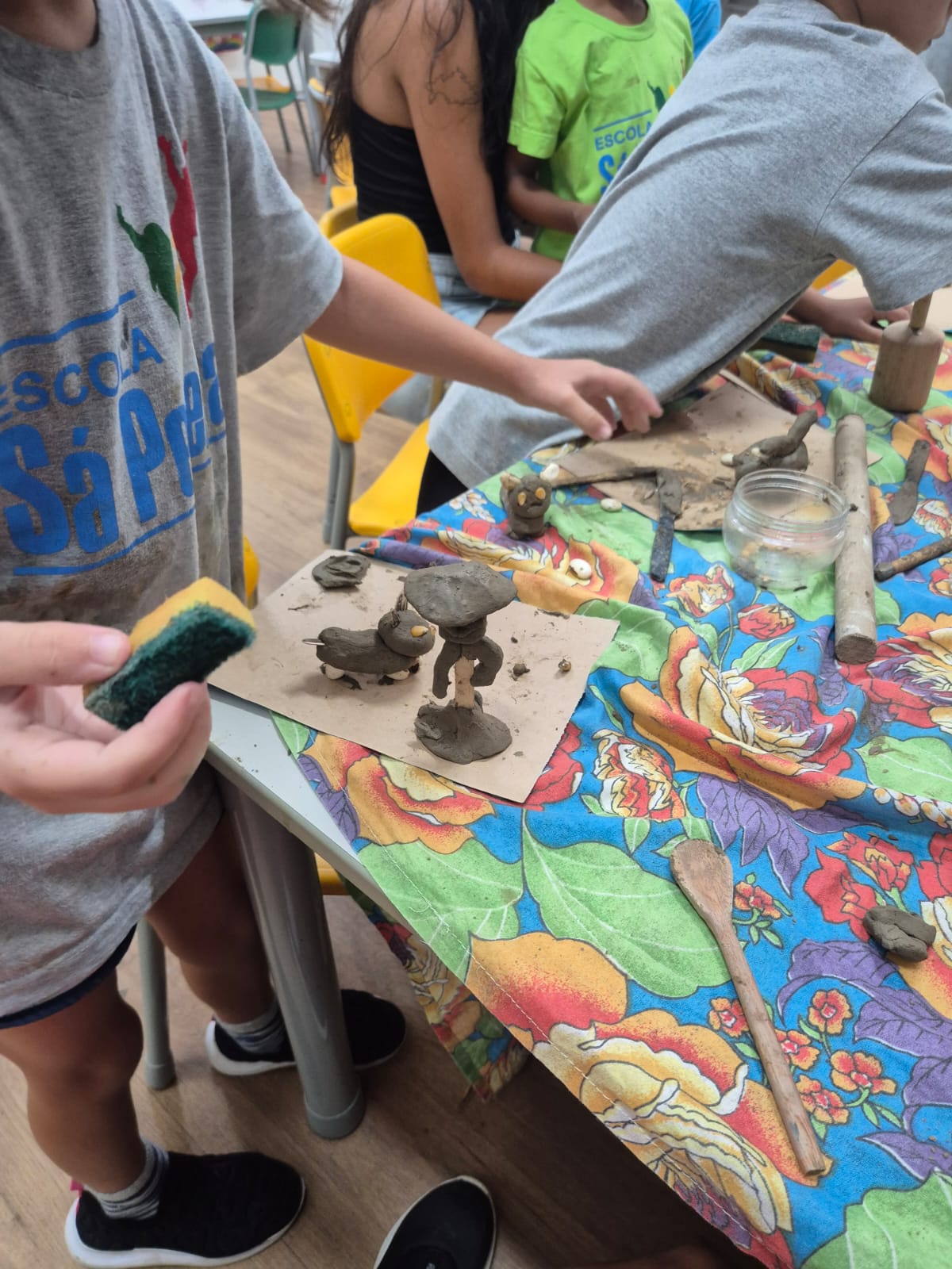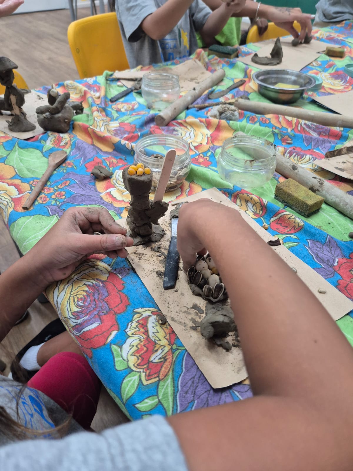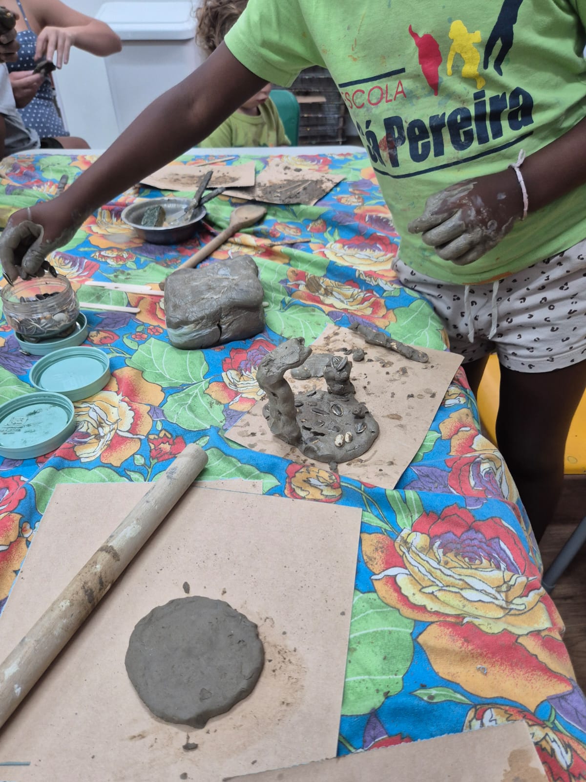 Para dar início a essa jornada de descobertas, começamos pelo elemento terra, investigando a argila e suas possibilidades. Durante a experiência, as crianças puderam observar e sentir suas características, descobrindo diferentes texturas, percebendo seus cheiros, explorando sua temperatura e notando as transformações que acontecem ao ser manipulada. Por fim, colocamos a “mão na massa”, permitindo que a imaginação conduzisse o processo criativo.
