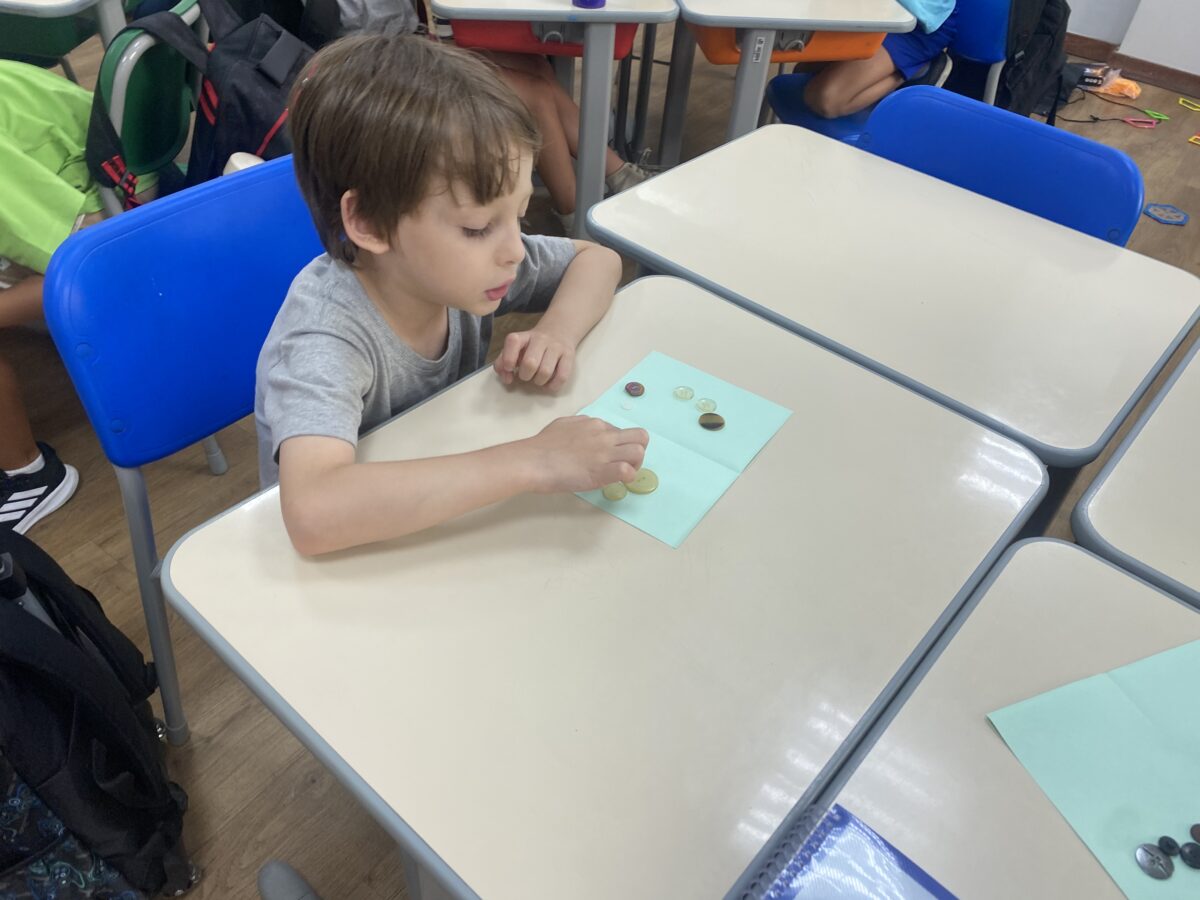 Em Matemática, iniciamos o ano investigando o que as F2 já sabem e construíram ao longo de suas experiências. Propusemos diferentes atividades para que percebessem a presença da Matemática no cotidiano e retomassem conteúdos trabalhados na F1.