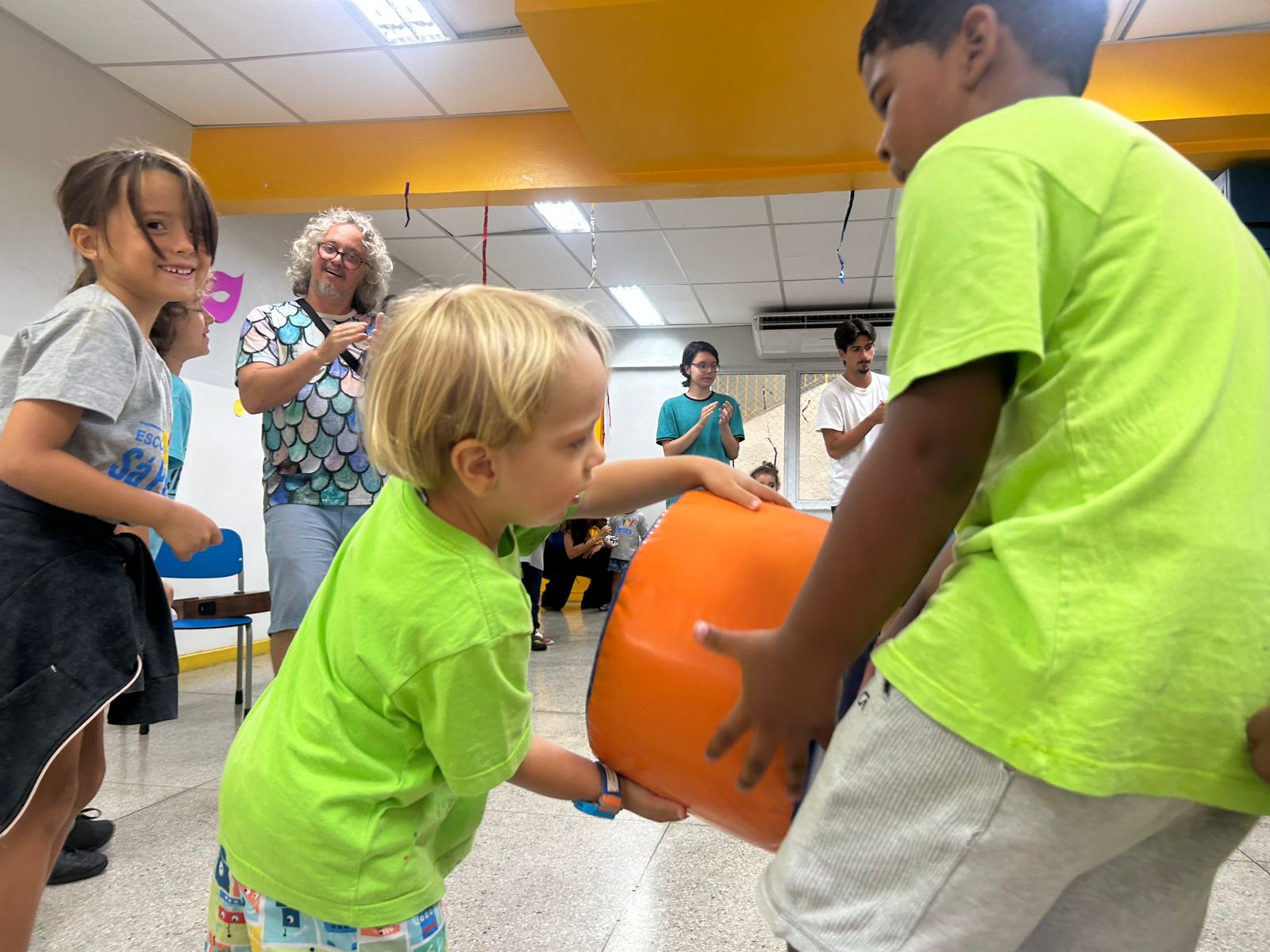 Nessa dinâmica, os professores ocupam o lugar de alunos, experimentando as propostas elaboradas por seus colegas, vivenciando jogos, dinâmicas e situações de aprendizagem. Além da experiência prática, há um espaço de troca entre os diferentes segmentos, que alimenta o coletivo com perguntas, ideias e possibilidades para o ano que se inicia.