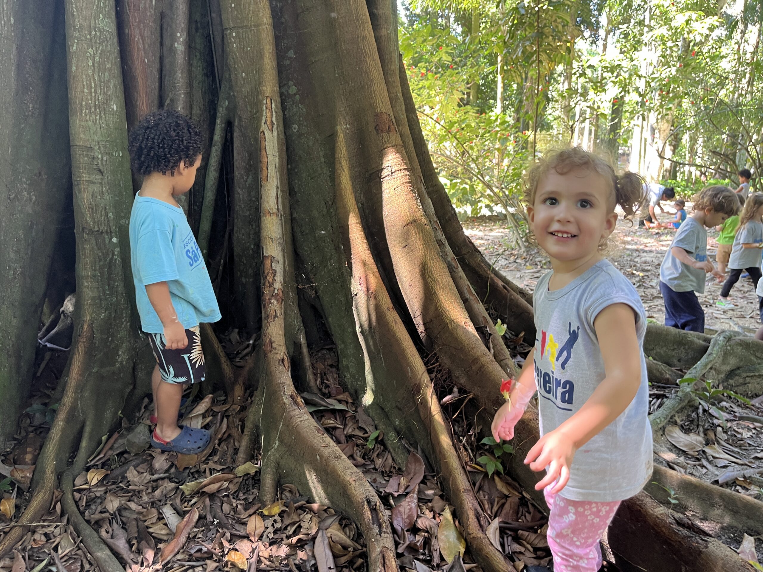 Ao chegarmos, fomos surpreendidos por uma família de macacos-prego. Durante a visita, exploramos a natureza do Parque, observando diferentes tipos de plantas, seus tamanhos e formatos, além das variações no solo, como áreas mais secas e outras mais macias.