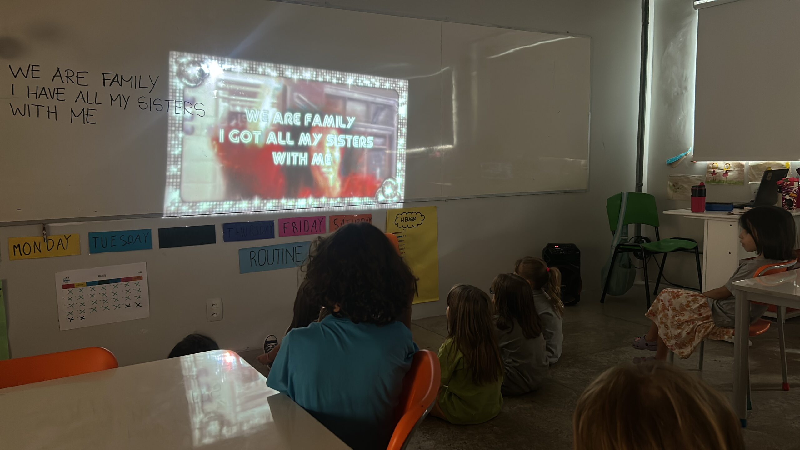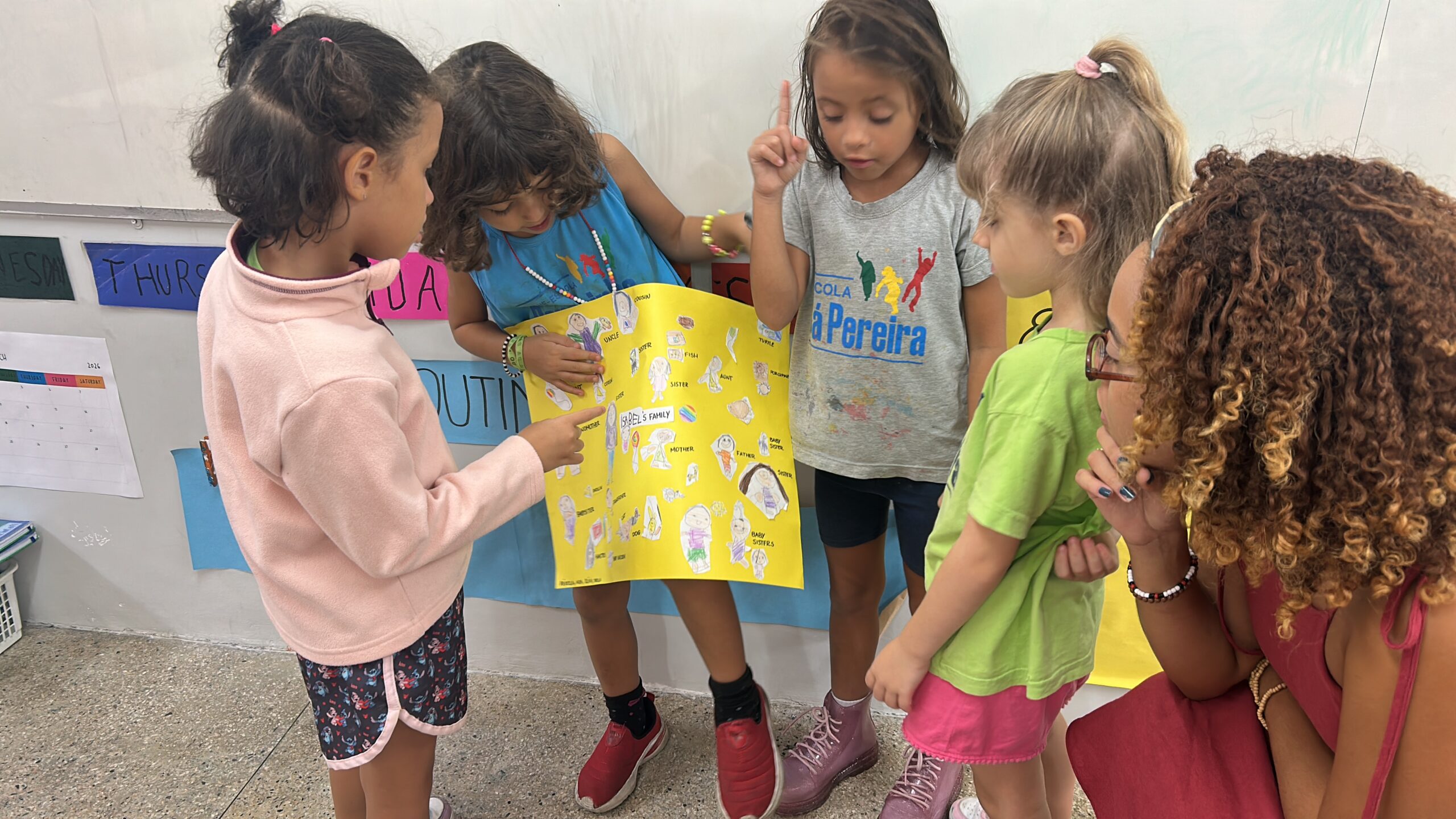 Iniciamos o ano revisando o vocabulário de materiais escolares, retomando conhecimentos que as crianças já vinham construindo com a Teacher Mônica no regular. Também demos início ao material da Kiri, que, neste ano, propõe um projeto literário temático a cada bimestre. Como sensibilização para o tema deste primeiro momento, realizamos a leitura do livro A Family is a Family is a Family, já bastante conhecido pelas crianças em sua versão em português, o que favoreceu conexões e engajamento nas discussões.