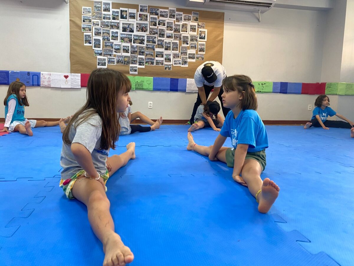 Além disso, as crianças com faixa cinza foram convidadas a demonstrar para os colegas de faixa branca algumas posições e estratégias, mostrando como aplicar as técnicas. Depois das demonstrações, todos tiveram a oportunidade de experimentar os ensinamentos em atividades práticas, treinando a base, a força e os movimentos corporais também durante o sumô.