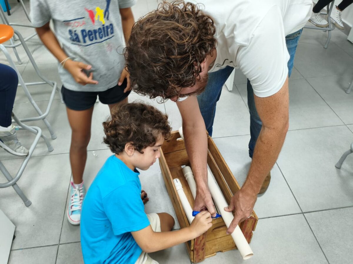 Sempre acompanhadas por um adulto, as crianças cortaram peças de madeira, juntaram bordas, fizeram furos e parafusaram, de modo que todos os suportes e a caixa principal do canteiro fossem montados. Foi um verdadeiro trabalho de marcenaria, alinhando ciência e engenharia. As tubulações de irrigação também foram marcadas e devidamente perfuradas, garantindo um bom fluxo de água.