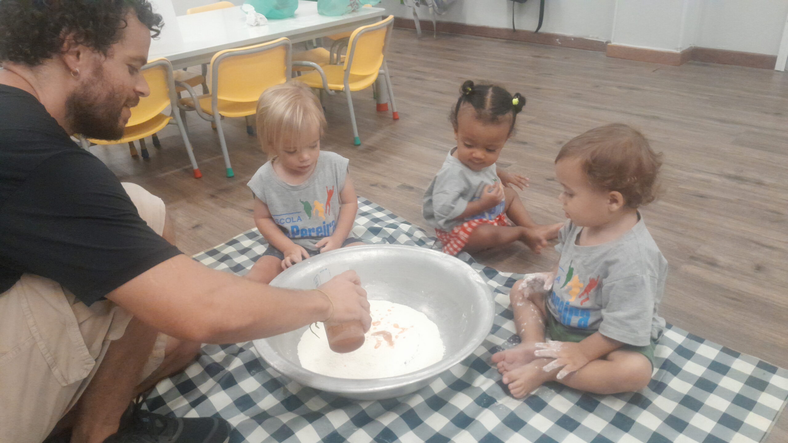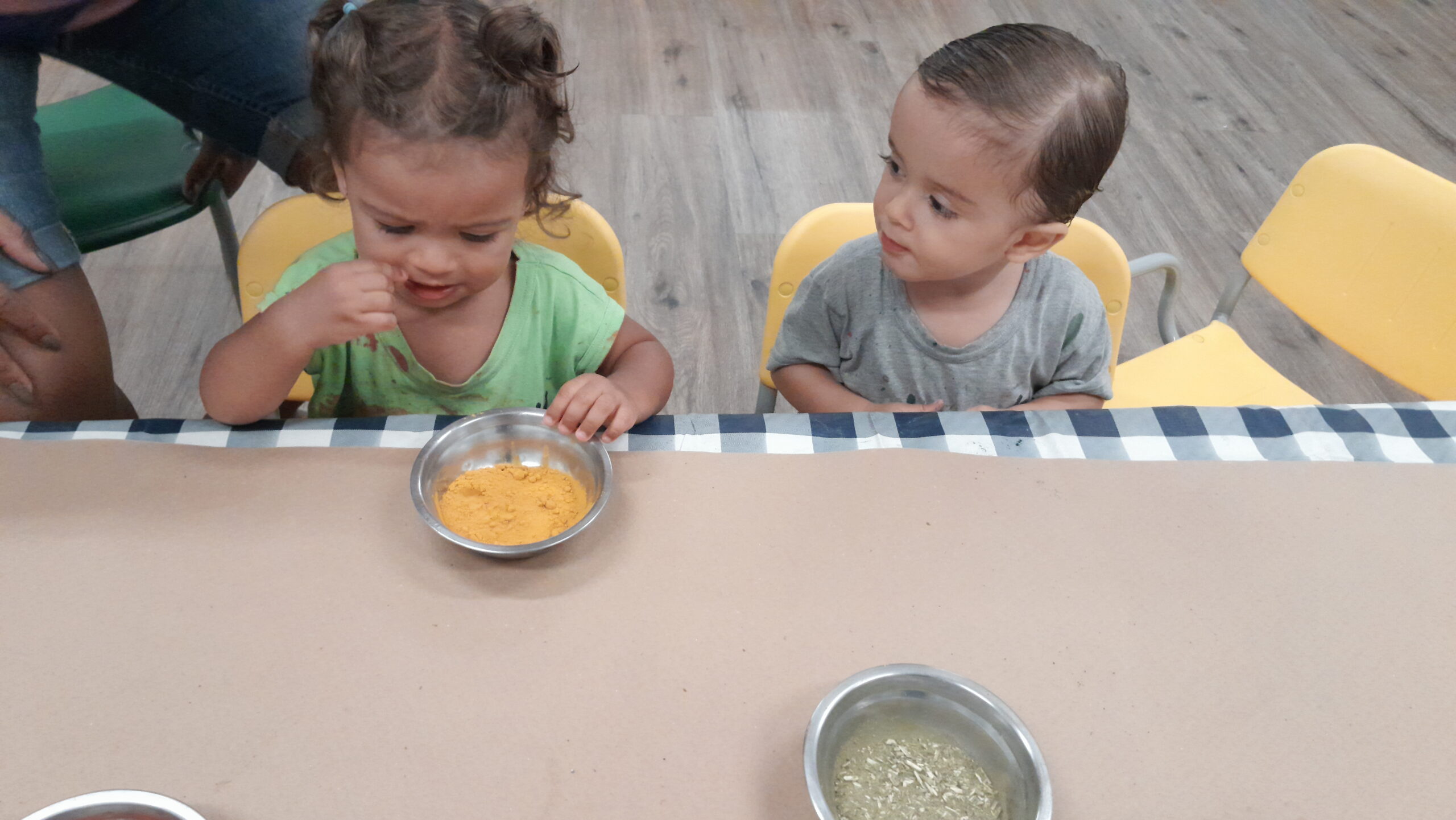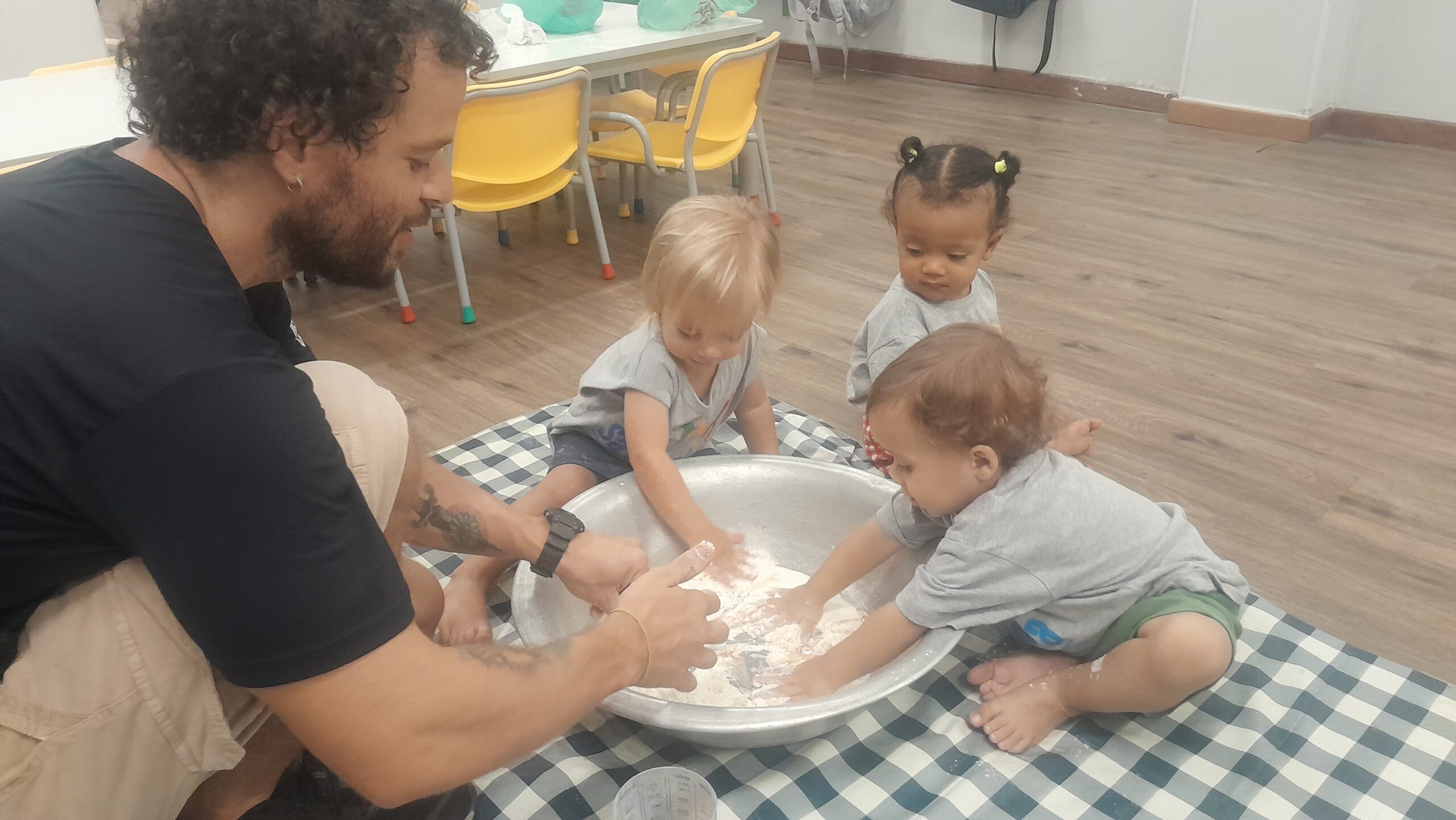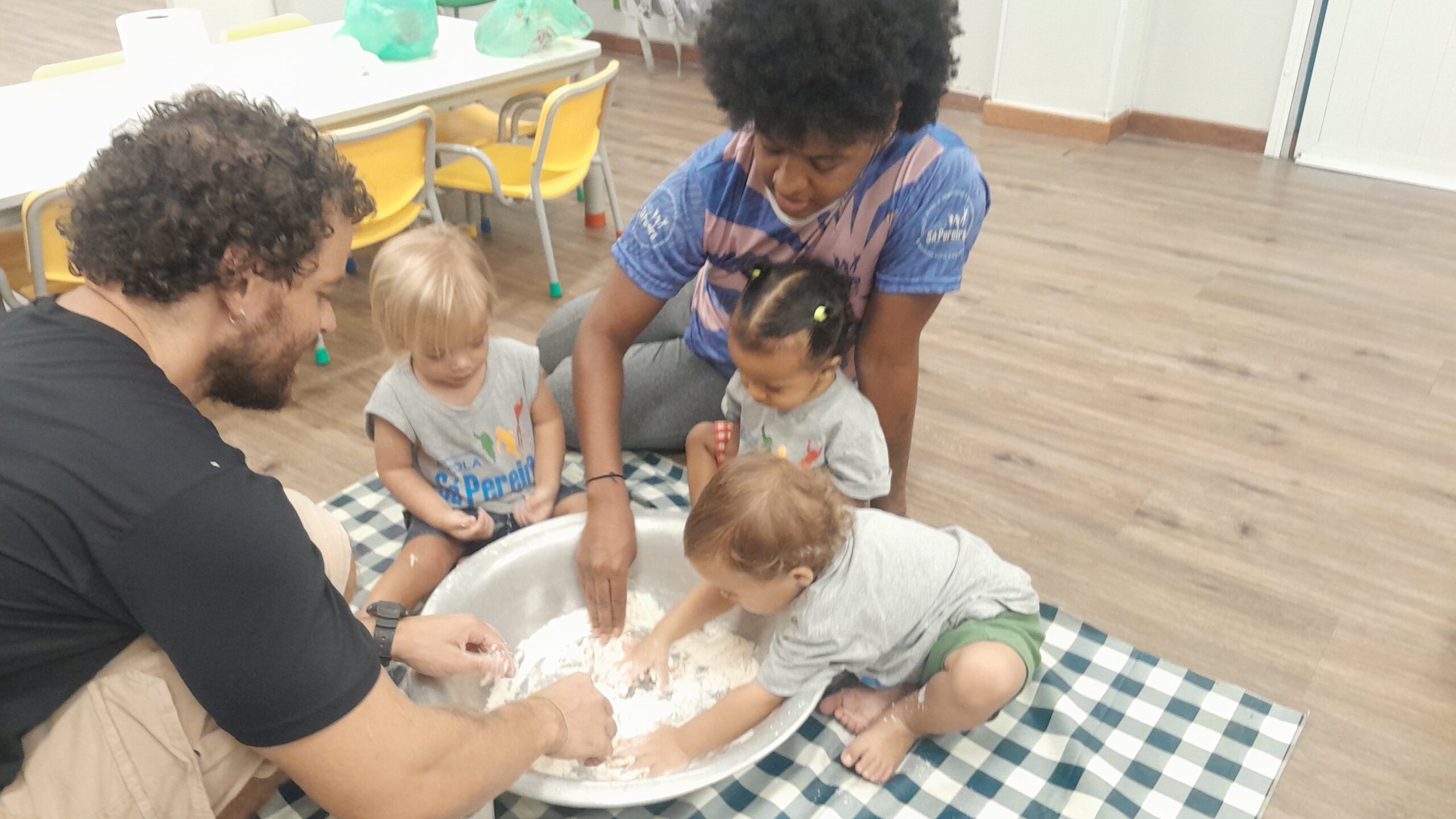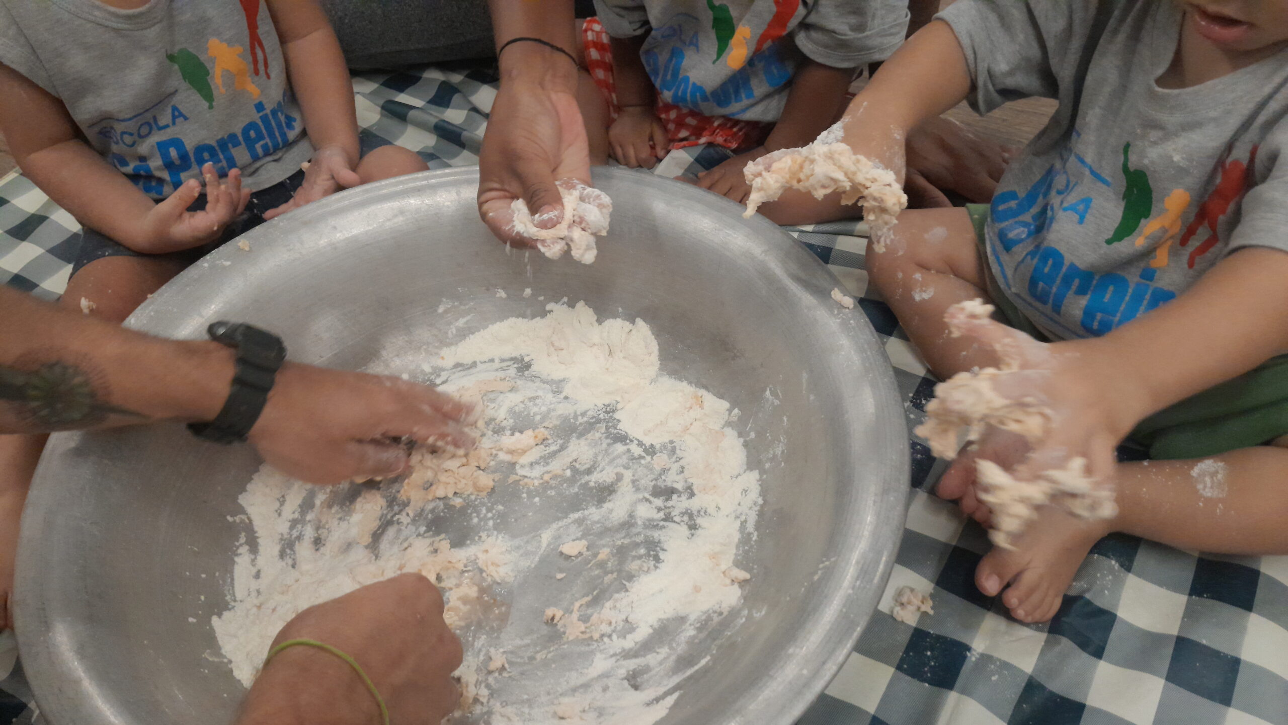 As primeiras experiências com diferentes materiais são fundamentais no desenvolvimento das crianças pequenas, pois estimulam a coordenação motora, a percepção tátil e a descoberta de causa e efeito. Cada gesto, seja misturar os ingredientes ou observar a transformação da massa, contribuiu para a construção de novas aprendizagens.