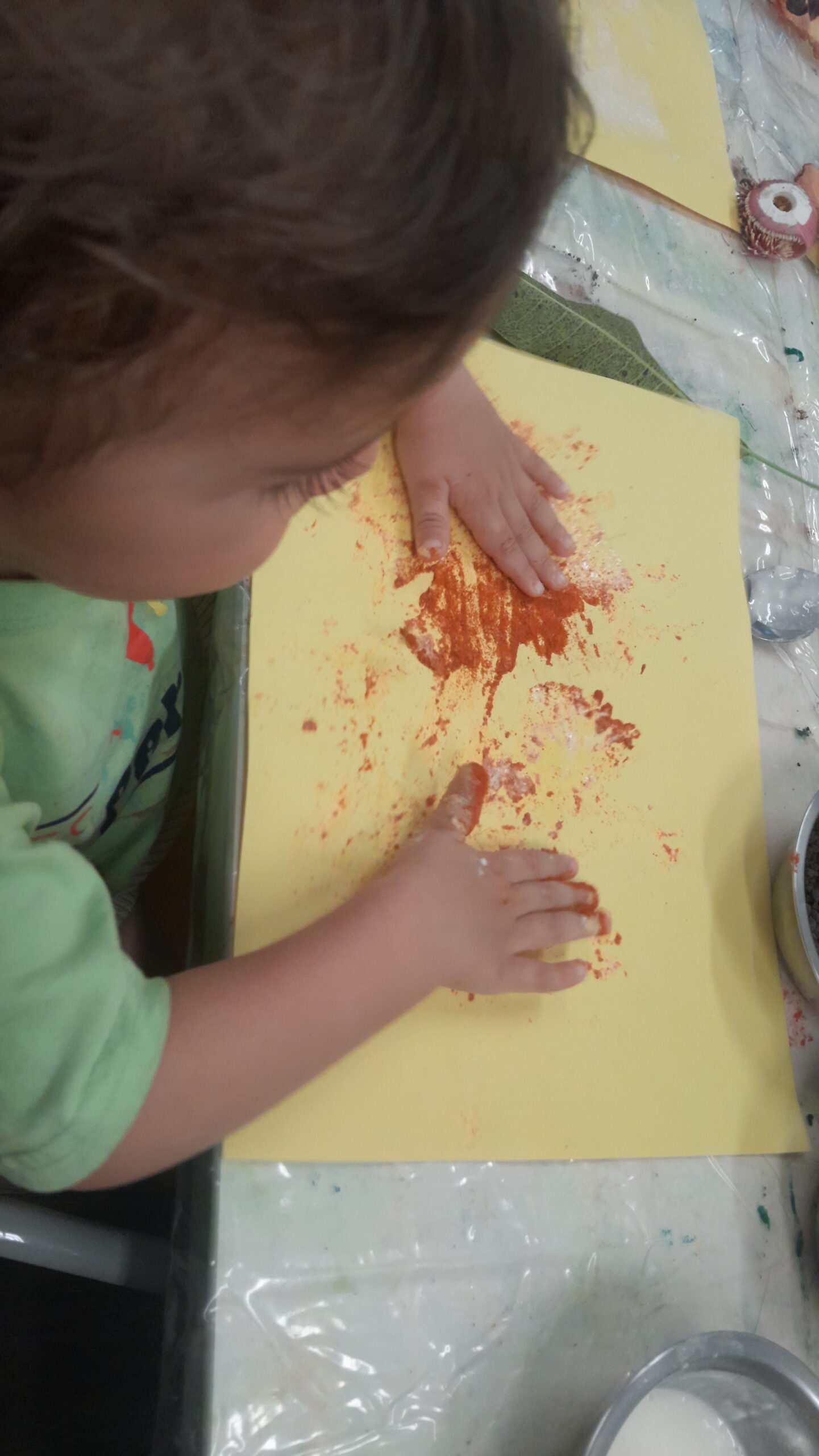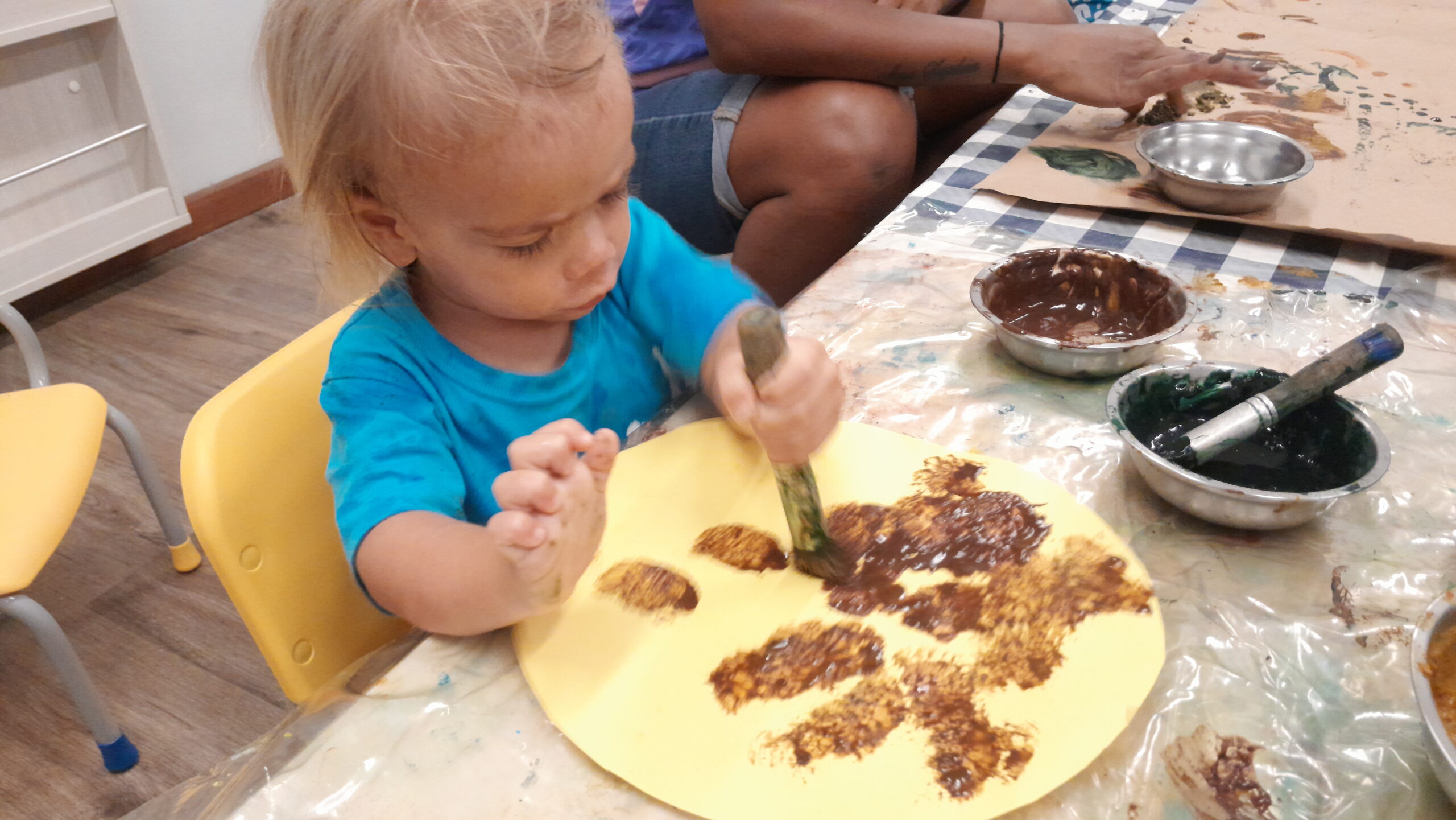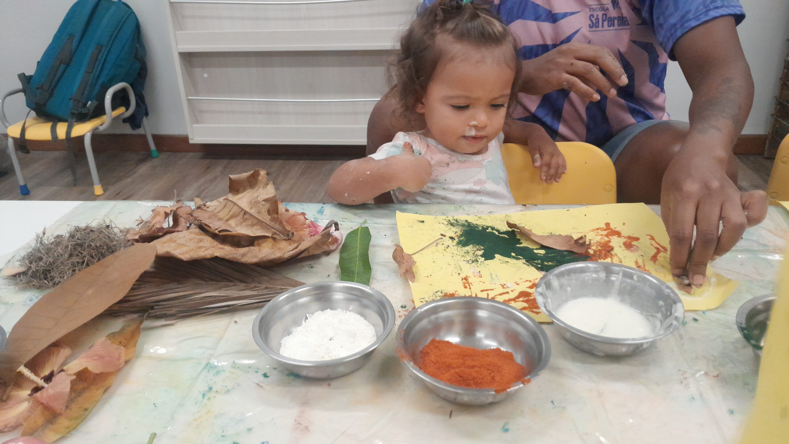 Experimentamos com o tato as texturas diferentes dos ingredientes: cacau, espirulina, açafrão, colorau e terra mate. Fizemos pinturas coletivas e individuais. Foi uma farra!