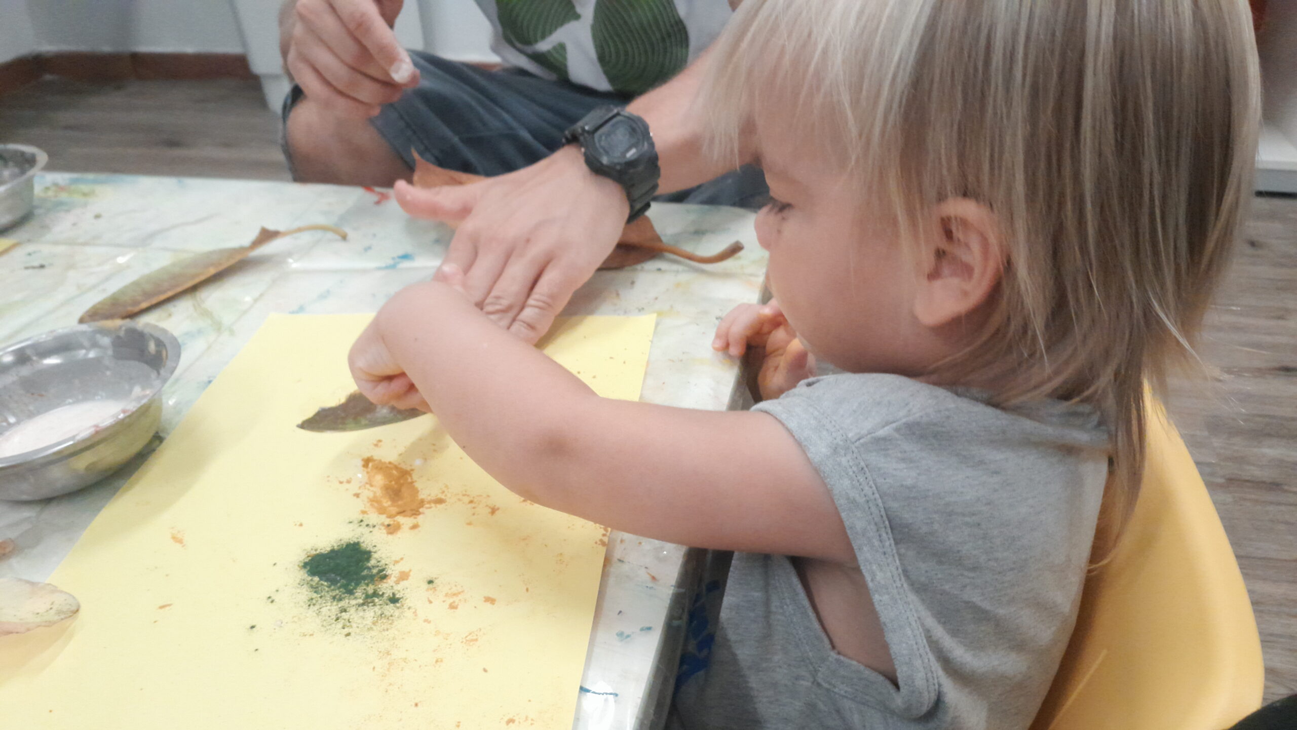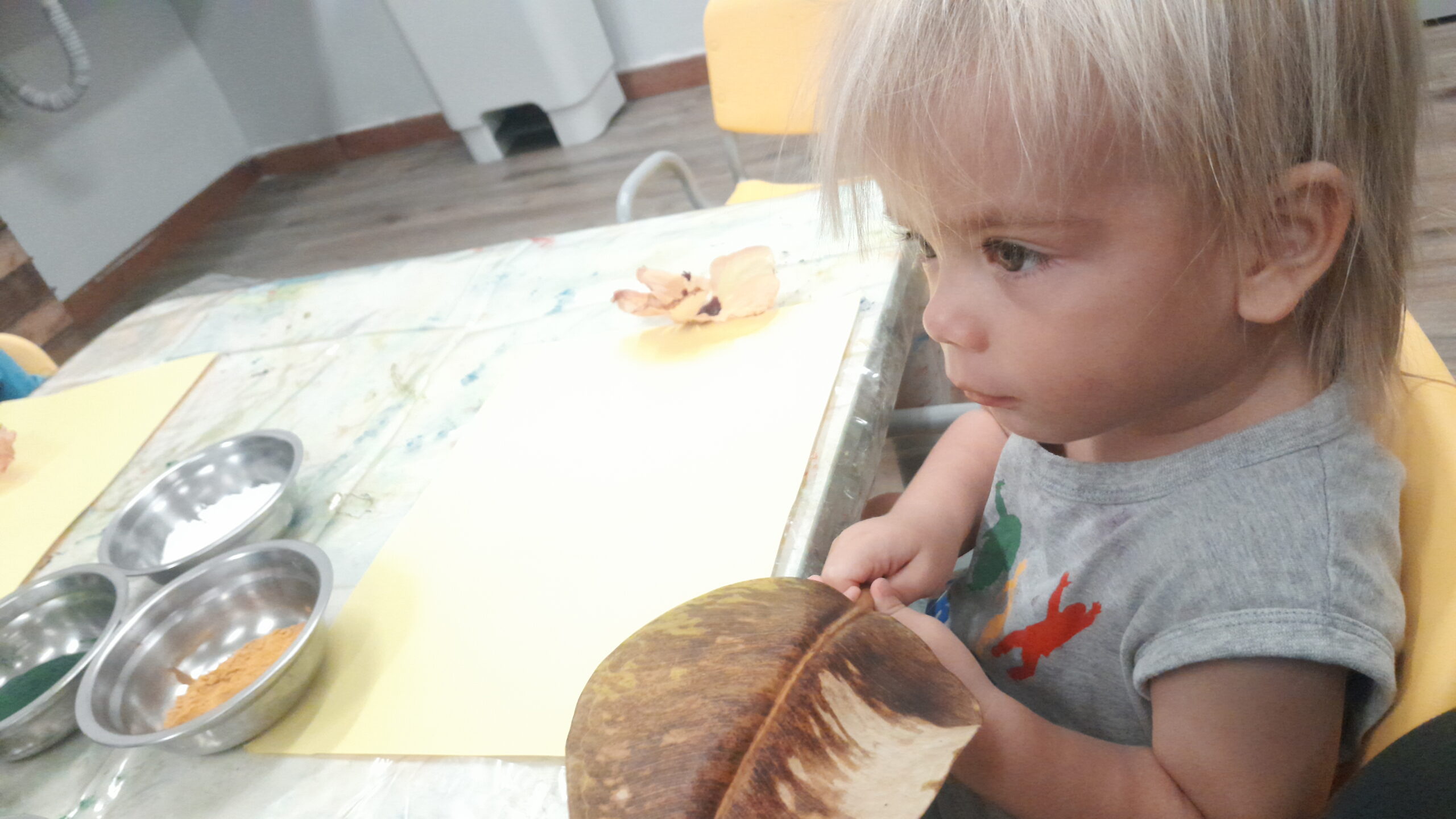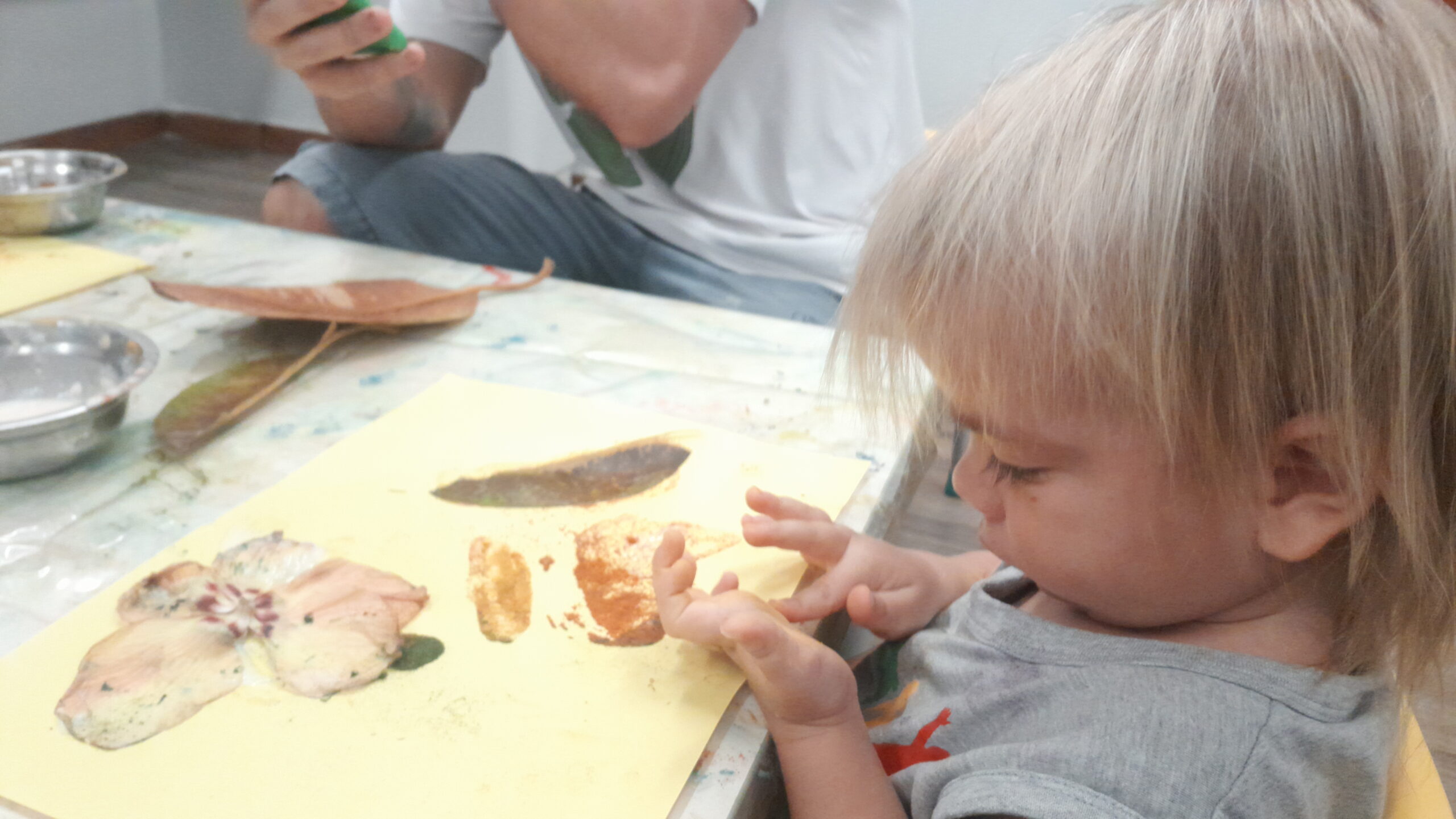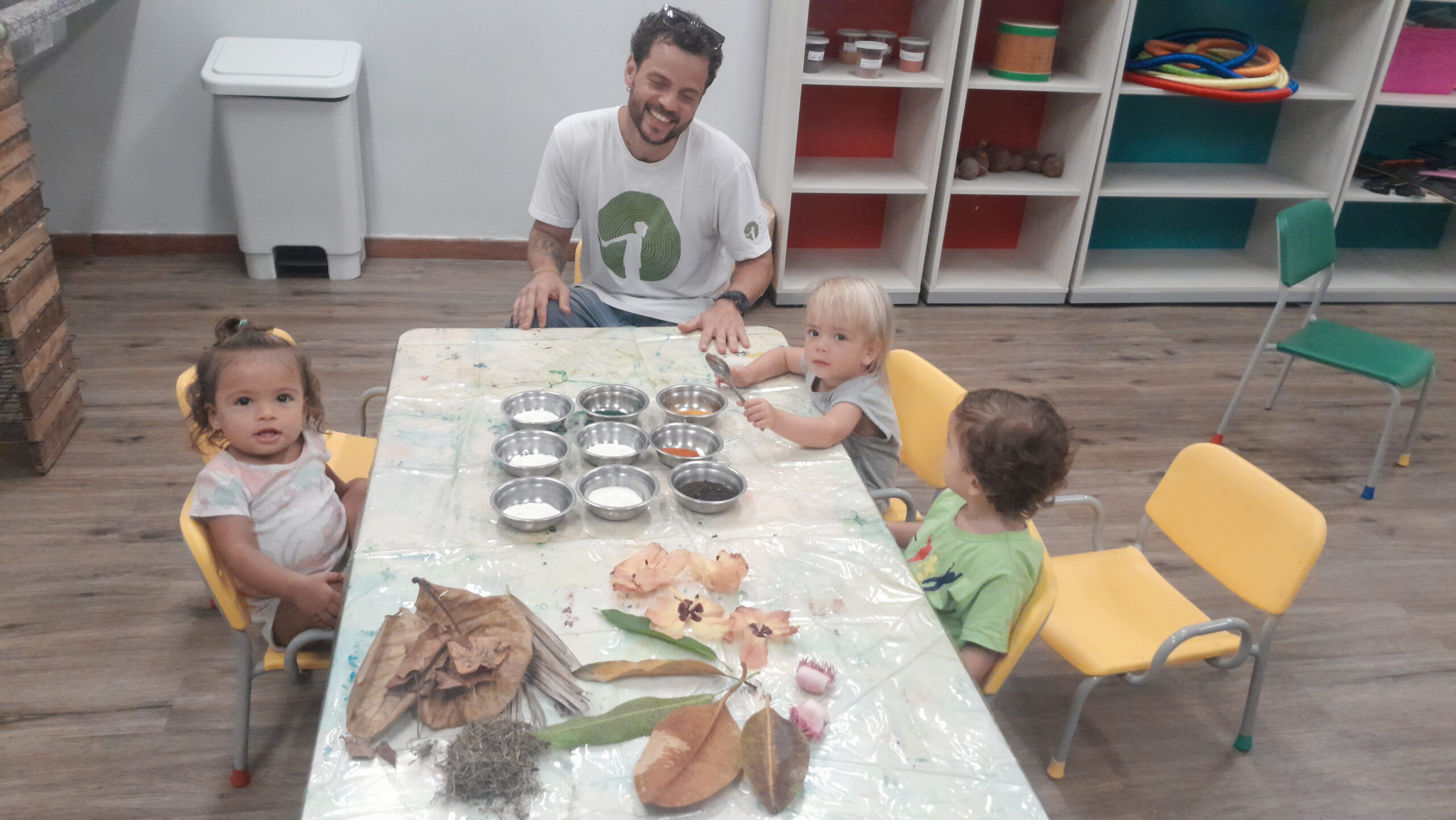 A Turma do Berçário participou de uma colagem diferente, misturamos farinha de trigo e água, com essa mistura produzimos um grude para colar elementos da natureza. Utilizamos: flores, folhas, colorau, cacau, beterraba, açafrão/curcuma, spirulina e chá mate. As crianças exploraram cada um desses elementos, junto com os professores do Moleque Mateiro.