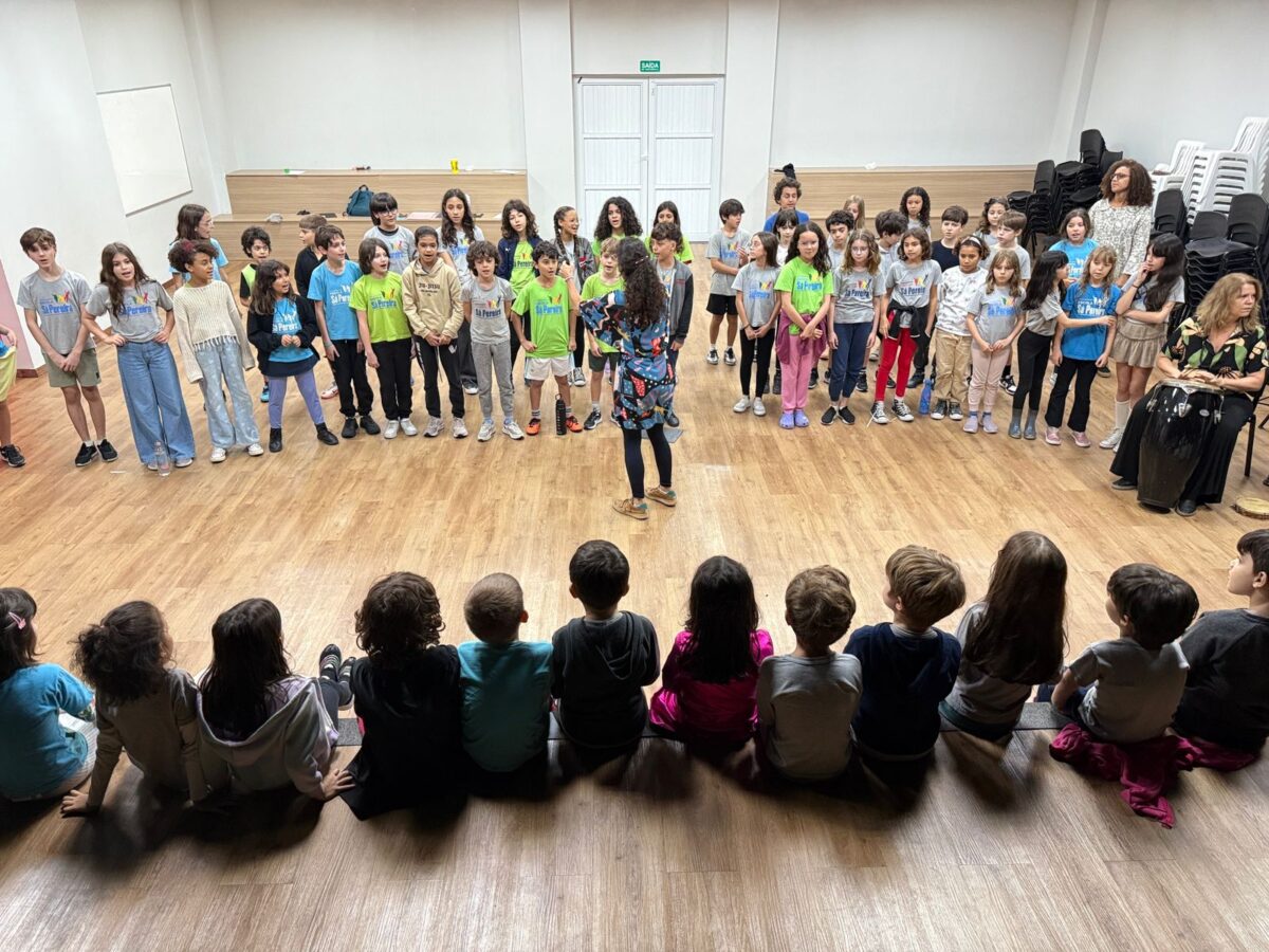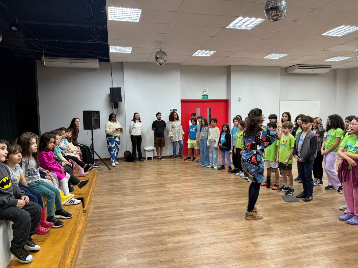Depois de um bate-papo animado e cheio de descobertas, o coral de F4 e F5 apresentou “Tataruê” e outras músicas do repertório para os pequenos, encerrando um momento de verdadeira troca entre as crianças, costurado por curiosidade, escuta e encantamento.