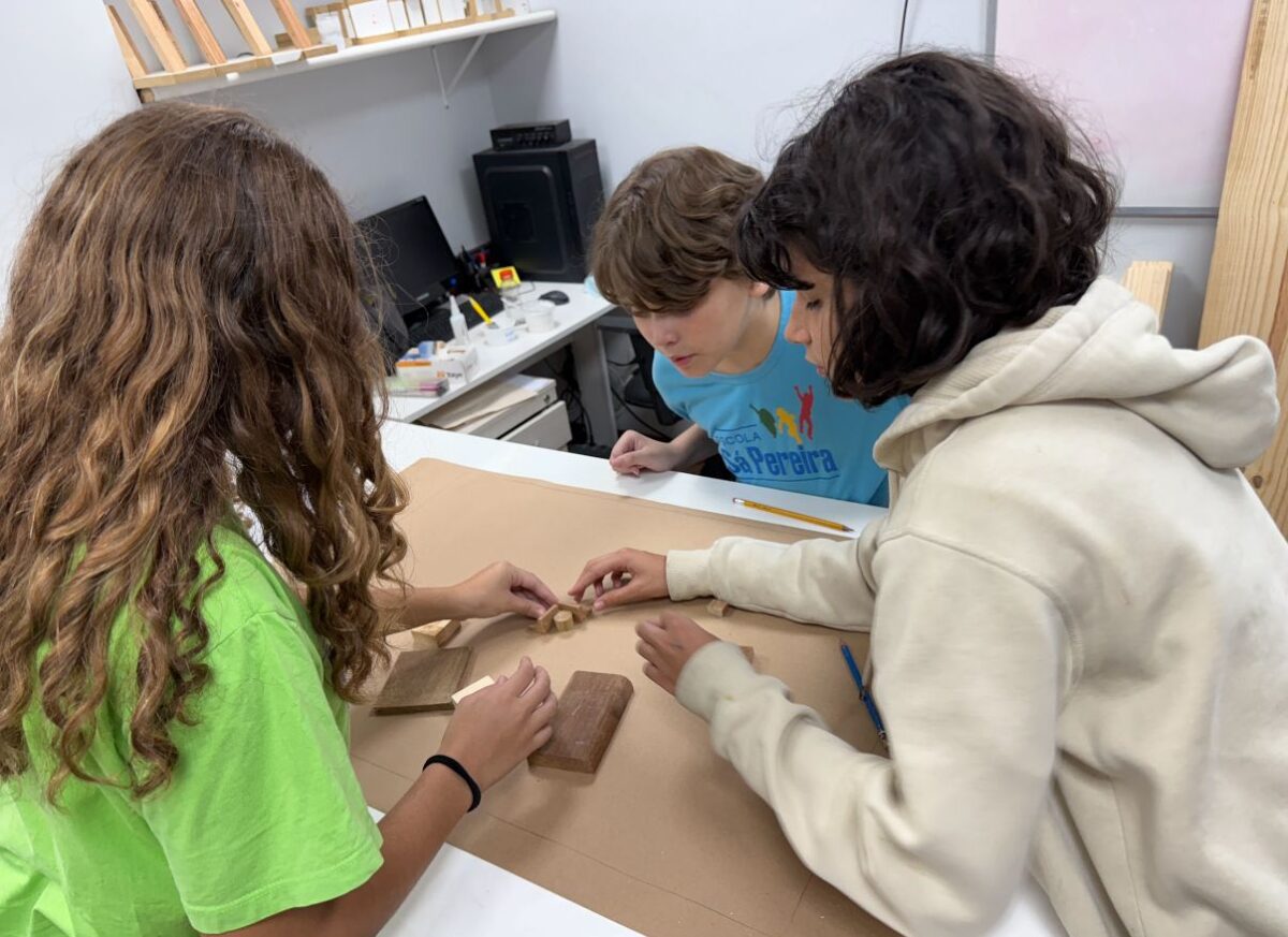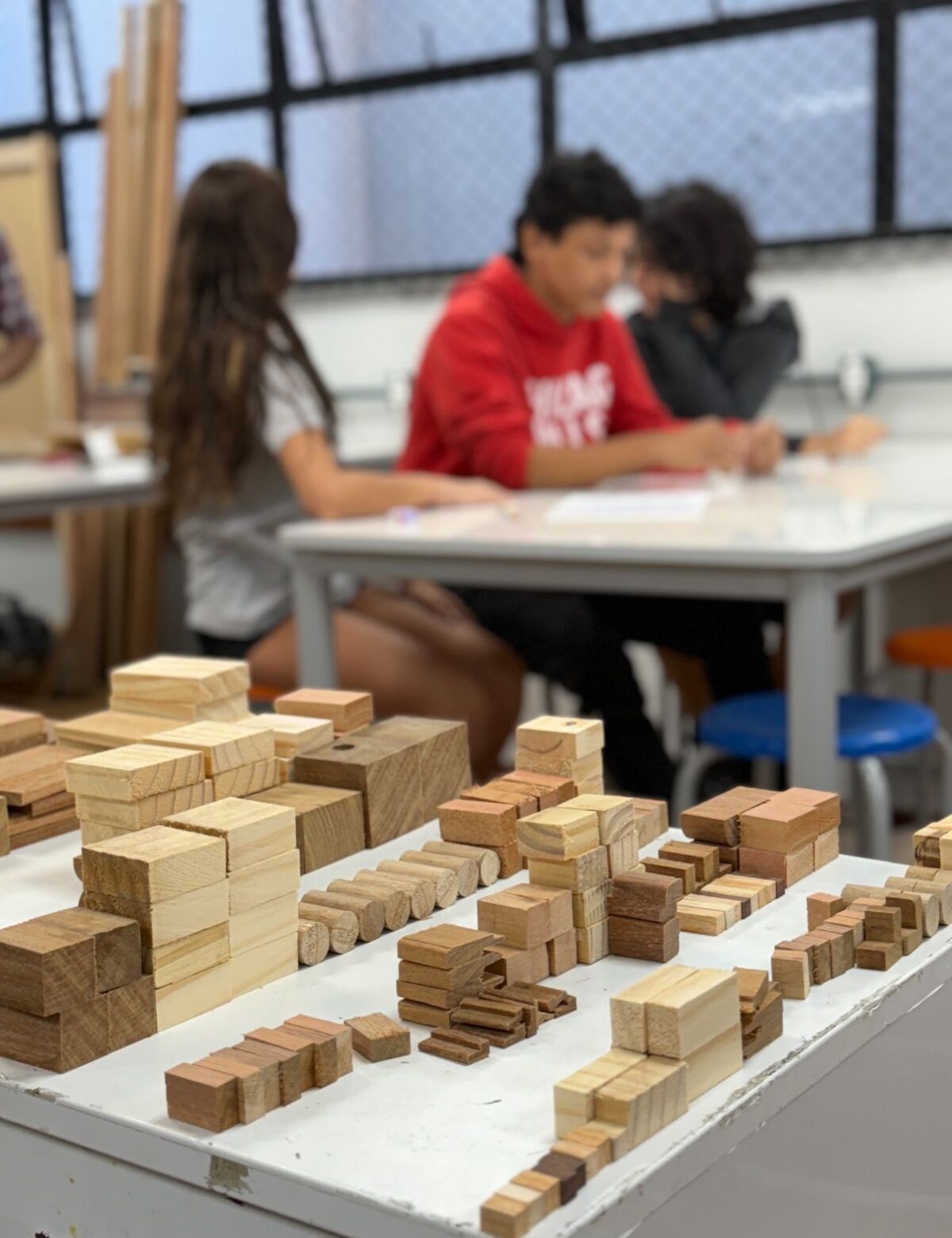 Inspirados por esse encontro, os alunos criaram oito obras autorais, resultado das reflexões e experiências vividas na exposição. Eles se dedicaram ao processo: foram até a oficina, cortaram madeiras, experimentaram composições e construíram seus próprios quadros.