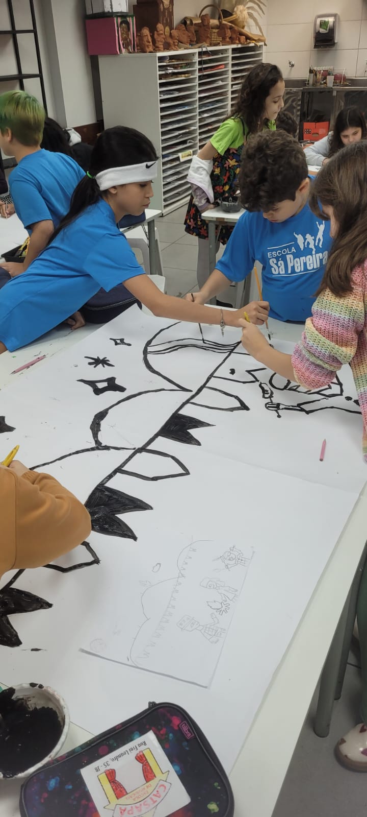 Já o quinto ano foi buscar inspiração em três artistas pernambucanos: J Borges, Gilvan Samico e Derlon. Depois de apreciarem alguns trabalhos dos artistas, os grupos escolheram suas temáticas, prepararam o rascunho com algumas ideias e partiram para a pintura. Os traços foram riscados com guache preto e trincha para se aproximarem da estética das xilogravuras e do grafite.