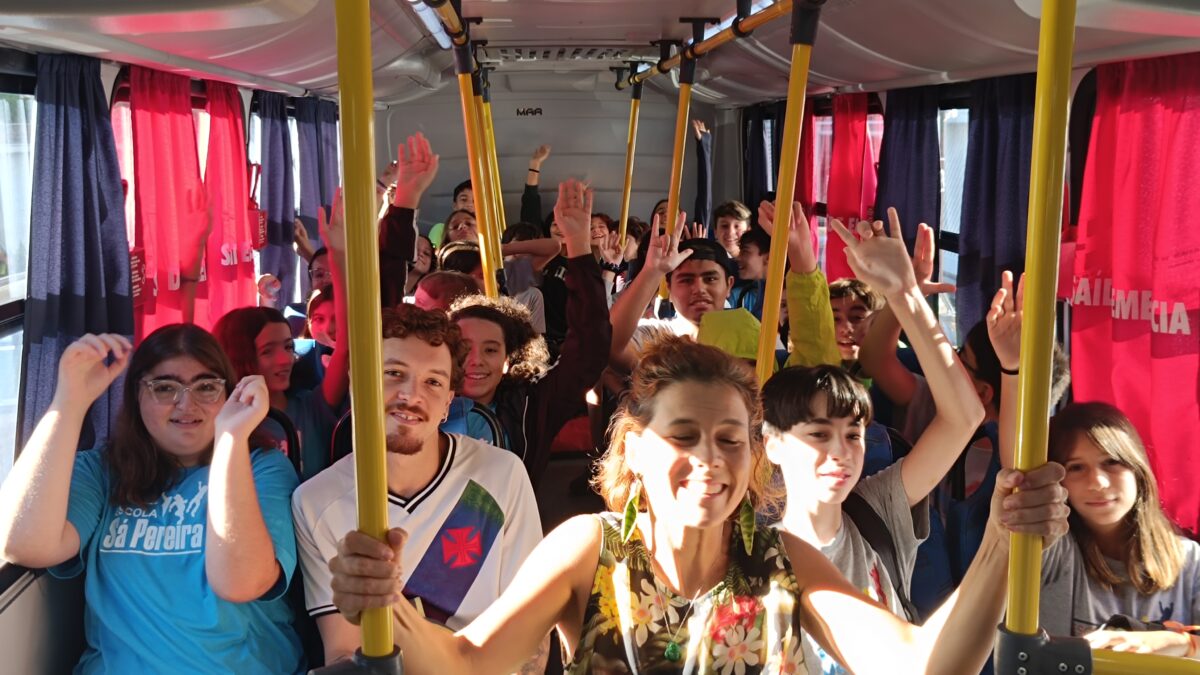 Mais do que uma celebração, o bloco é um disparador do nosso projeto de pesquisa. É ele que inaugura o tema do ano e coloca o corpo em ação como território de experiência, encontro e aprendizagem. Por isso, mais uma vez, realizamos o concurso de samba, convidando toda a comunidade escolar a compor, cantar e pensar junto. Entre os sambas inscritos, o escolhido foi “Um passo à frente”, de Carlos Fernando M. Silva e Moyses J. Cohen, tornando-se trilha, linguagem e pergunta.